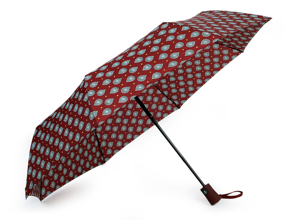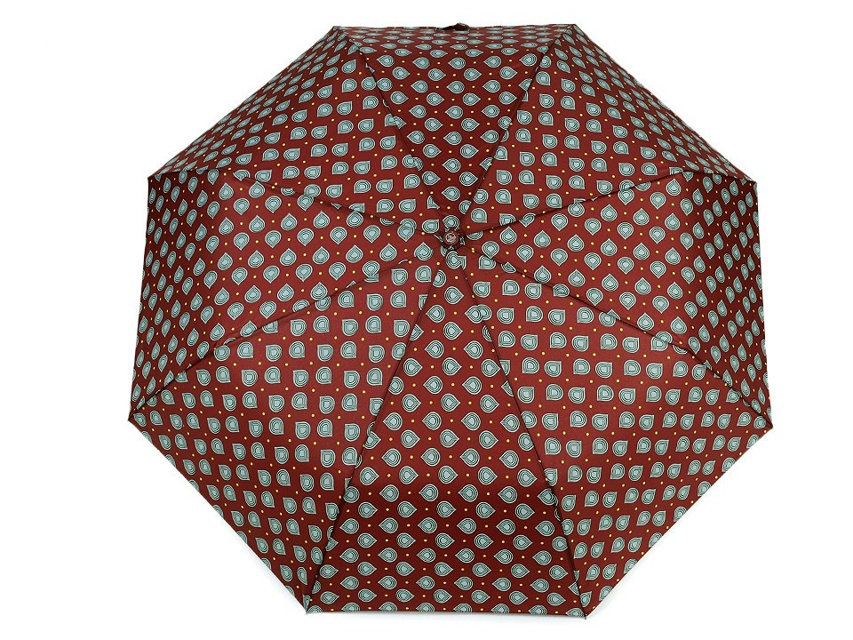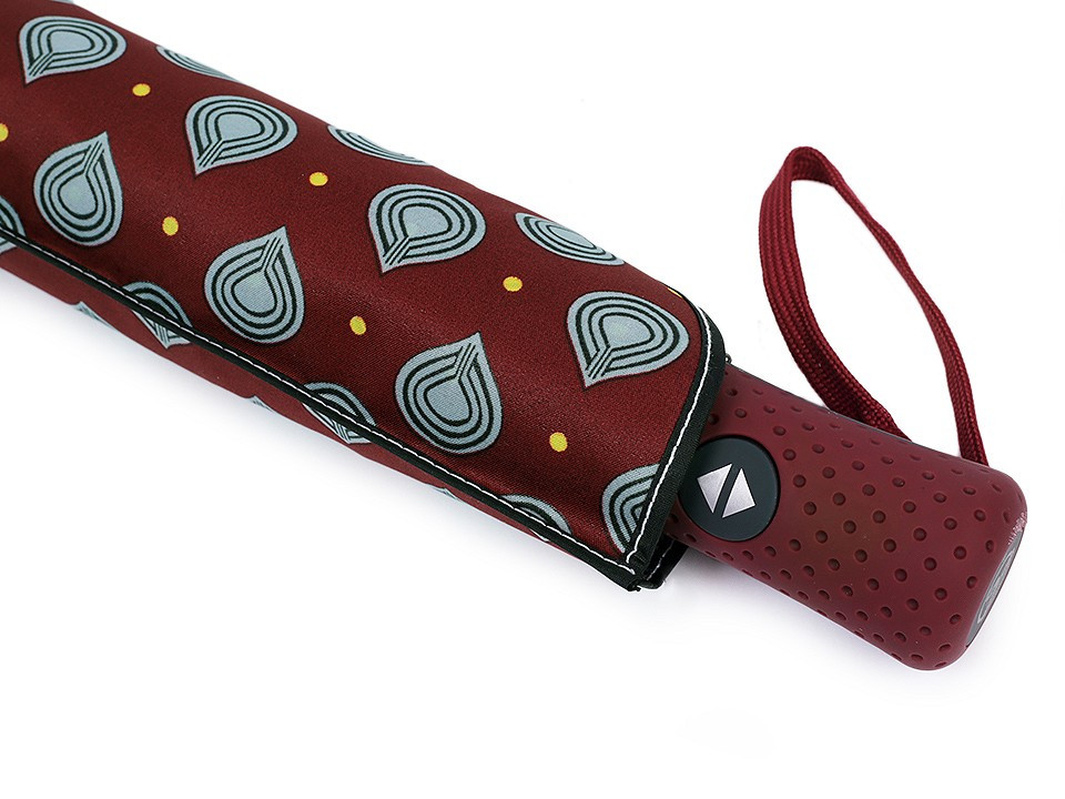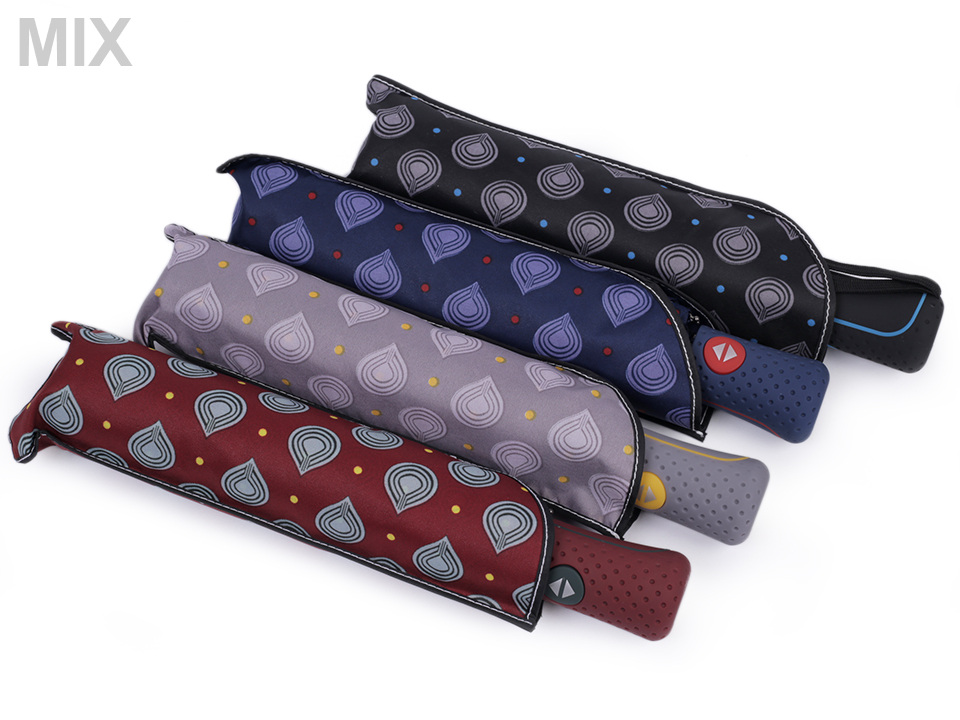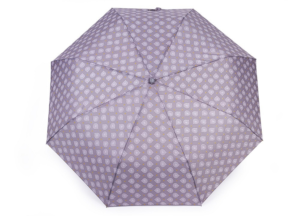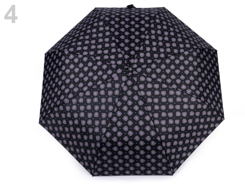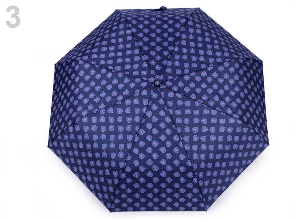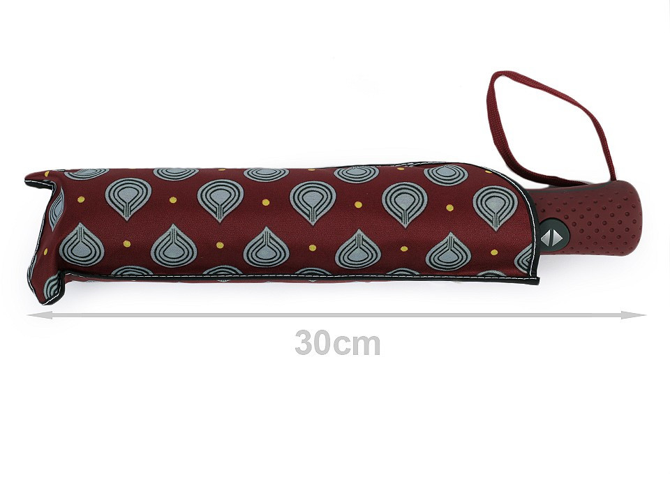 Dámský skládací deštník s potiskem kapek a puntíků má plně automatický vystřelovací/sestřelovací mechanismus. Deštník se rozevře i zavře stisknutím tlačítka se šipkou nahoru nebo dolů.