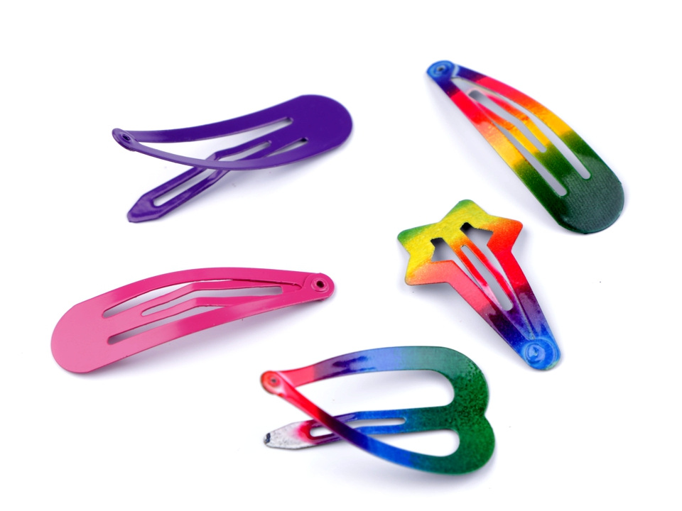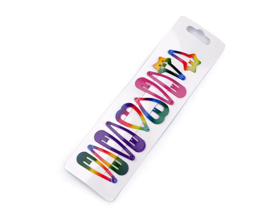 Sada sponek pukaček s duhovým potiskem. Pukačky mají velikou výhodu, ve vlasech dobře drží a přitom netlačí. Sponky jsou vyrobené z kvalitního materiálu, který dlouho drží svůj tvar, funkčnost i barvy.
