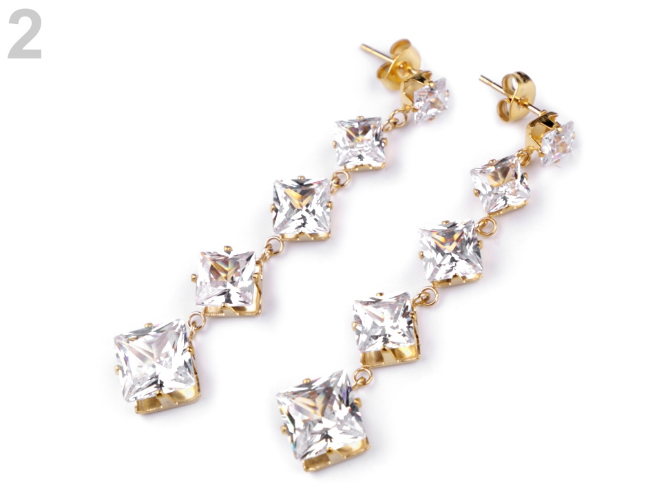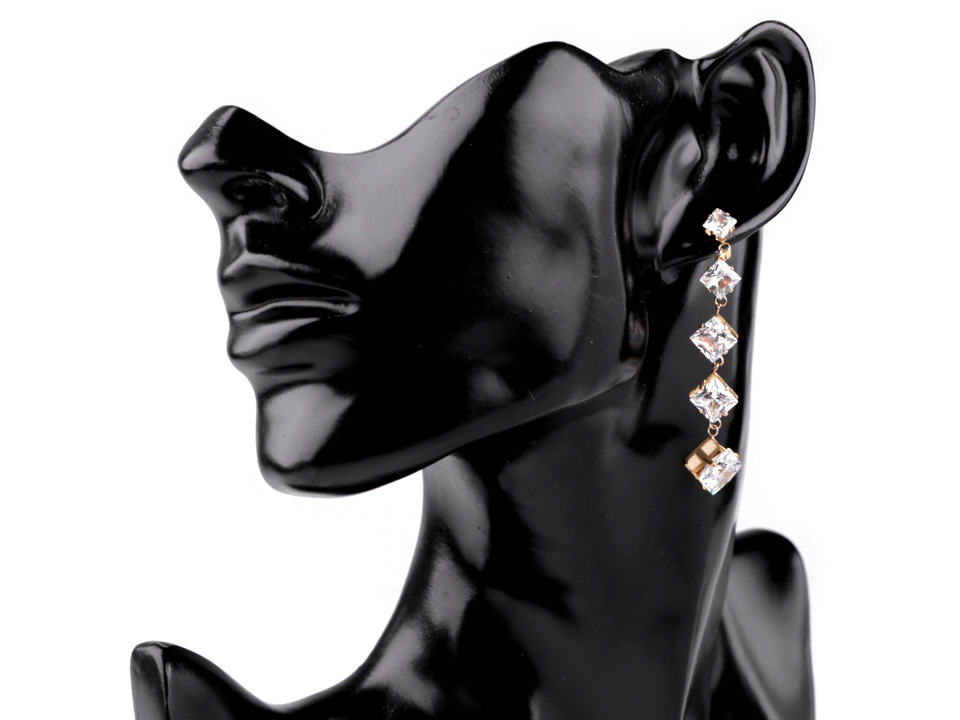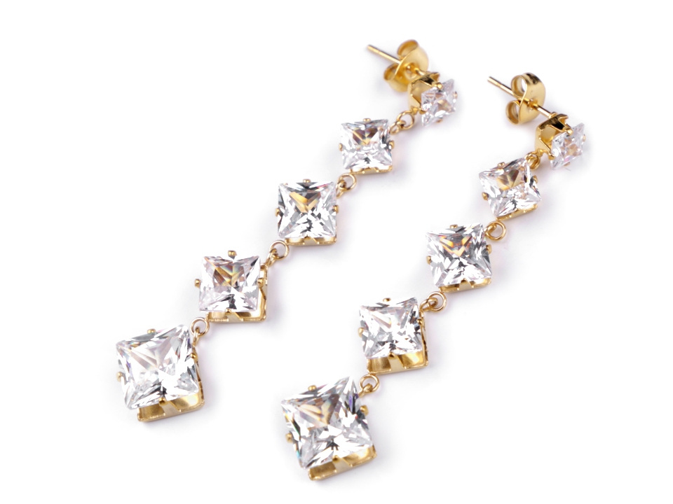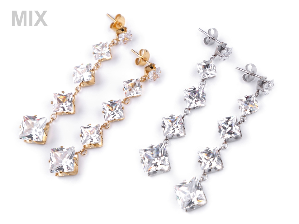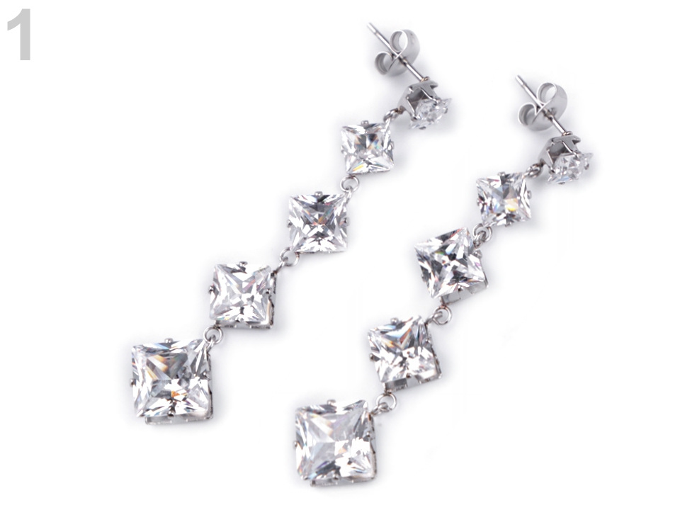 Dlouhé visací náušnice z nerezové oceli, s broušenými kameny, působí luxusním dojmem. Hodí se na společenské události jako jsou plesy, návštěvy divadel apod. Jsou vhodné pro ženy všech věkových kategorií. Doporučujeme je i pro nevěsty nebo družičky. Kovová lůžka jsou osázená broušenými kameny, které způsobují oslnivý třpyt. Jednotlivá lůžka jsou propojená očky, díky nich jsou náušnice pohyblivé. Jsou puzetového typu se zarážkou proti vypadnutí.