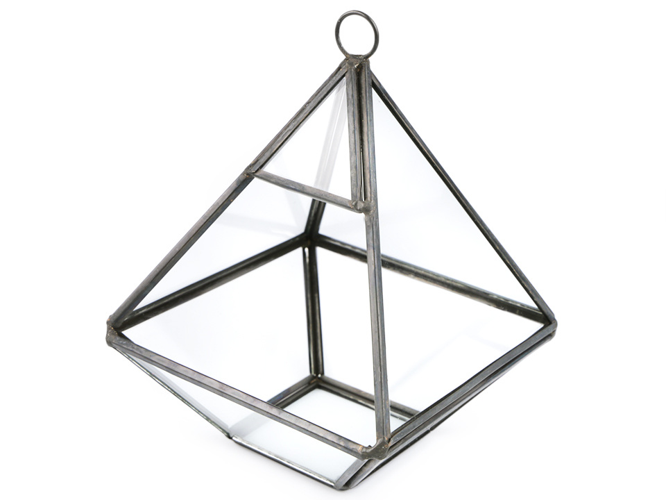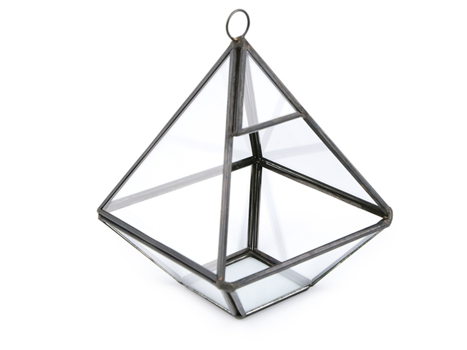 Skleněné aerárium má tvar jehlanu. Stylově doladí jakýkoli interiér. Dovnitř aerária můžete naaranžovat umělé či živé sukulenty, masožravky nebo kaktusy, které nejsou náročné na vodu. V horní části je očko, do kterého můžete provléknout provázek a aerárium tak pověsit na trám nebo na háček na stěně.