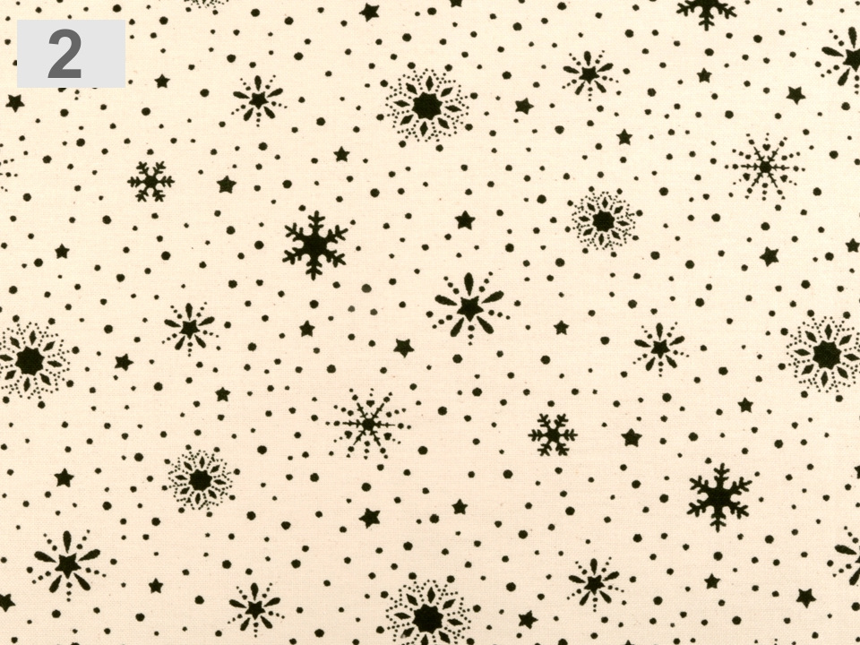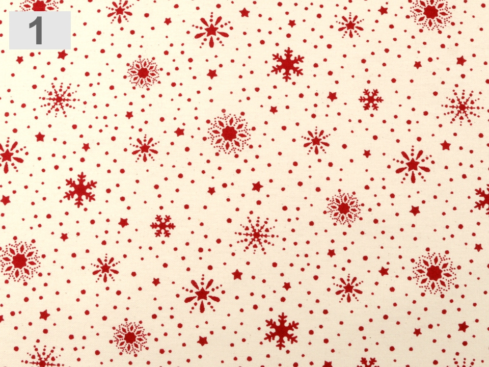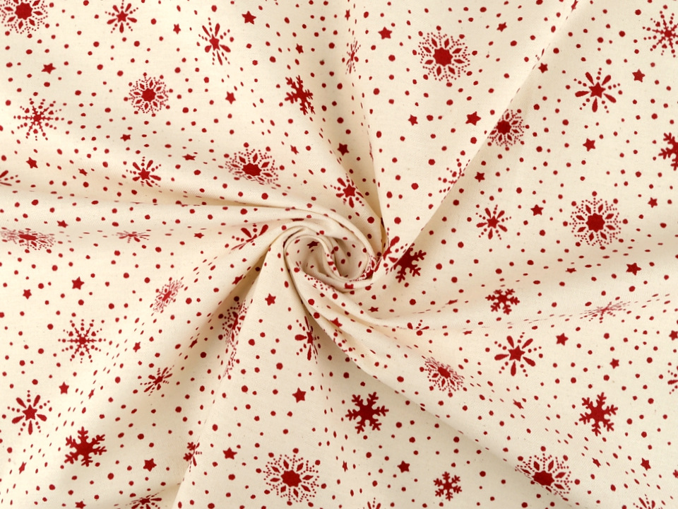 Bavlněná látka vyniká vyšší gramáží. Zdobí ji potisk vloček.