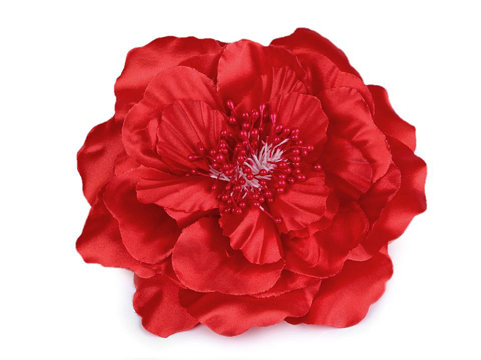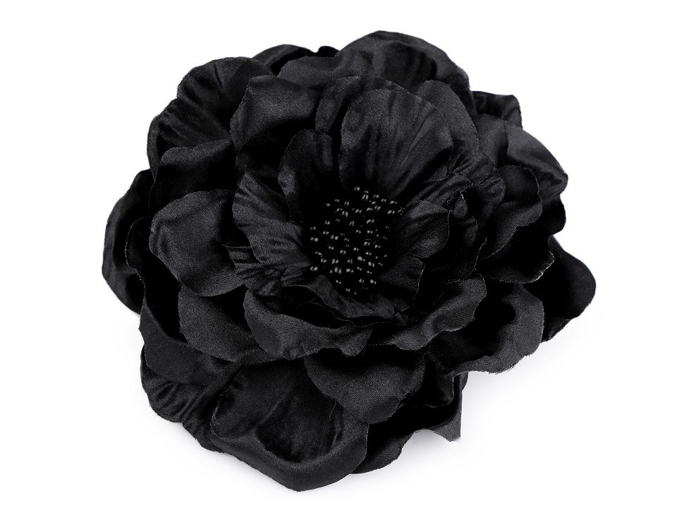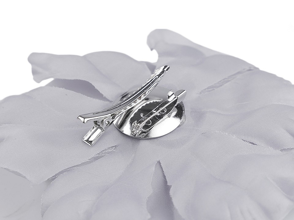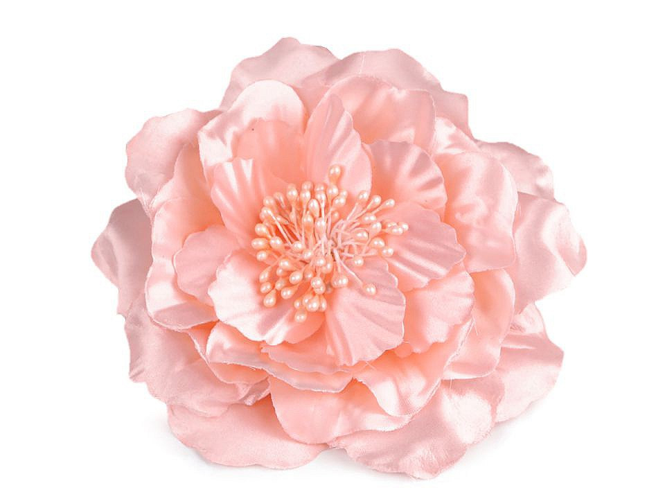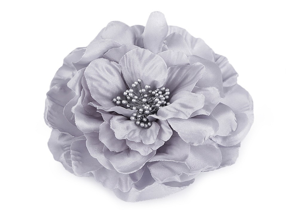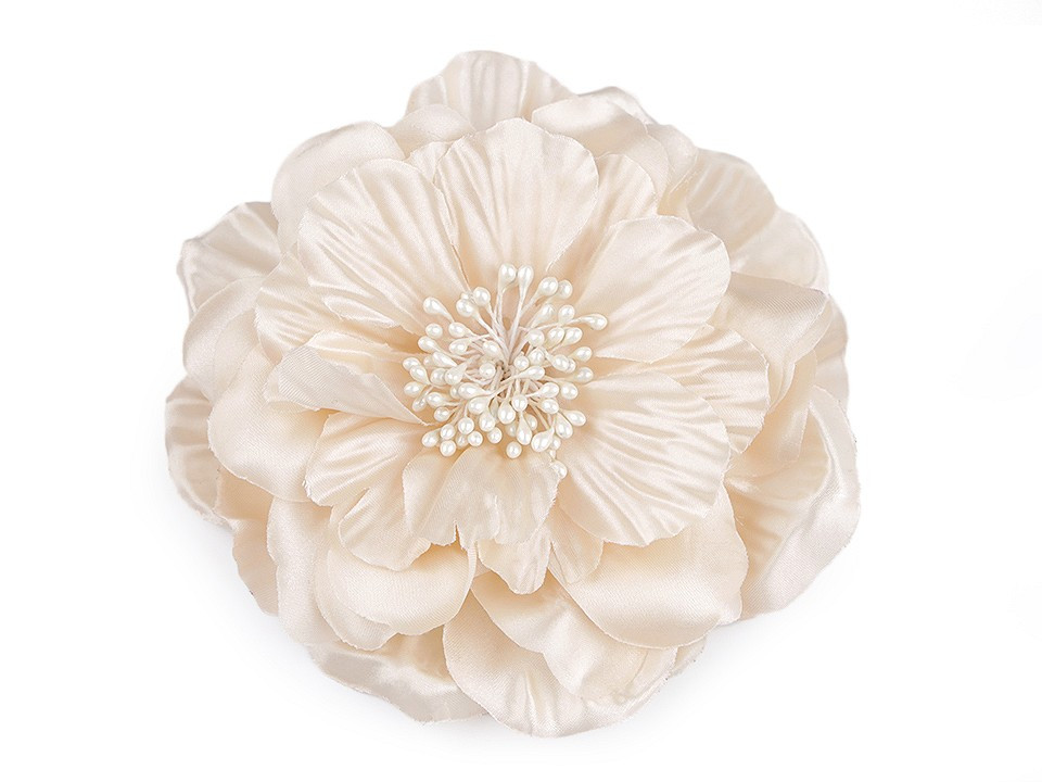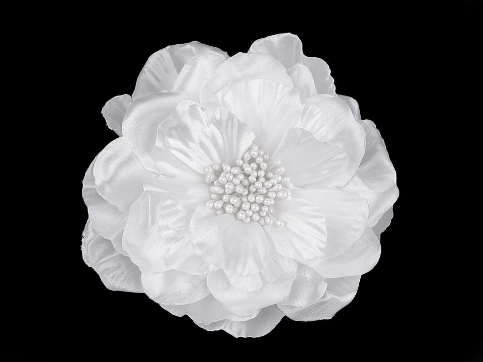 Velký saténový květ s perleťovým leskem potěší všechny romanticky založené ženy a dívky. Díky bohatým okvětním plátkům působí nadýchaným dojmem. Jeho střed zdobí malé pestíky. Ve spodní části má spínací špendlík a klips, takže jej můžete připevnit jak na oděv, tak do vlasů. Květ využijete jako ozdobu na šaty, halenku, sako nebo kabelku.