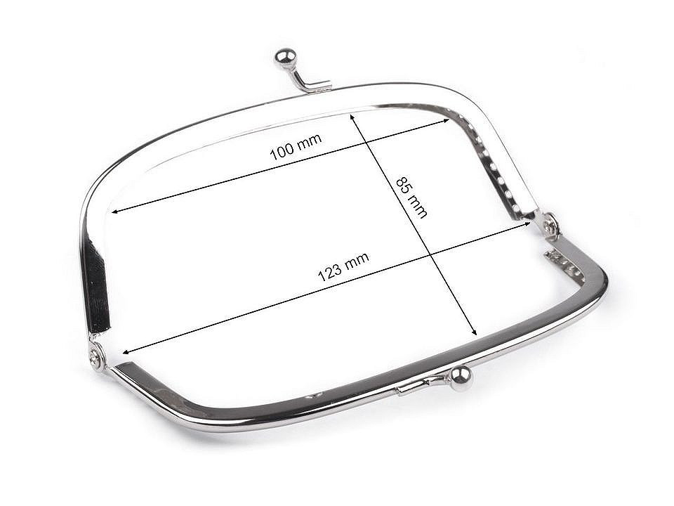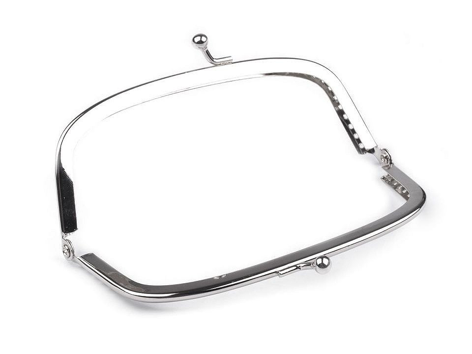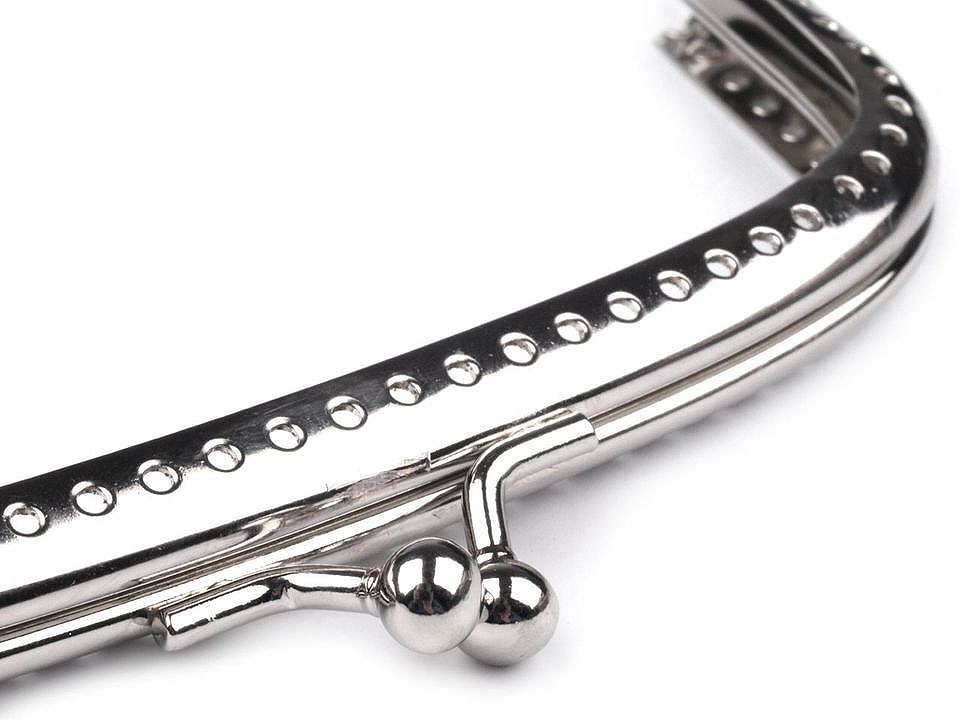 Rámeček se zapínáním na peněženky. Jde o našívací typ rámečku, kdy se látka dovnitř vloží a ručně přešije přes dírky na rámečku. Dírky jsou jen na vnější straně rámečku.