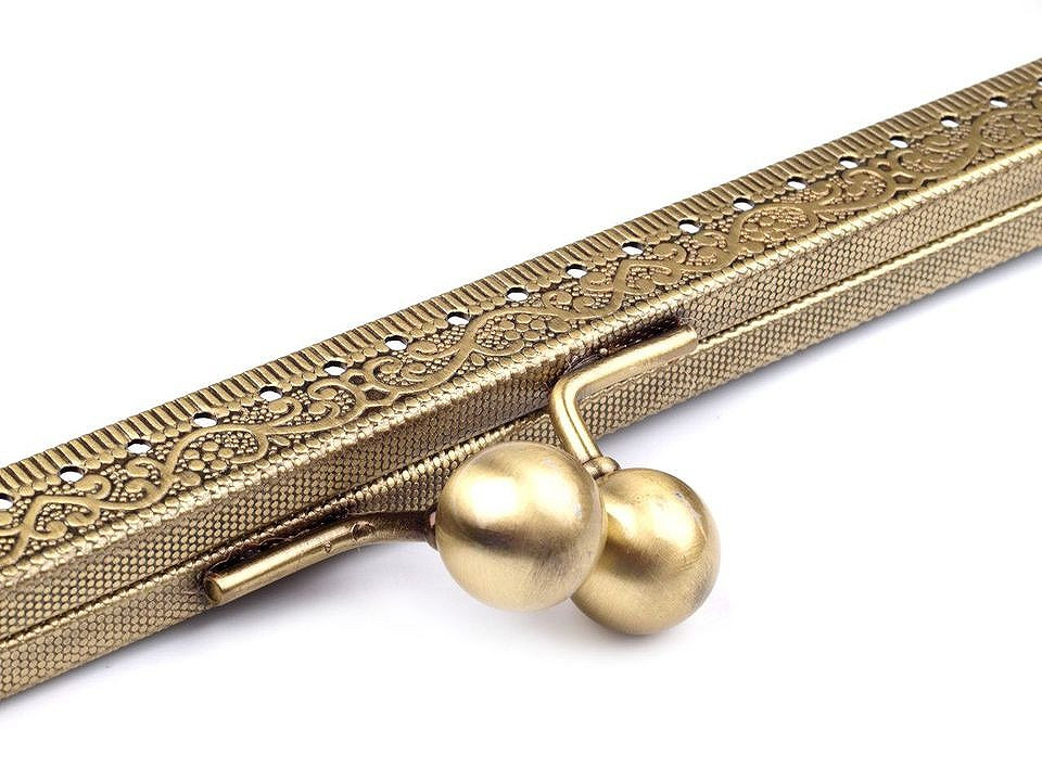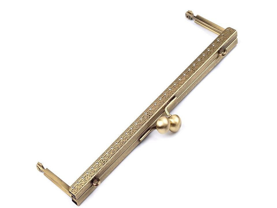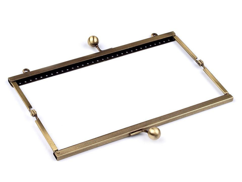 Kovový rámeček v barvě mosaz se zapínáním pro výrobu kabelky. Roměry rámečku vnitřní 10,5 x 19 cm, vnější 12 x 20 cm, tloušťka 0,5 cm. Rozměr 6,5 x 20 cm je rozměr vnější a znamená 6,5 cm výška a 20 cm délka rámečku. Zapínání má nahoře úchyty na ucha. Kovový rámeček je určený pro našití kabelky nebo látky. Proto má na horní kontrukci dírky, jejichž rozpětí je 6 mm. Tento typ zapínání využijete určitě na jakýkoliv typ kabelky, ať už společenské nebo určené ke všednímu nošení.Složení: mosaz