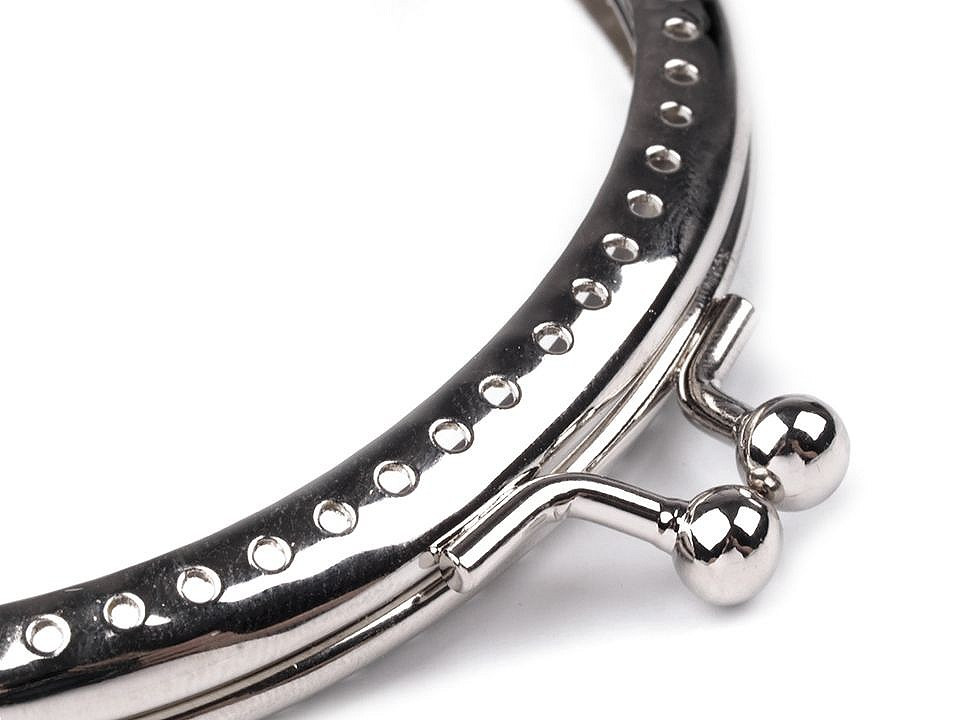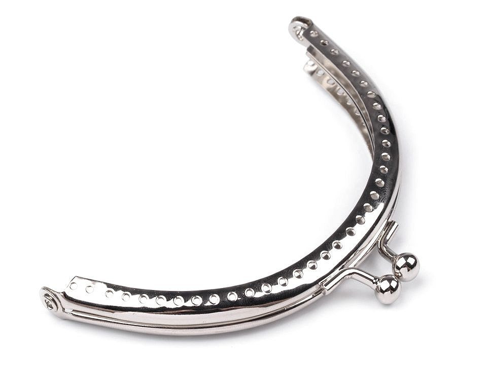 Rámeček na výrobu kabelek a tašek se zapínáním. Vnitřní rozměry rozvoru rámečku jsou 10 x 8,7 cm, vnější 10,3 x 12 cm. Rozměr 6x10,3cm znamená 6cm výšku zavřeného rámečku a 10,3 cm je délka rámečku. Vnitřní žlábky slouží k vložení látky, otvory se prošijí nití. Využijte tohoto zajímavého okrasného řešení a všijte dírkami i korálky.Složení: kov