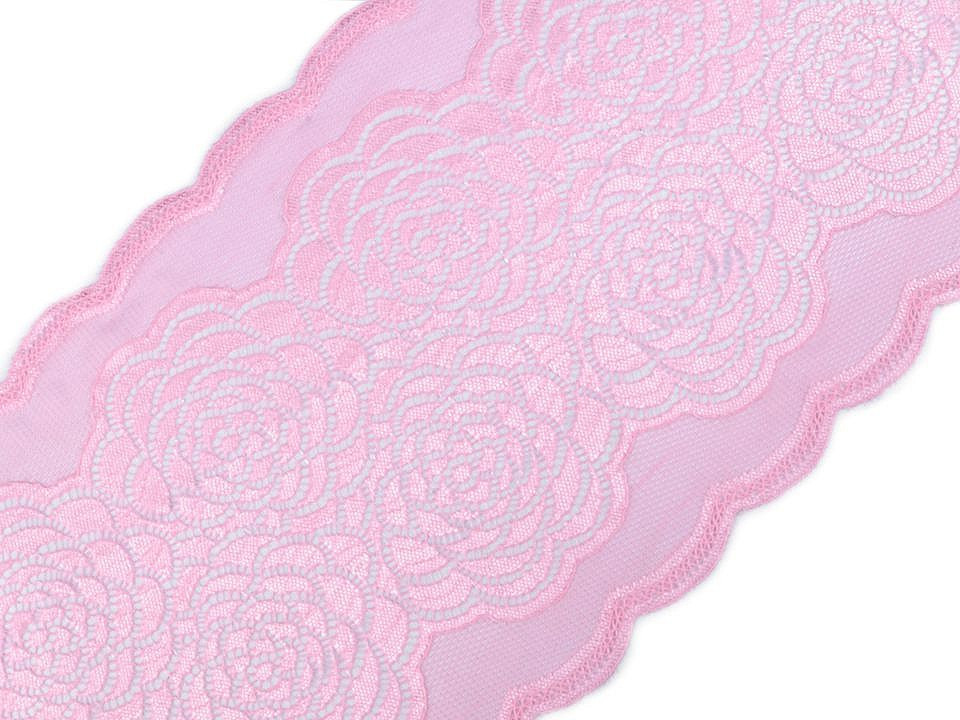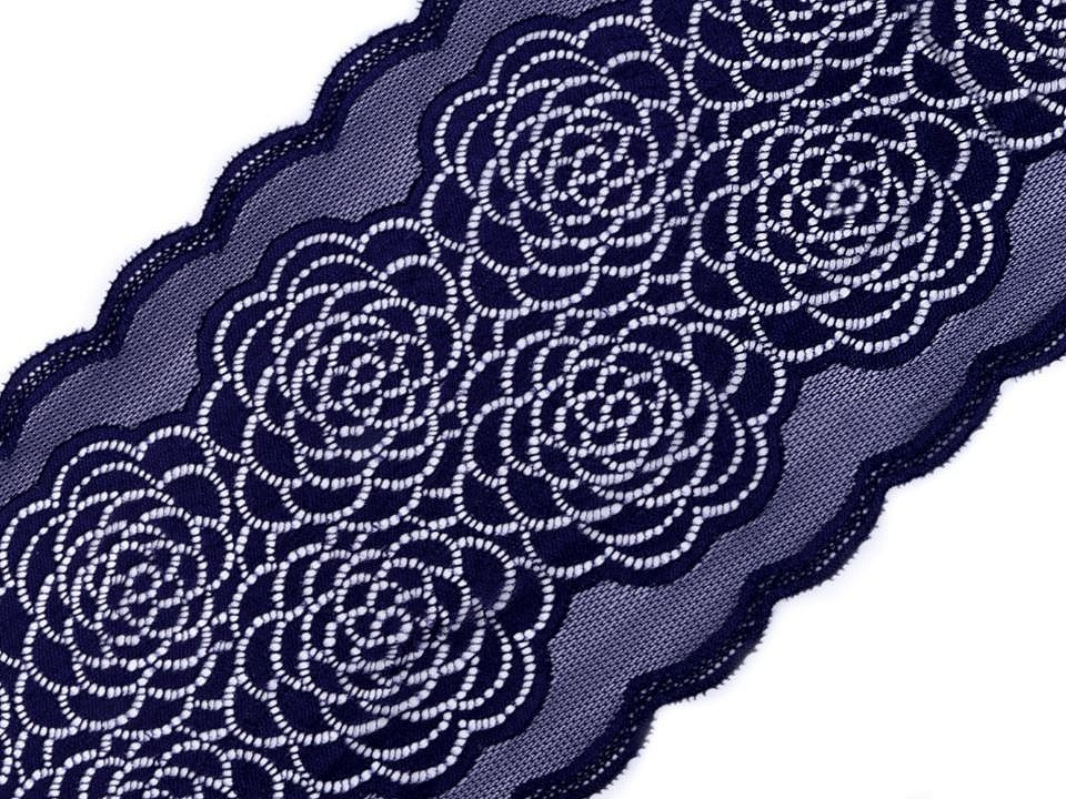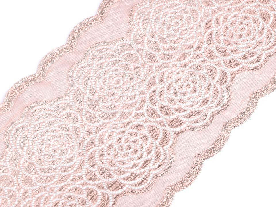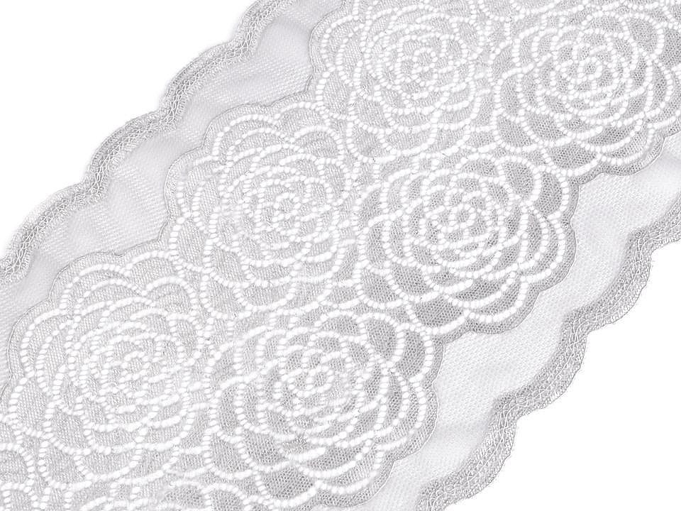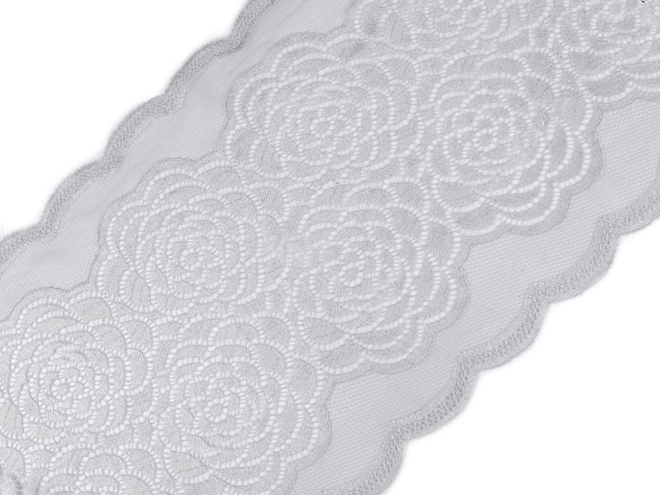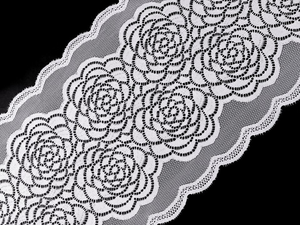 Širokou pružnou krajku zdobí uprostřed květovaný motiv.