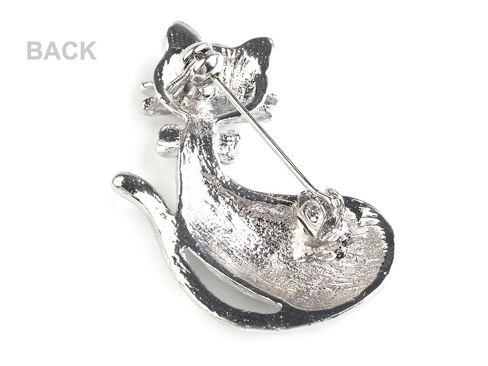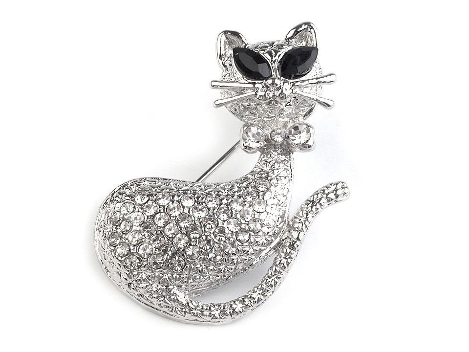 Velmi nápadná brož tvaru kočky vynikne na každém oděvu. Tělo kočky je opatřeno drobnými kamínky ze skla.