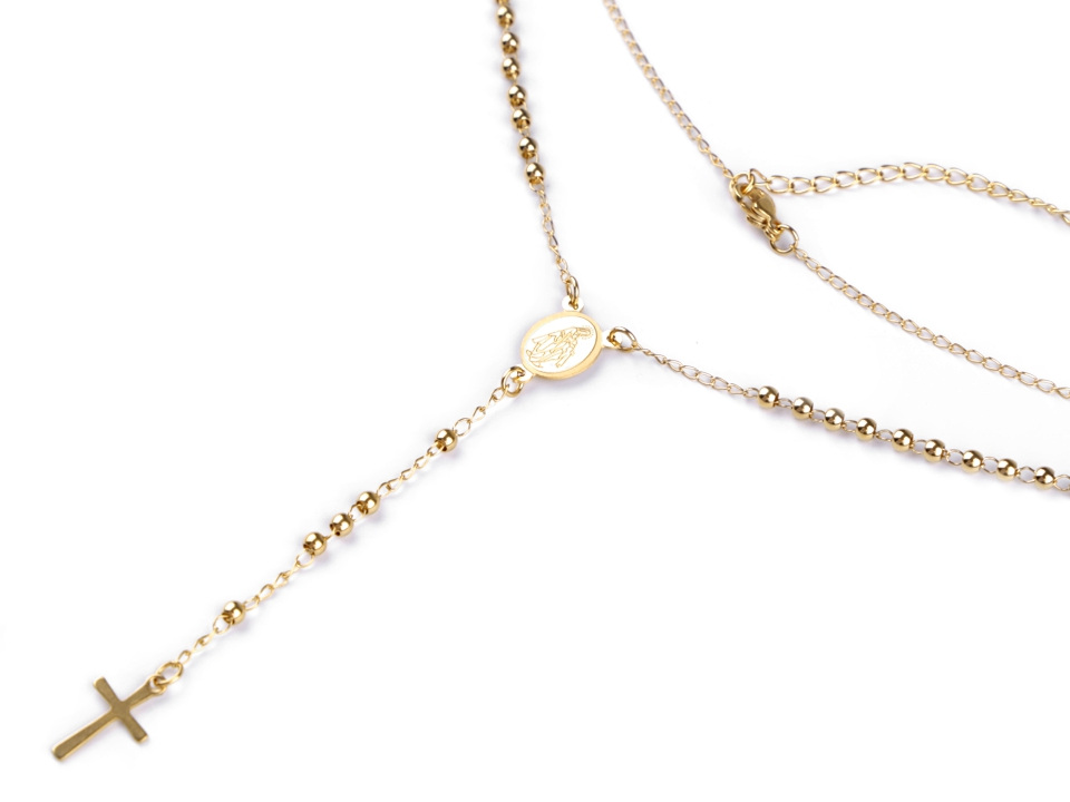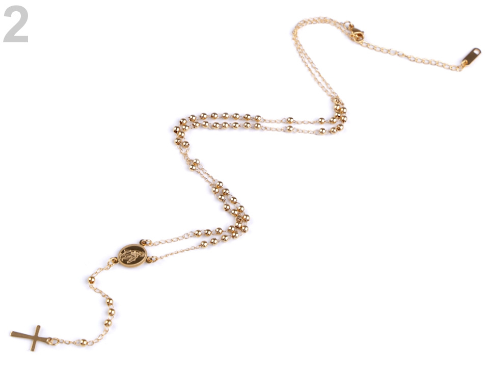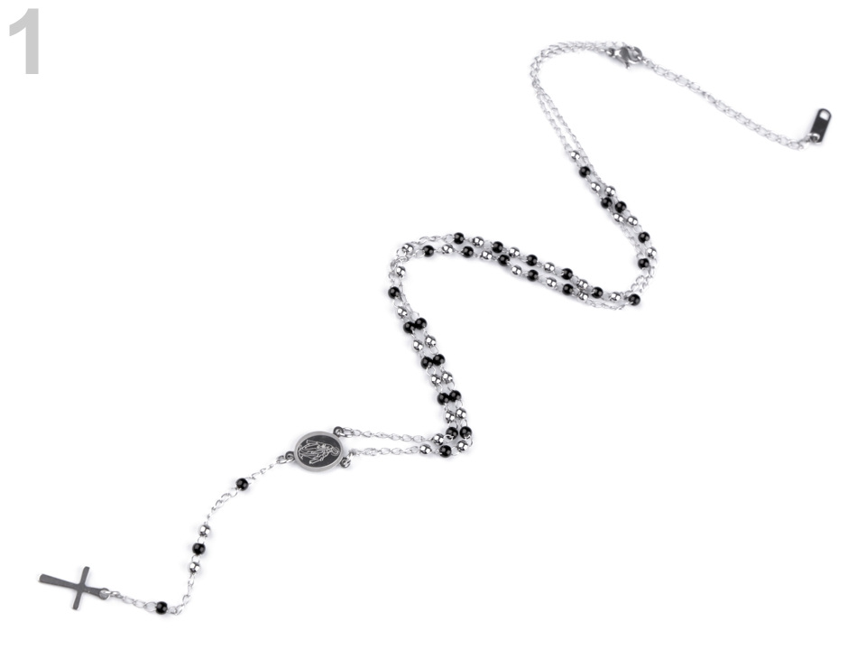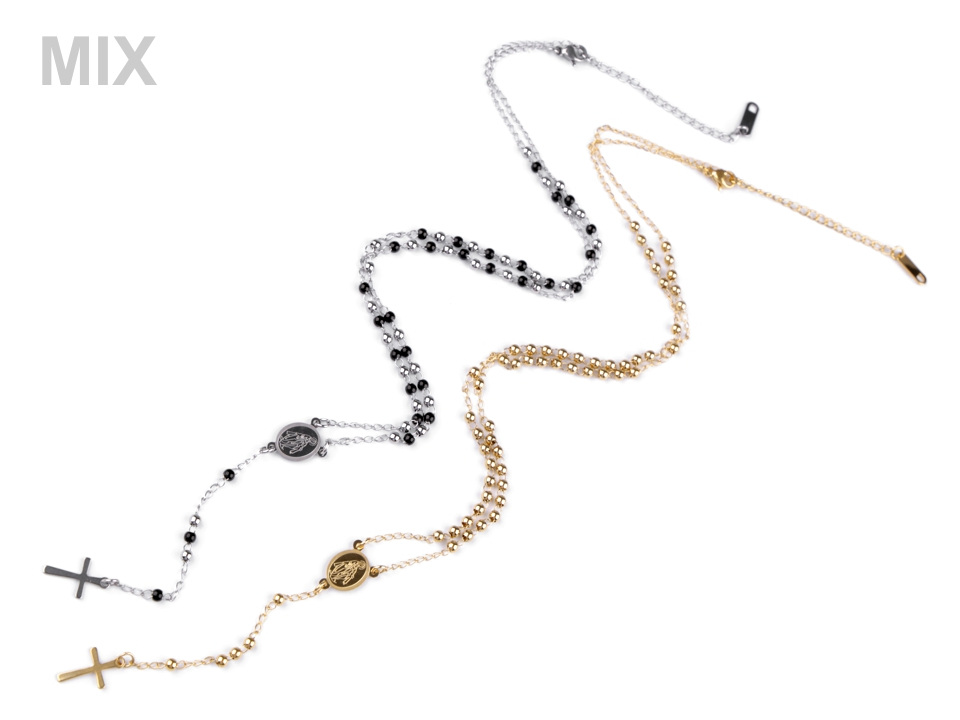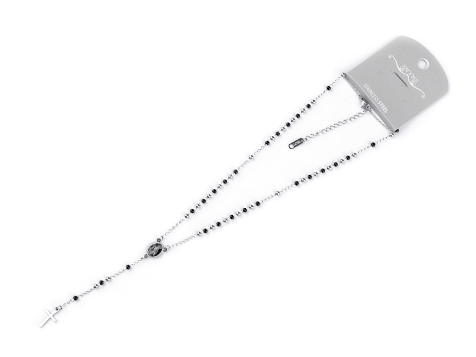 Růženec z nerezové oceli s drobnými korálky je velmi jemný. Dole je přívěsek s rytinou Madony a křížek.