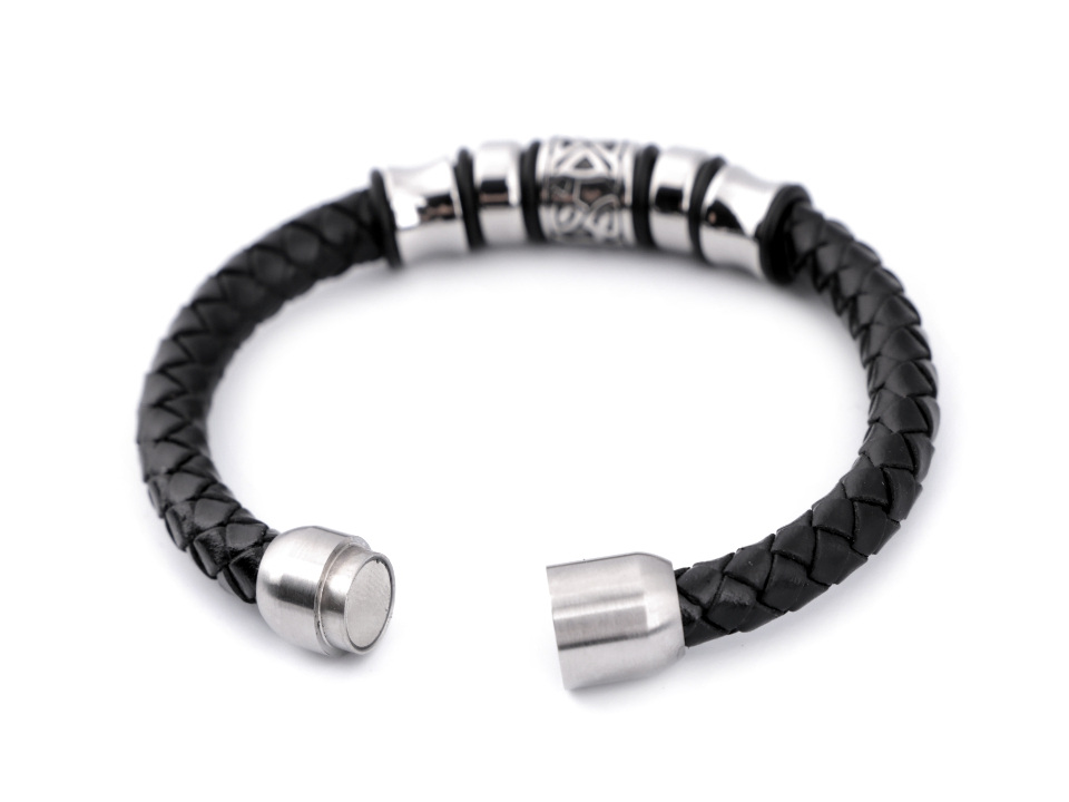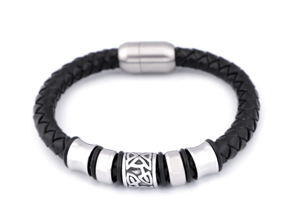 Kovové korálky jsou navlečené na pevnou spletenou šňůru z pravé kůže. Prostřední korálek je ozdobený rytinou s keltským motivem.