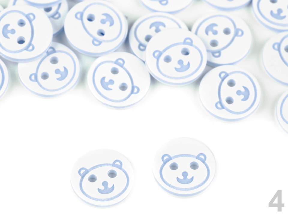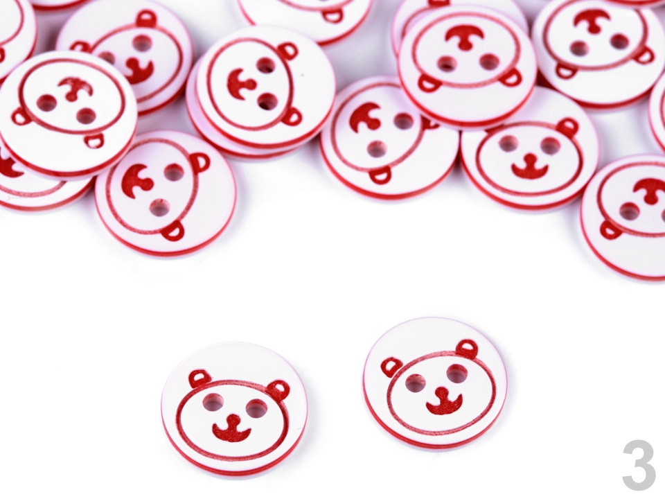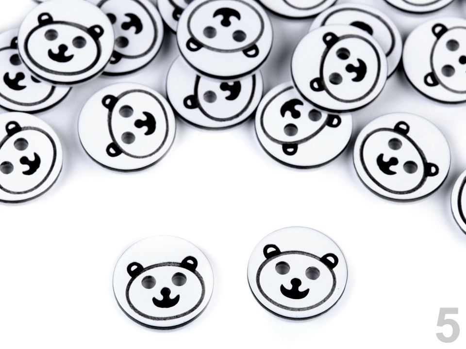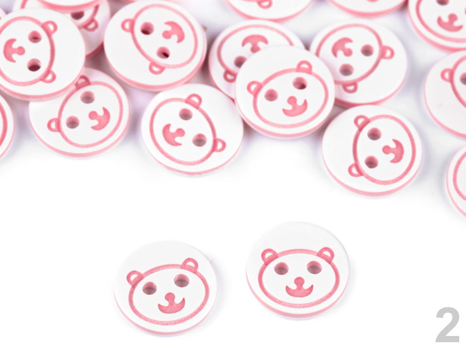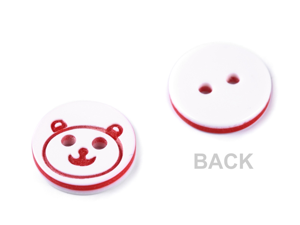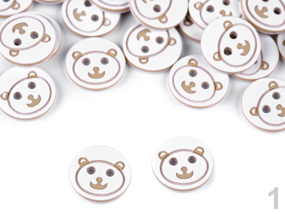 Dvoudírkové knoflíky zdobí gravírovaný motiv medvídka. Ozdobíte s nimi dětské oblečení i doplňky.