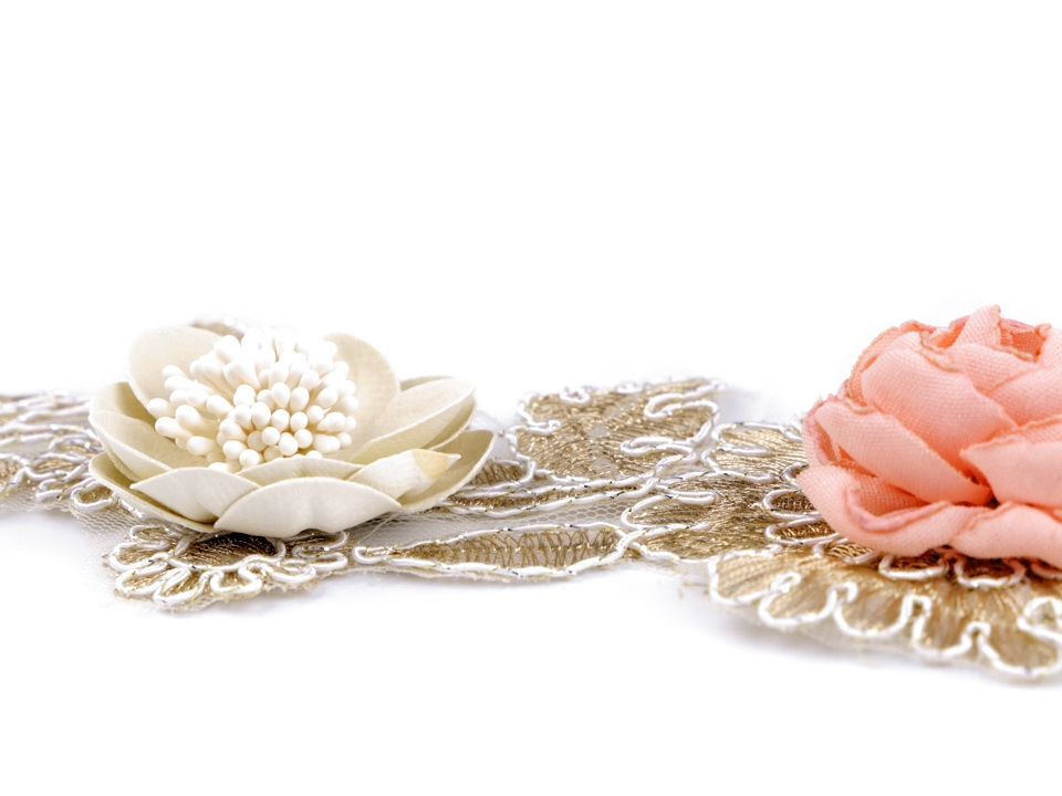 Monofilovou vsadku s 3D efektem zdobí květy. Lesklý lurex na jejím podkladu jí dodává slavnostní vzhled.