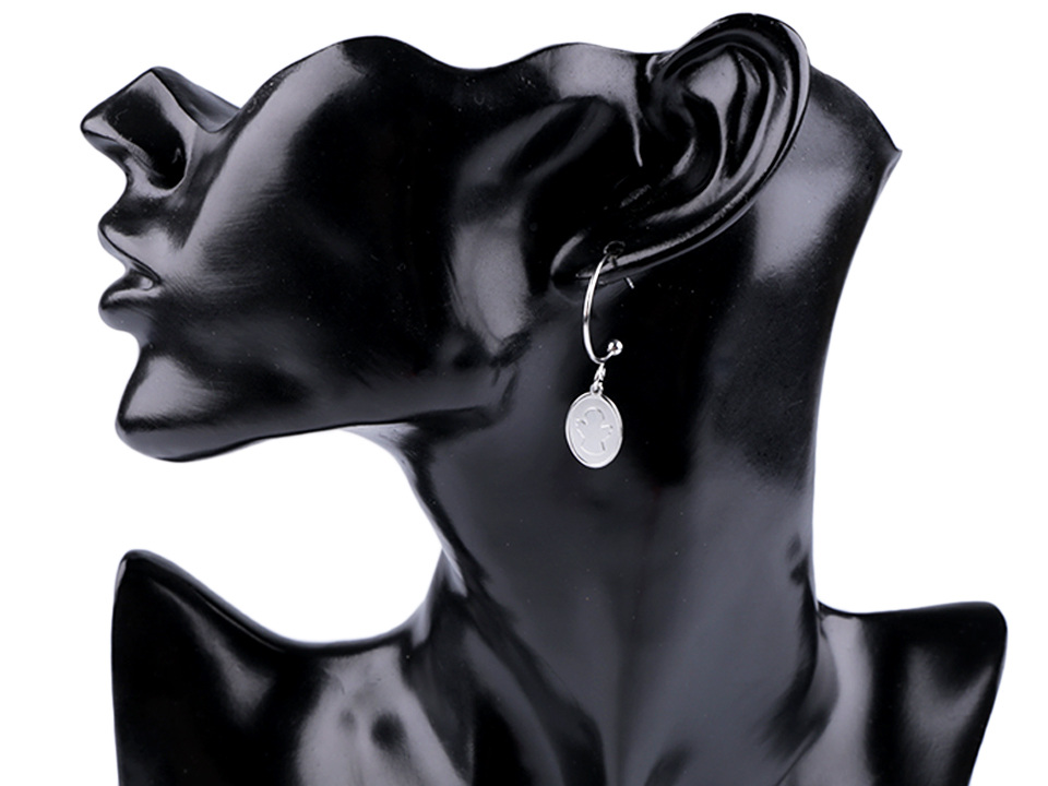 Medailonek je zavěšený v očku, při pohybu hlavy se houpe. Má provedení lesk v kombinaci s matem.