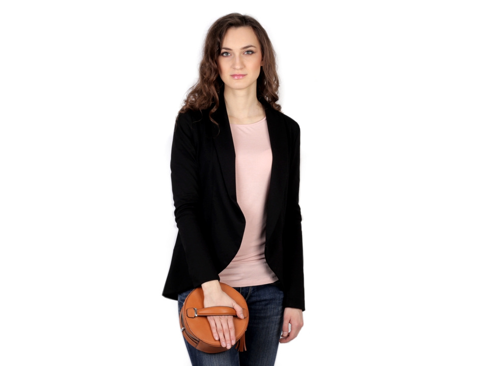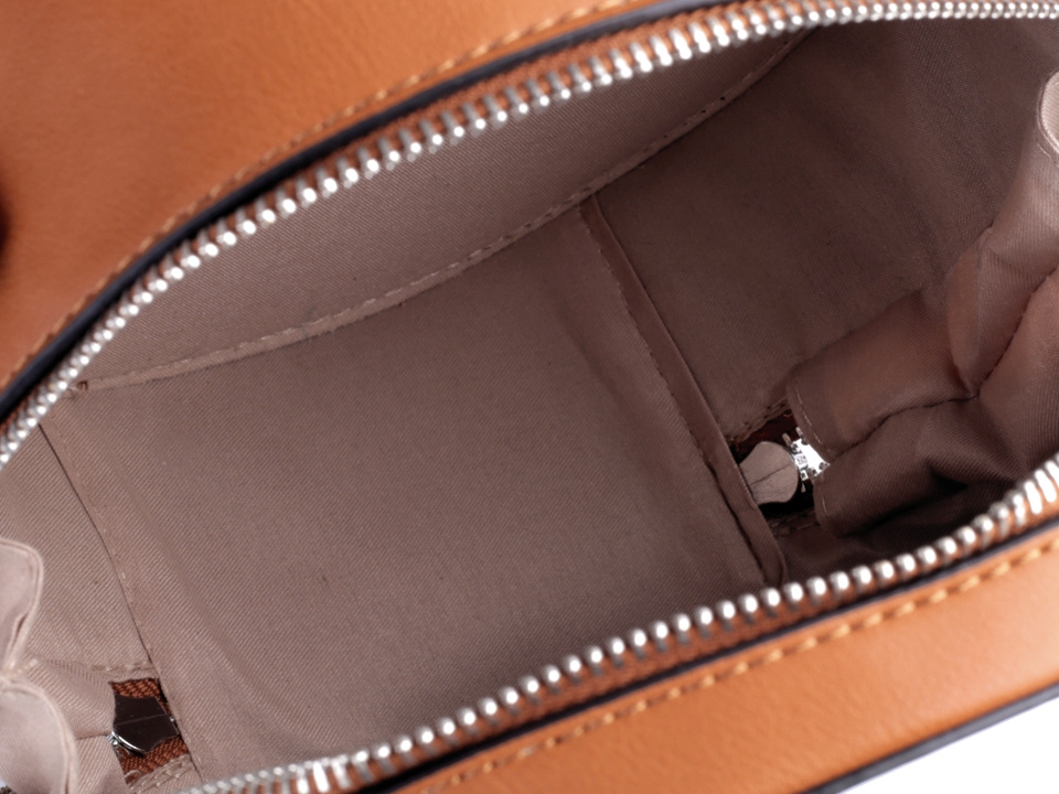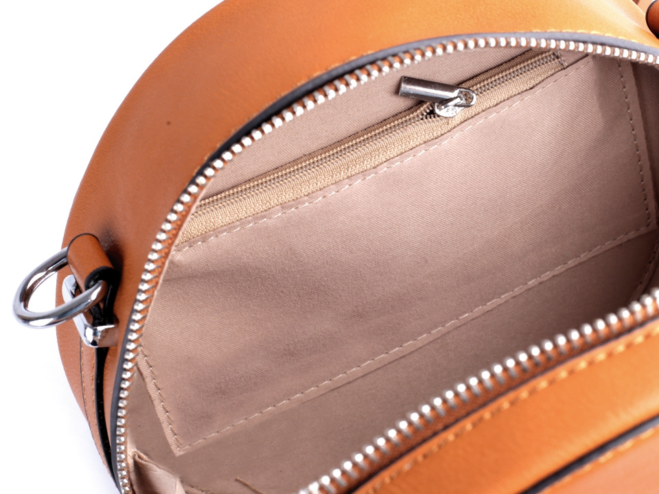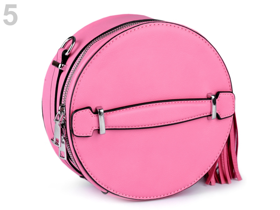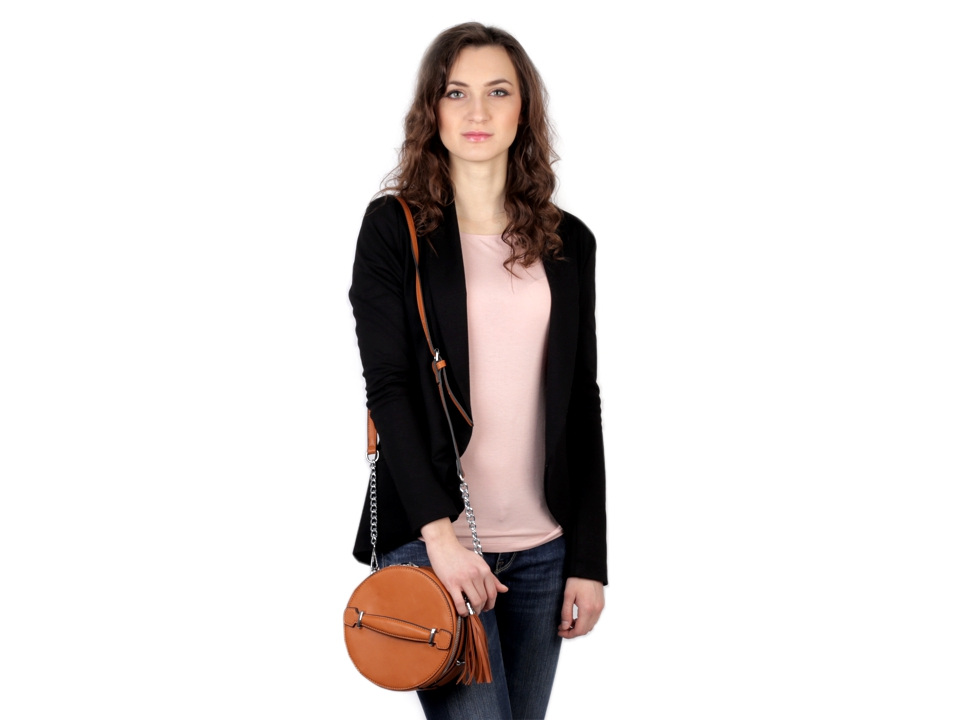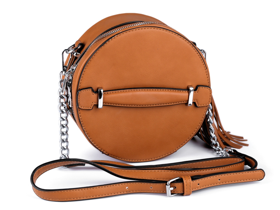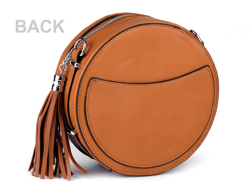 Kulatá dámská kabelka na první pohled zaujme svým zajímavým tvarem a dlouhým střapcem. Díky krátkému úchytu se pohodlně nosí v ruce, pomocí dlouhého nastavitelného popruhu ji můžete nosit na rameni. Je vyrobená z pevné eko kůže, stále drží svůj elegantní tvar. Zapíná se na zip. Uvnitř je malá kapsička na drobnosti na zip a jedna plochá kapsa. Přední část je po rozepnutí mírně vyklápěcí, do kabelky je tak vynikající přístup. Na zadní straně kabelky je ještě jedna plochá kapsa.