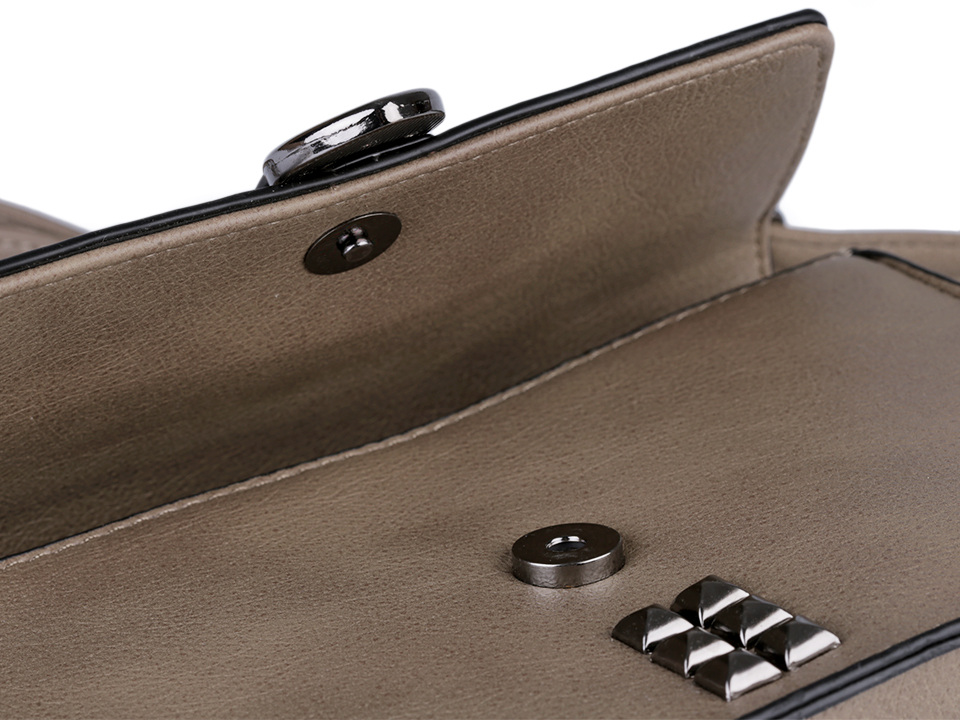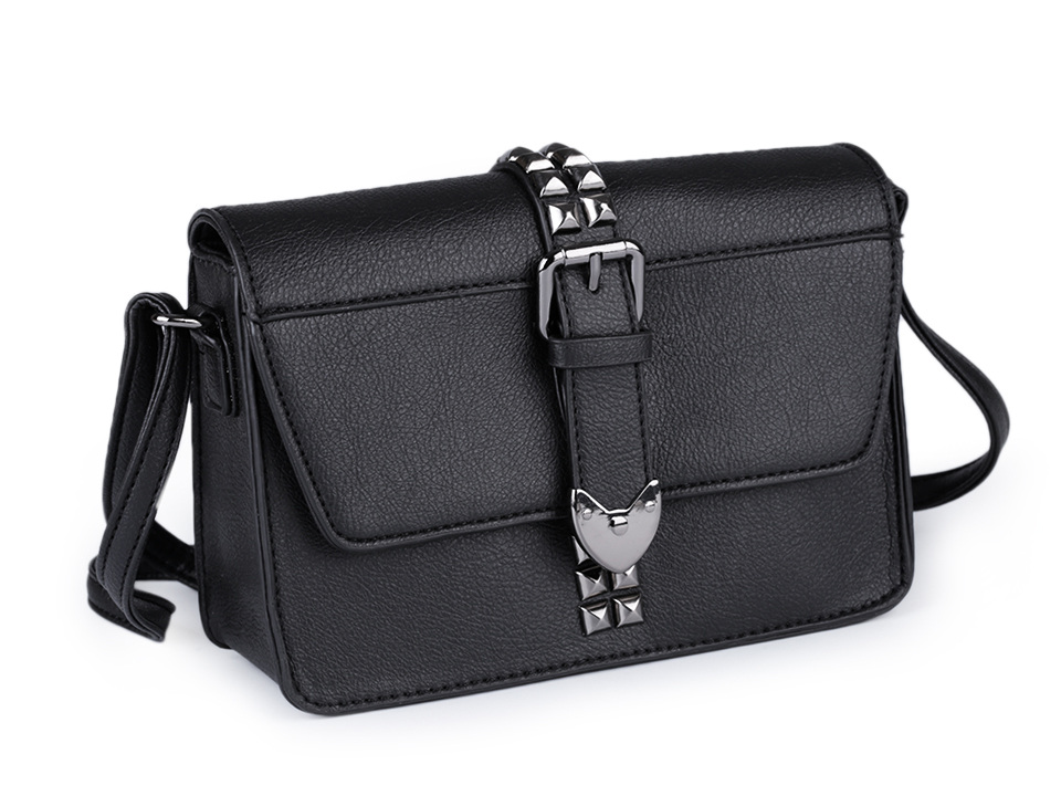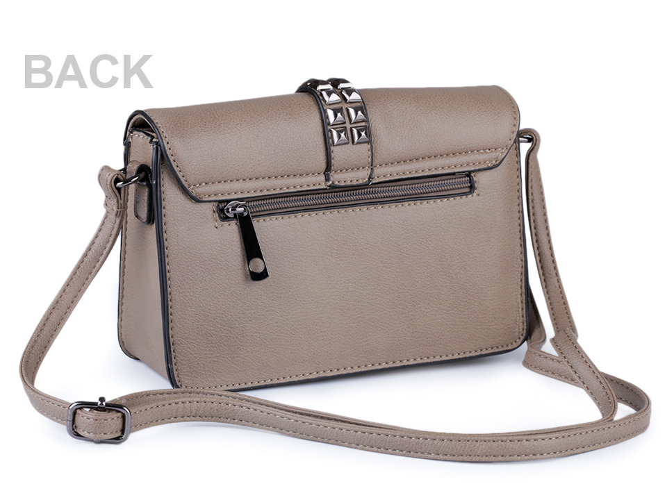 Je vyrobená z eko kůže, dozdobená kovovými pyramidami. Pod přezkou má magnetické zapínání. Hlavní kapsa se zavírá na zip. Uvnitř najdete menší postranní kapsu na zip. Další kapsa na zip je umístěná na vnější zadní straně kabelky. Kabelku lze, díky nastavitelného popruhu, pohodlně nosit v ruce nebo přes rameno.