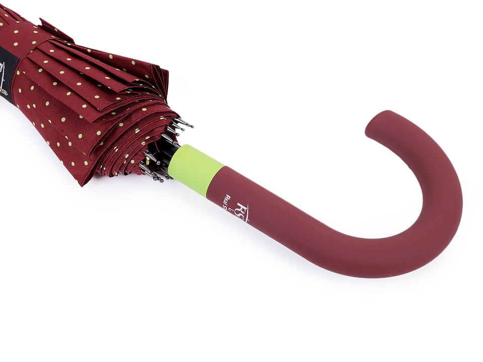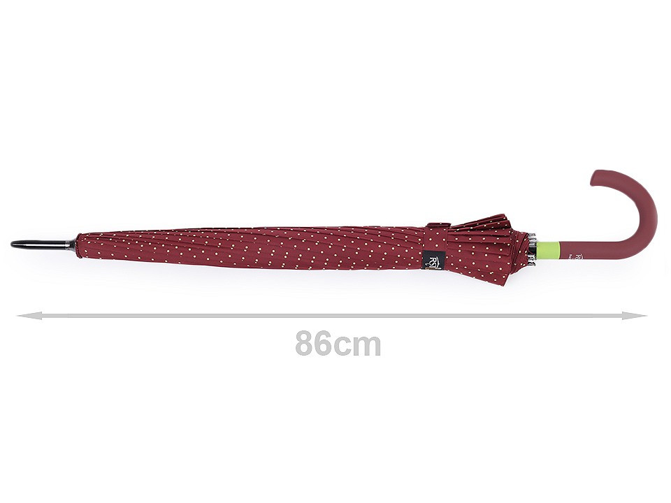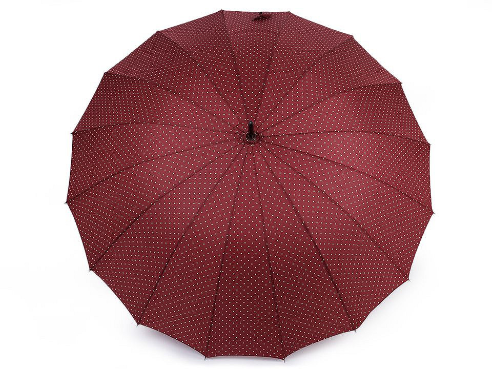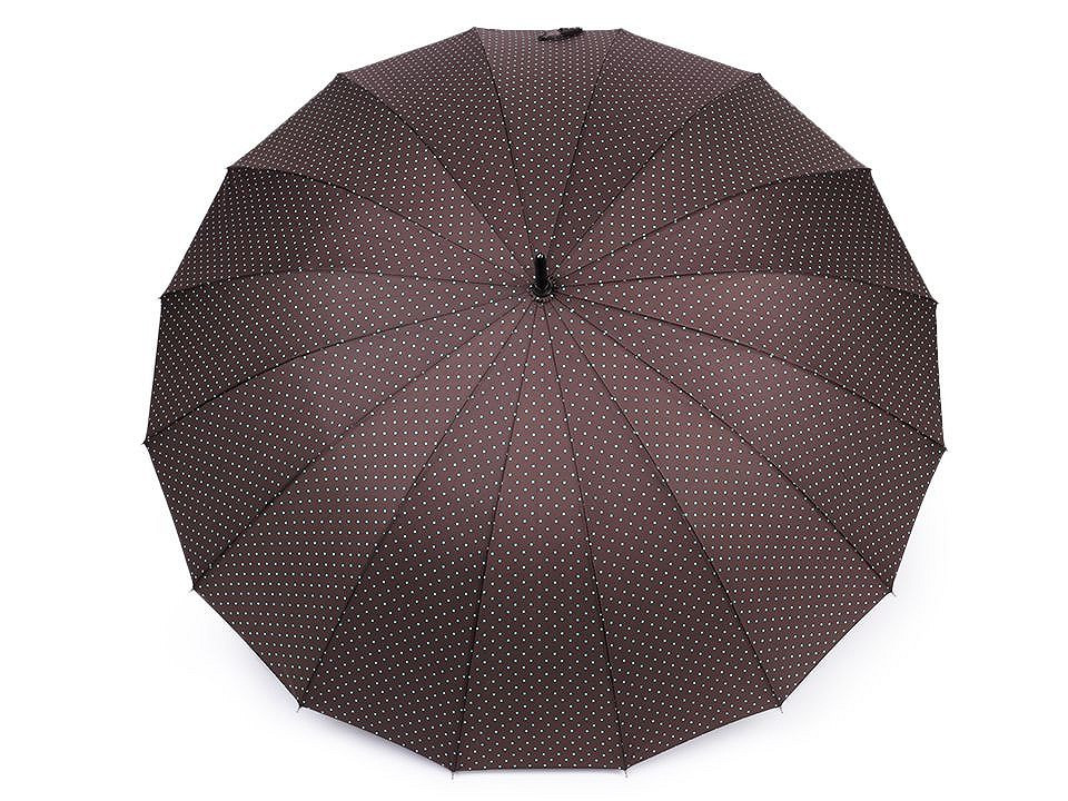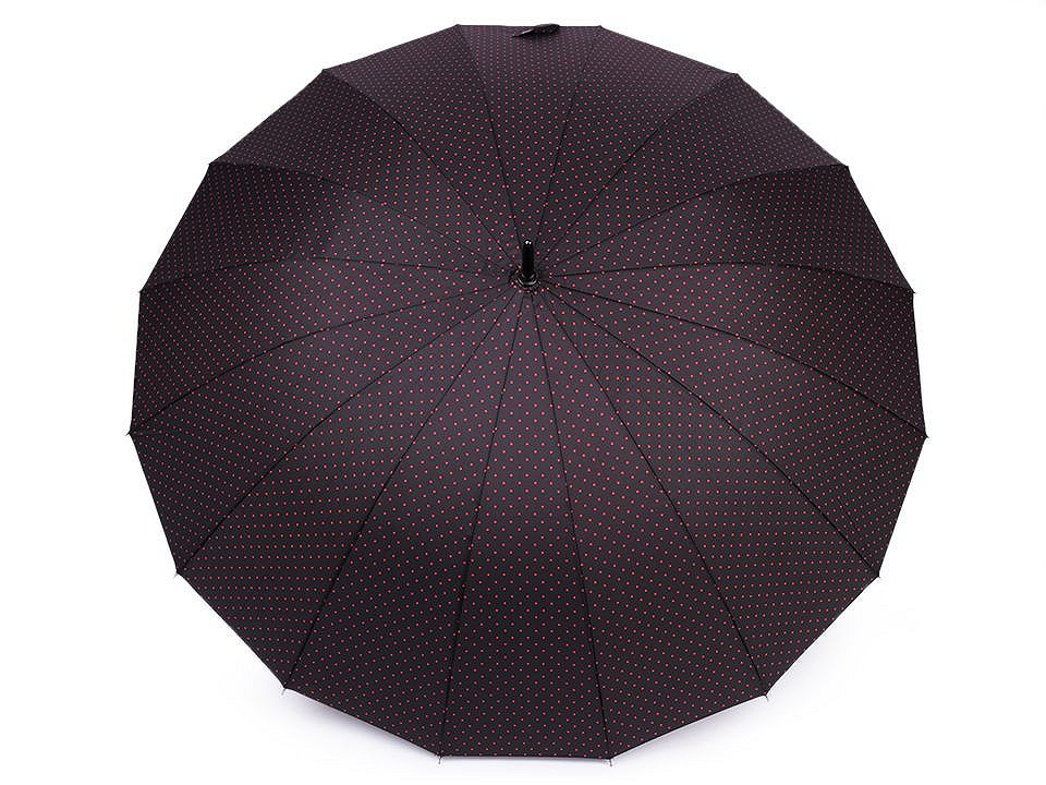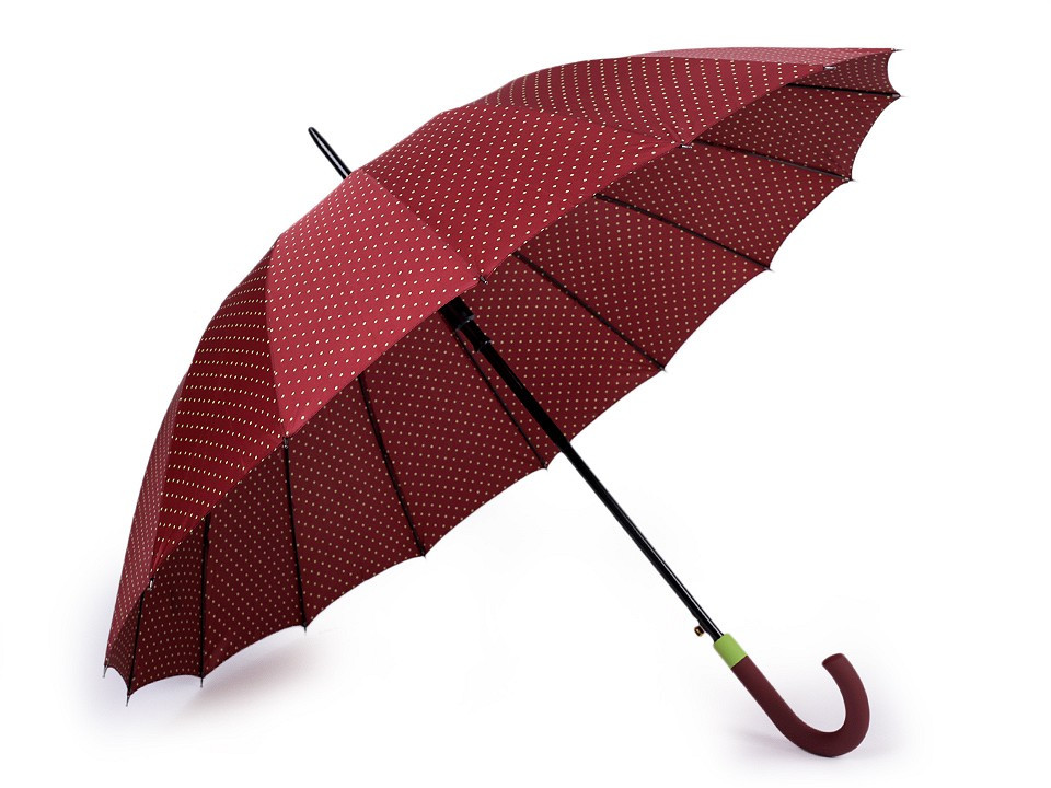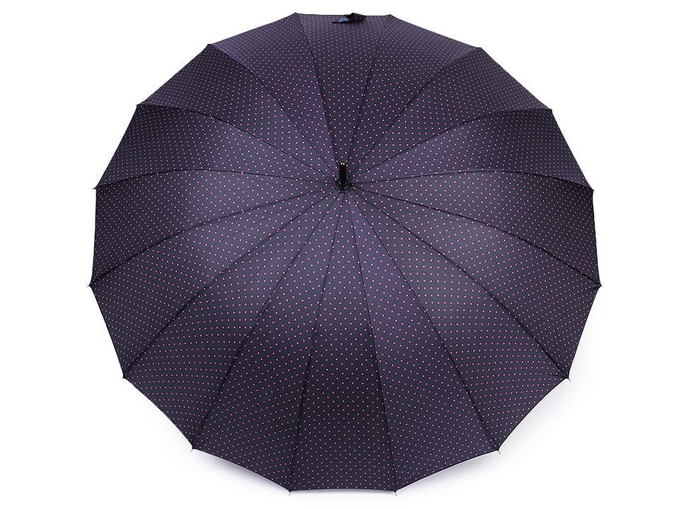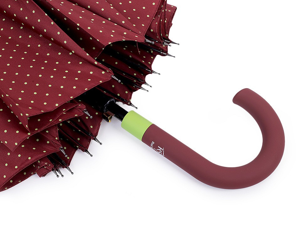 Dámský vystřelovací deštník s puntíky vás spolehlivě ochrání před nepřízní počasí. Skládá se z šestnácti polí. Konstrukce je vyrobena z pružných lamel zajišťujících vysokou pevnost a stabilitu. Deštník má klasickou tyč zakončenou pevnou rukojetí.