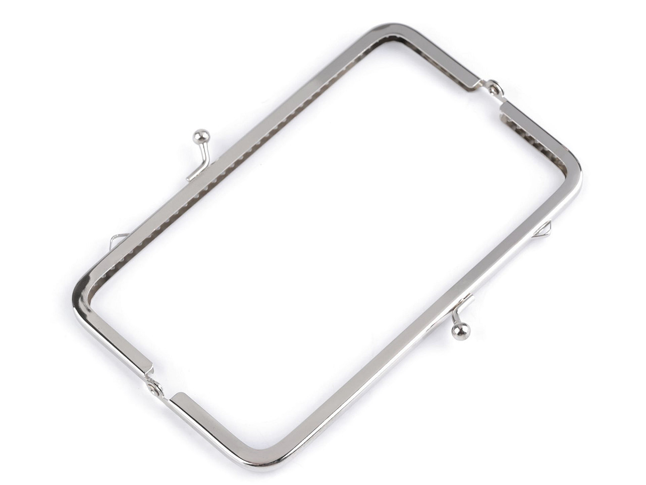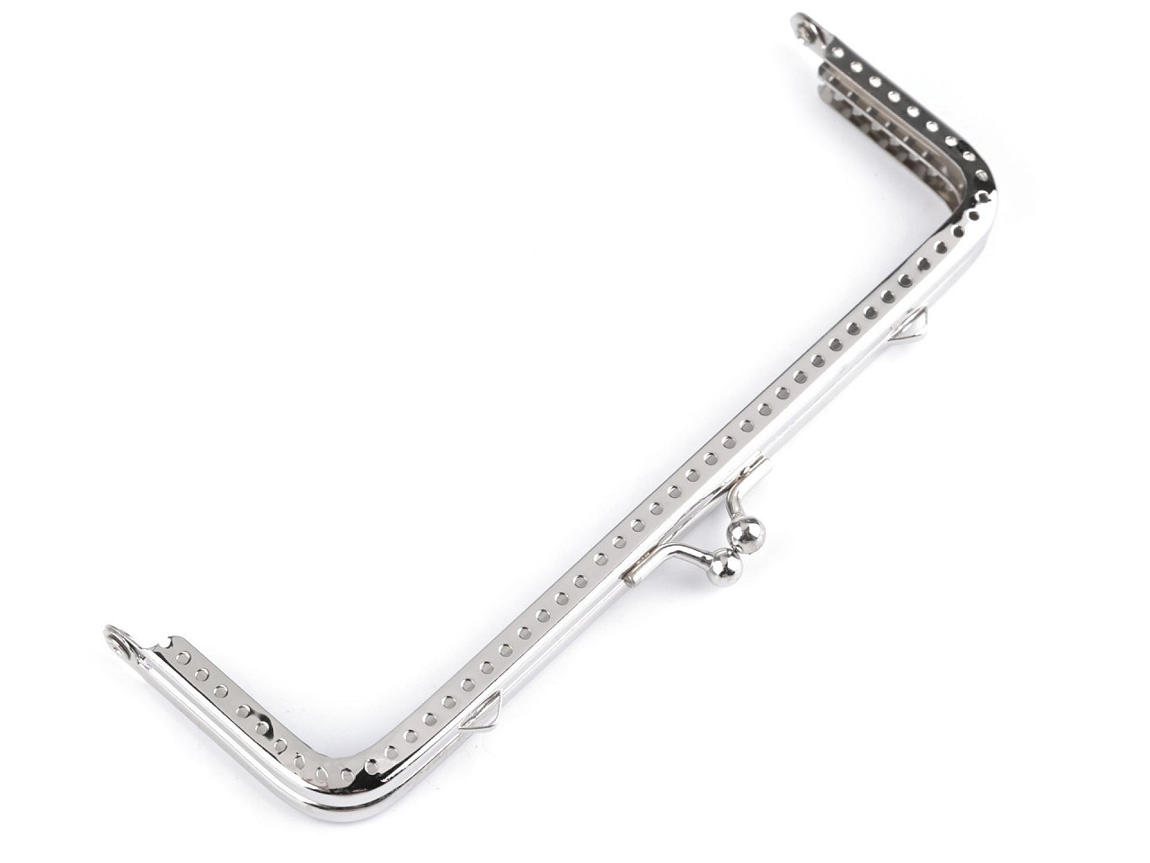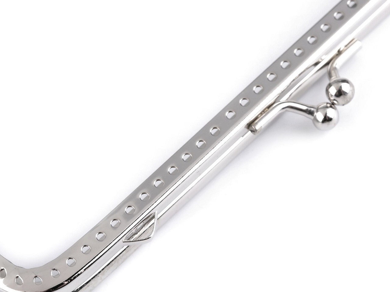 Kovový rámeček se zapínáním na výrobu kabelky. Rámeček je určený k našití, kdy se látka dovnitř vloží a ručně přešije přes dírky, jejichž rozpětí je 4 mm. Dírky jsou jen na vnější straně rámečku.