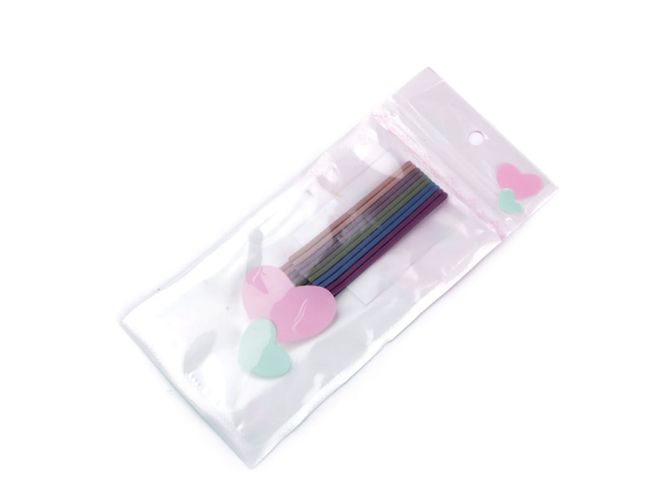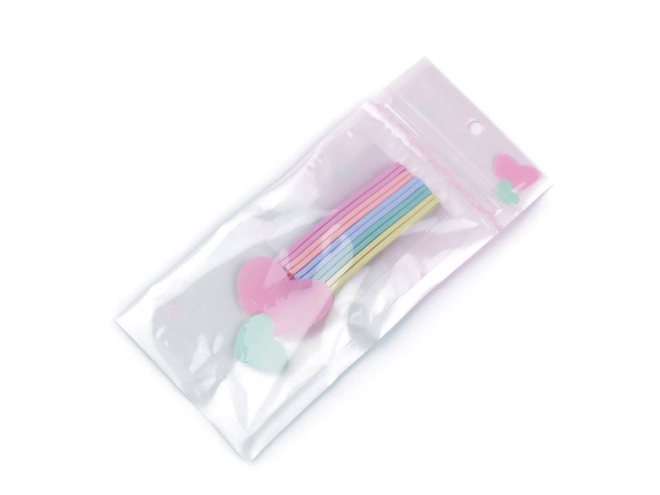 Na plastové kartě je 5 párů sponek, tzn. 10 ks sponek celkem. Sáček, ve kterém je karta vložená, má otvor pro zavěšení a vystavení na prodejní stojan.