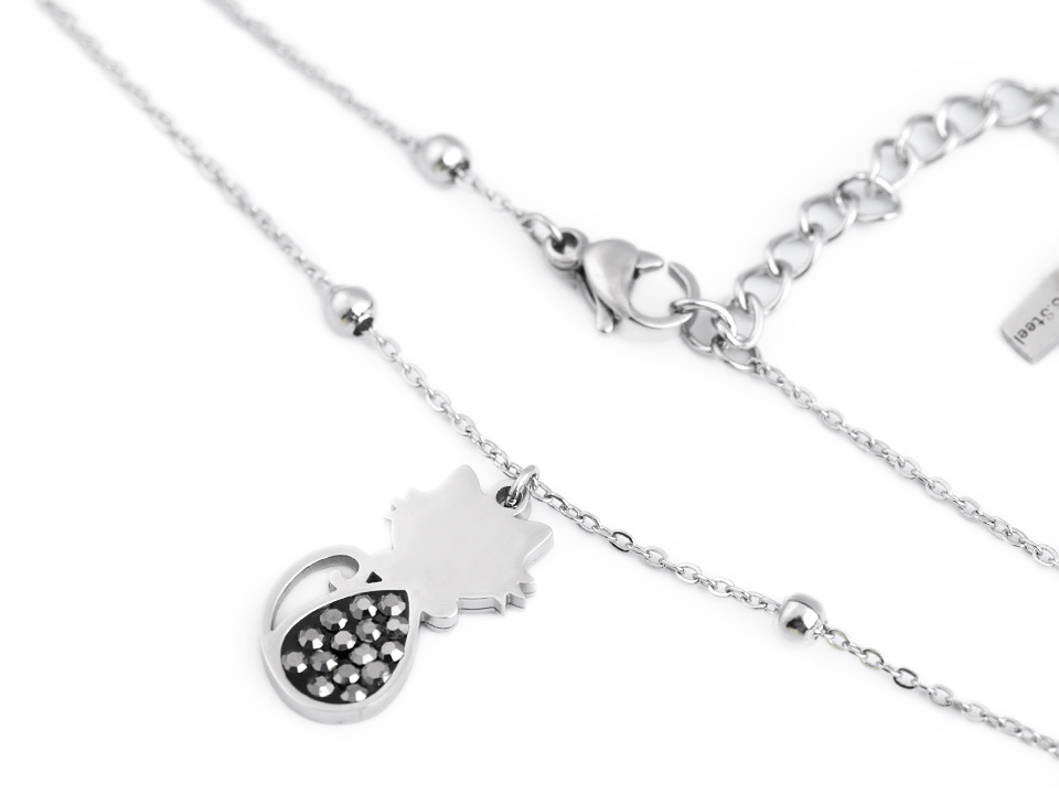 Přívěsek je zavěšený na jemném očkovém řetízku s kuličkami. Je osázený drobnými broušenými kamínky. Náhrdelník se řadí mezi krátké, univerzální náhrdelníky, hodí se do výstřihů halenek, šatů i k tričkům.