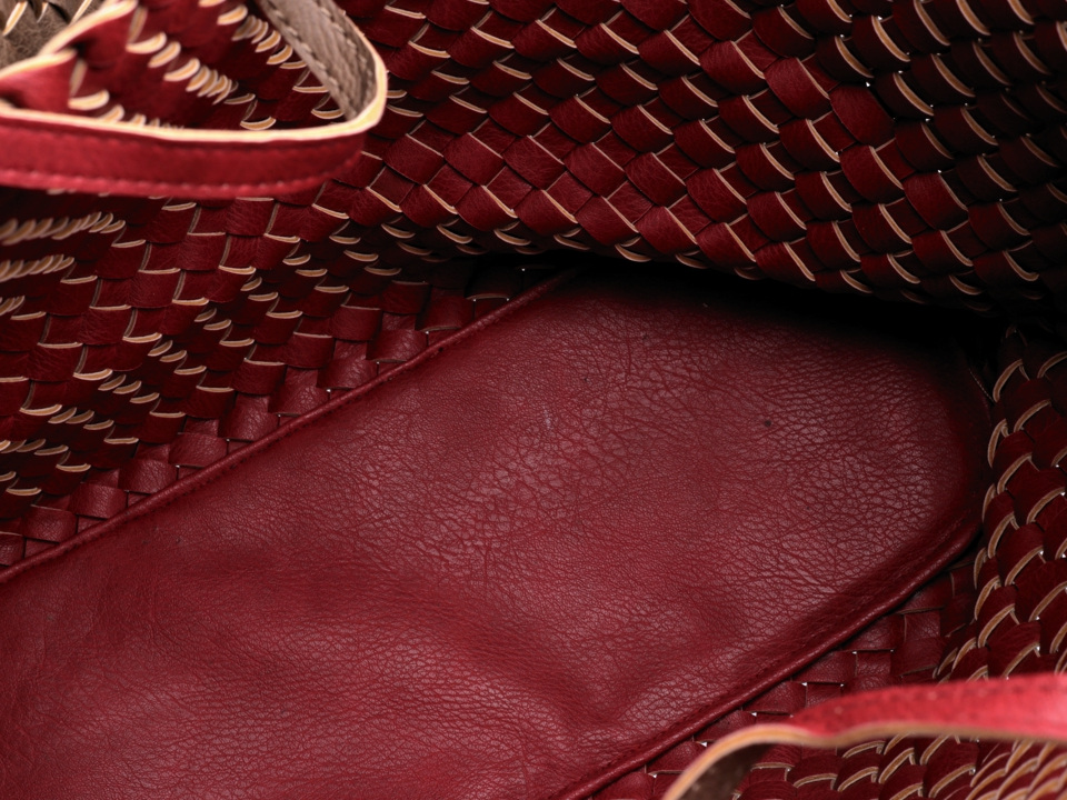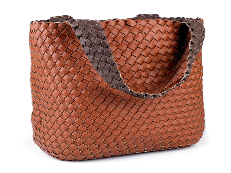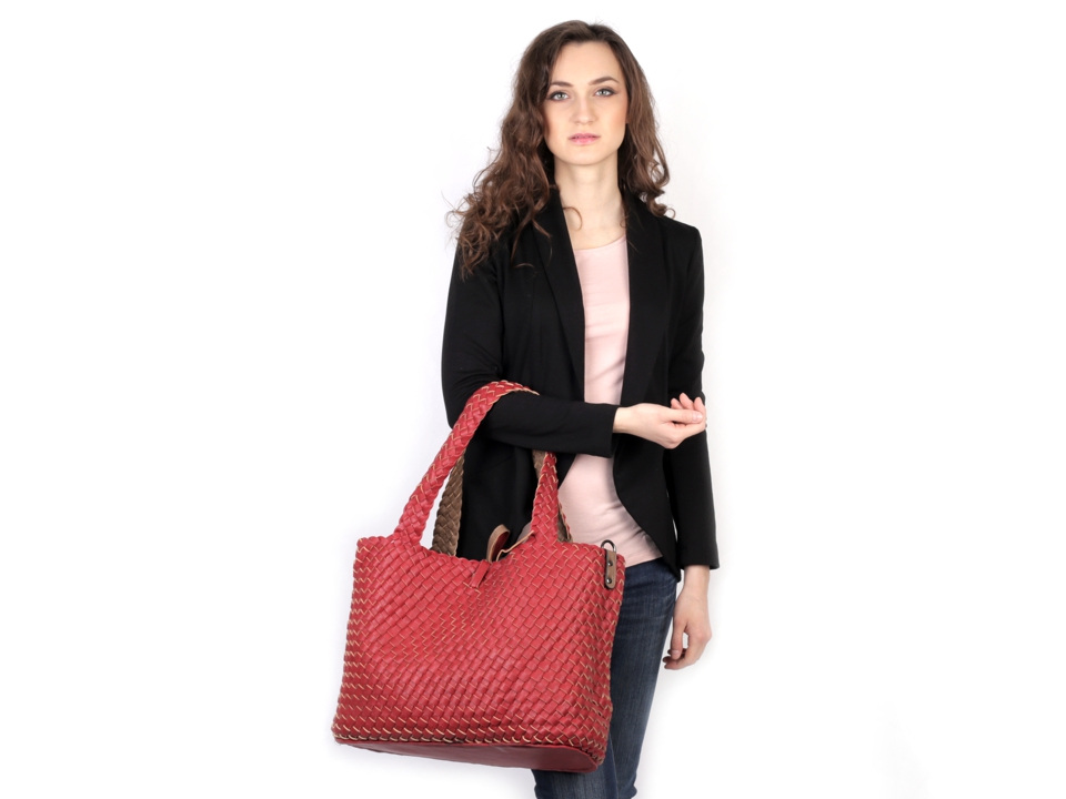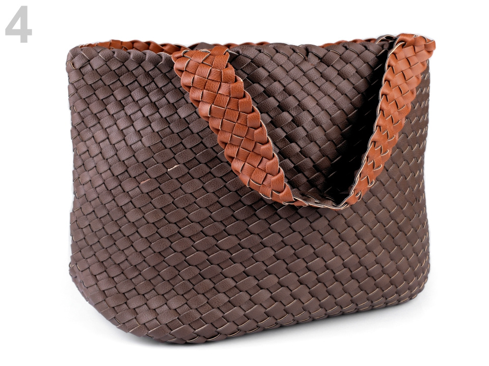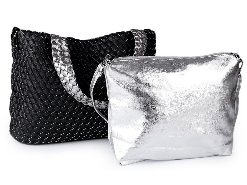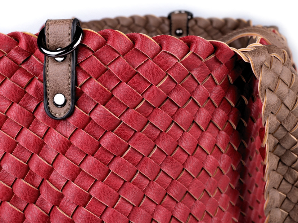 Velká splétaná kabelka z eko kůže má rafinovaný oboustranný design. Z každé strany má jinou barvu. Můžete si ji měnit podle nálady nebo vašeho outfitu. Dovnitř můžete vložit menší tašku, jež je součástí sady. Malá taška má barvu vnitřní strany kabelky.
