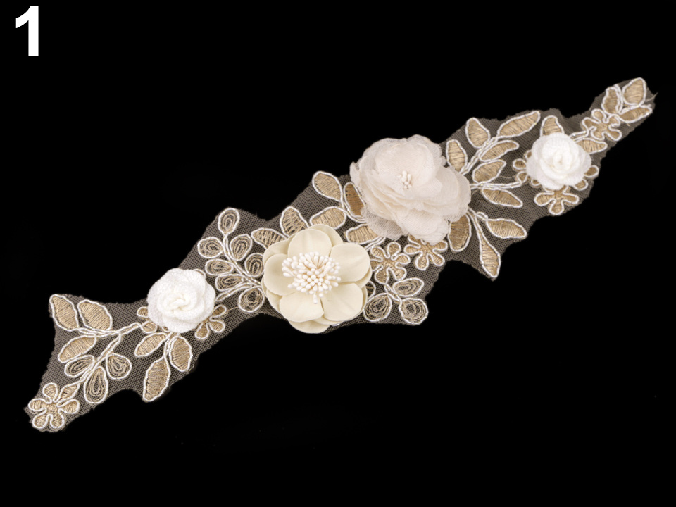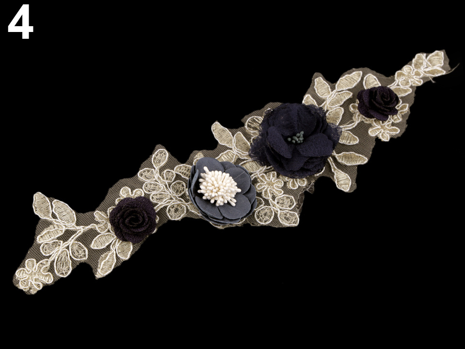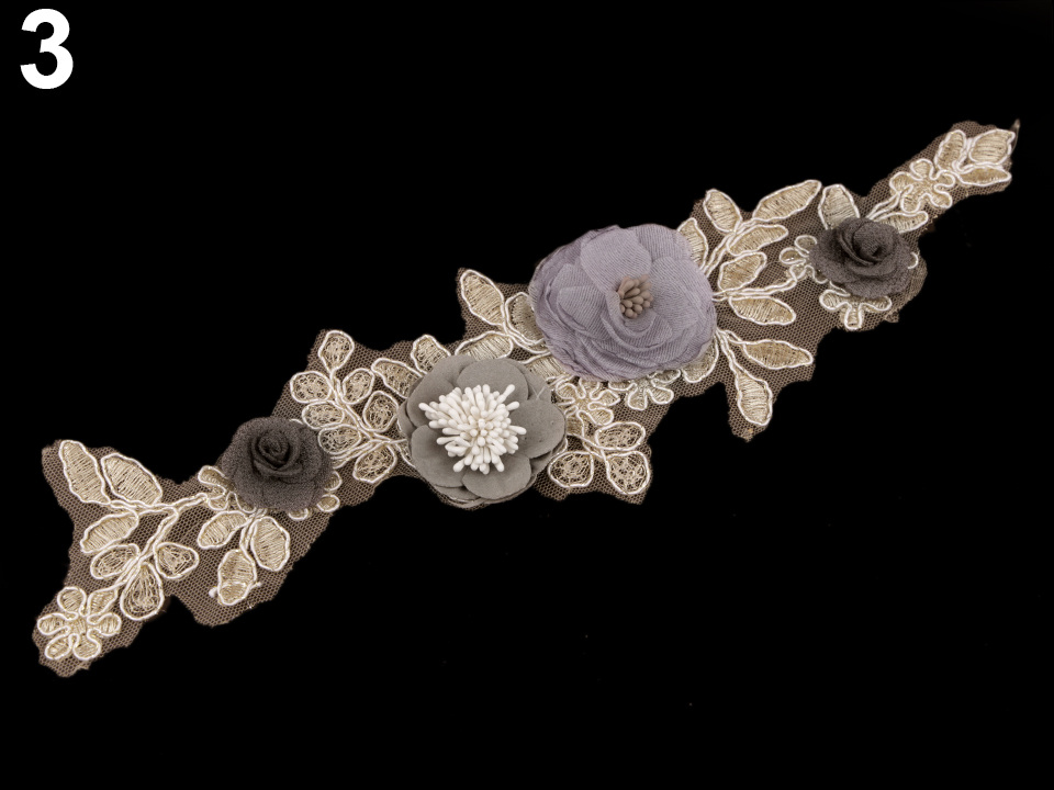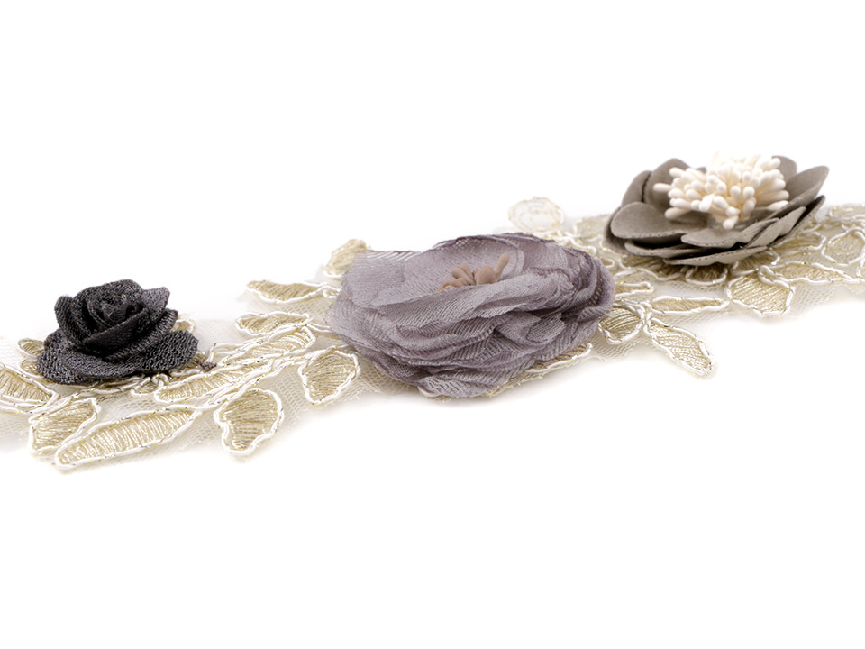Monofilová vsadka s 3D květy má podklad z lesklého lurexu.