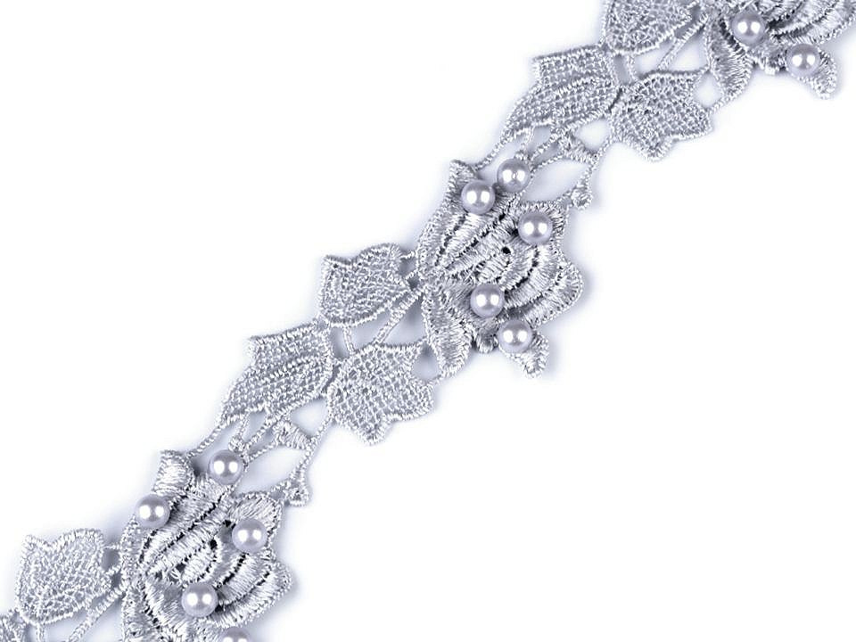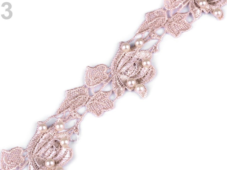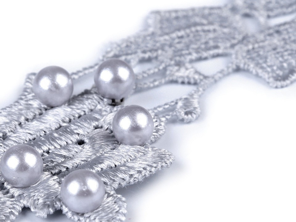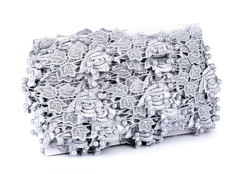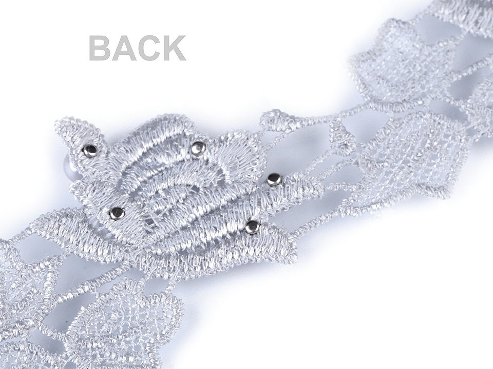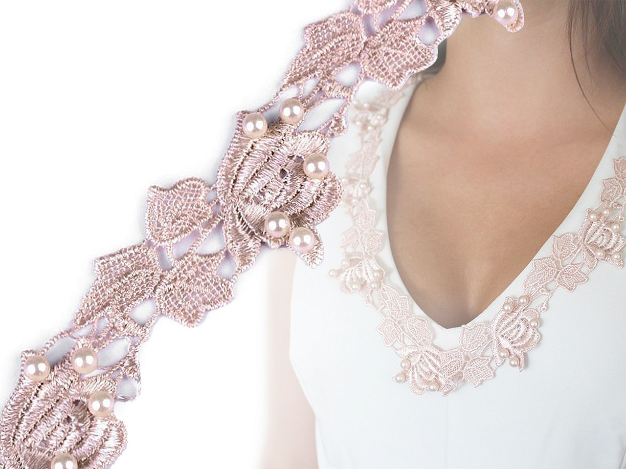 Vzdušnou krajku, která připomíná listy, zdobí přinýtované perly ve stejném barevném odstínu.