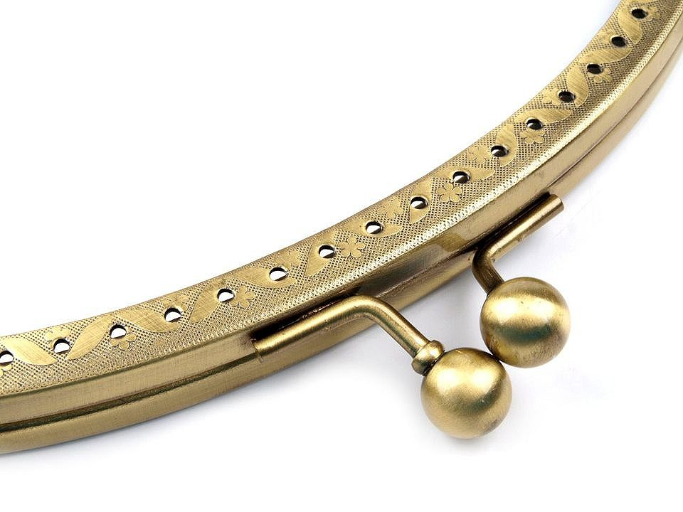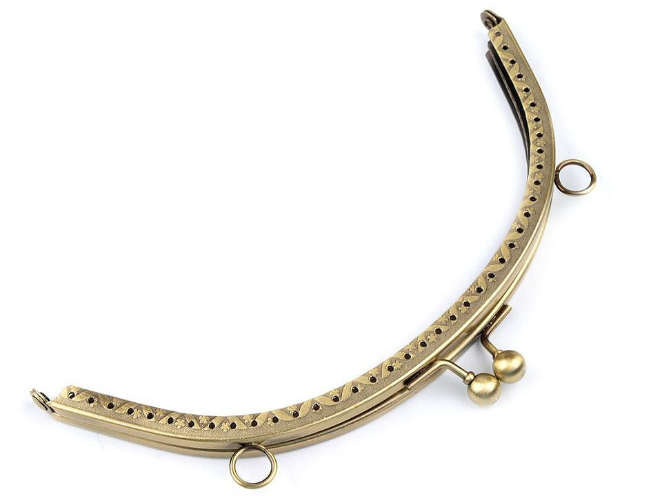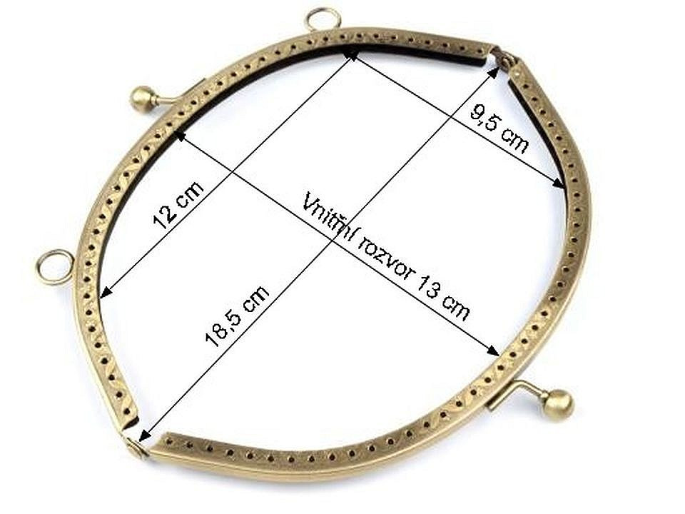Kovový rámeček se zapínáním na výrobu kabelky. Vnitřní rozměry rozvoru jsou 13 x 18,5 cm, vnější 14,5 x 19 cm. Výška zavřeného rámečku je 8 cm, resp. 10 cm včetně zapínání. Rozměry viz foto. Zapínání má nahoře úchyty na ucha o průměru 1 cm. Rámeček je určený k našití, kdy se látka dovnitř vloží a ručně přešije přes dírky, jejichž rozpětí je 6 mm. Tento typ zapínání využijete určitě na jakýkoliv typ kabelky, ať už společenské nebo určené ke všednímu nošení.Složení: kov magnet