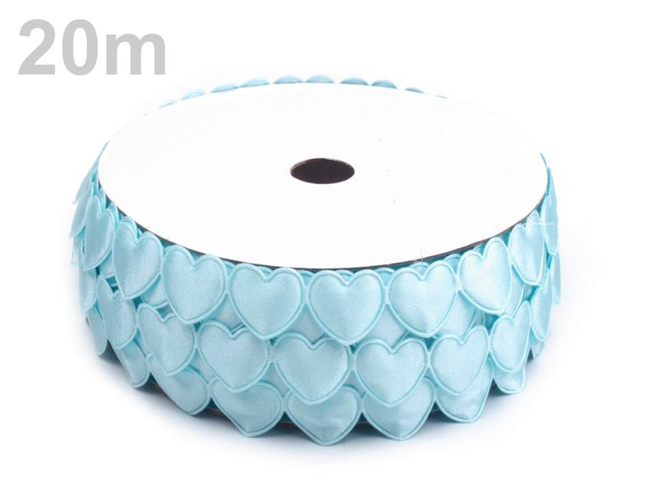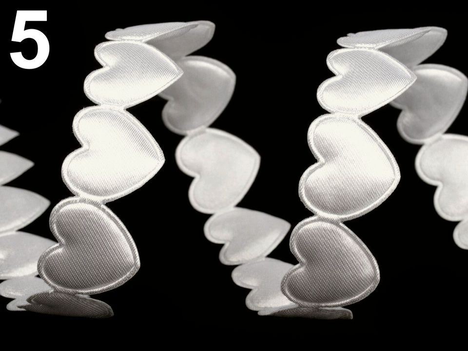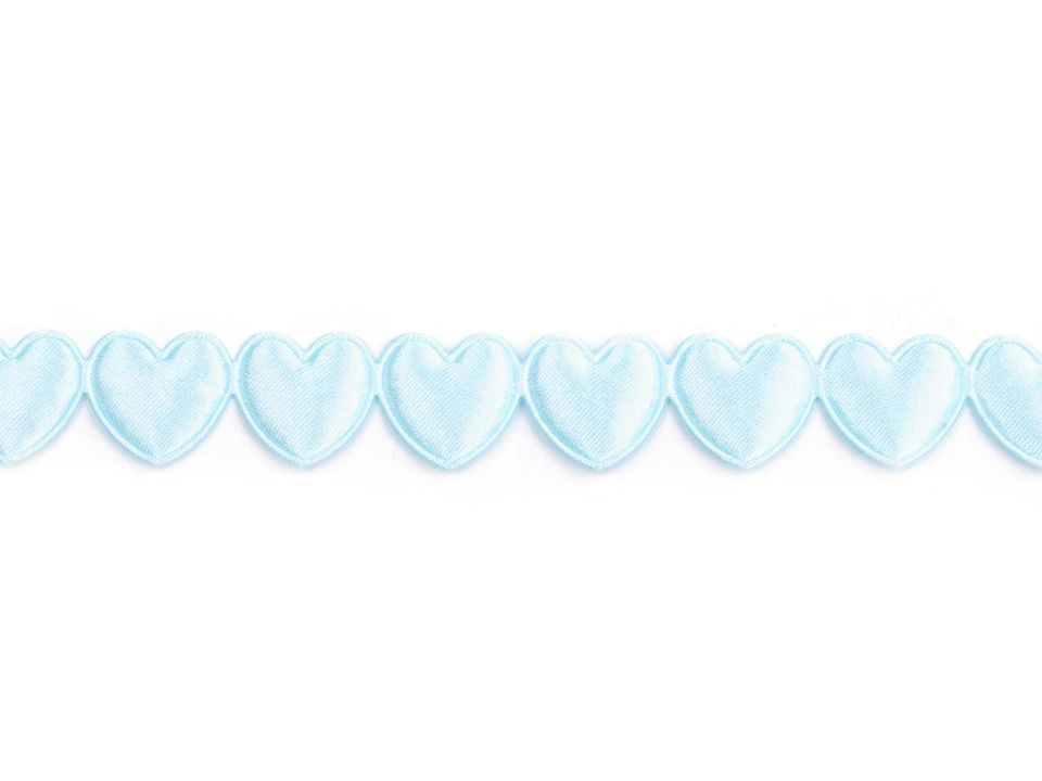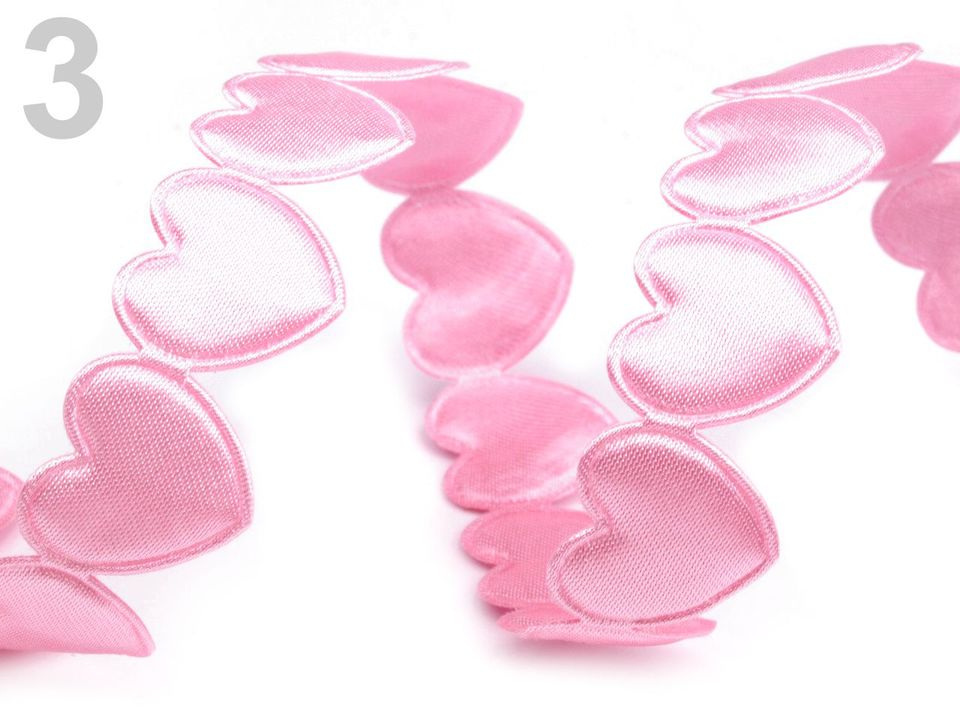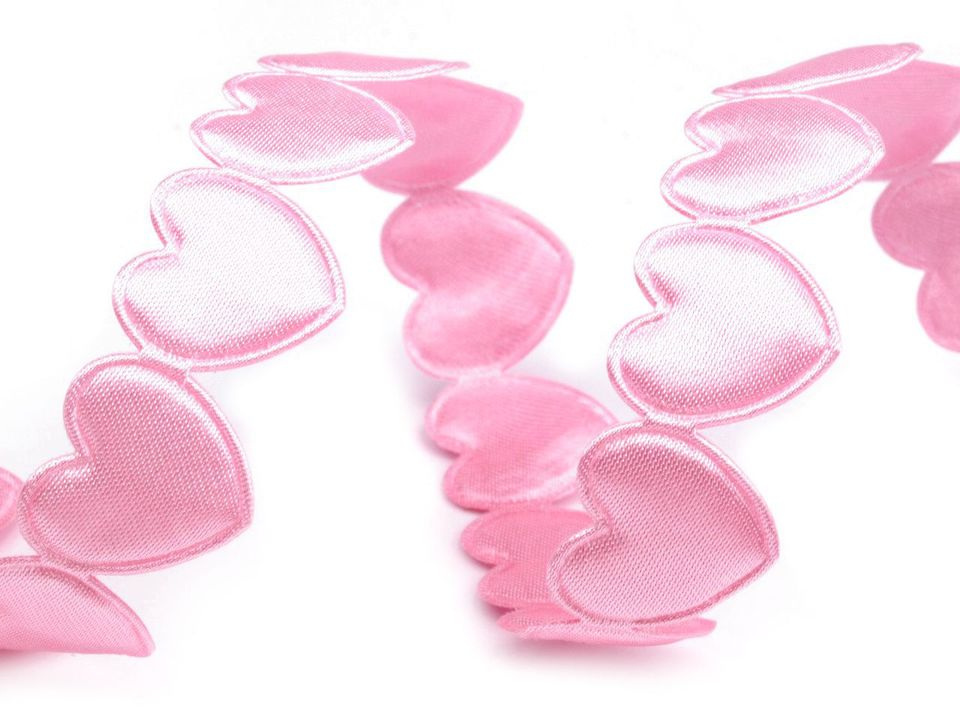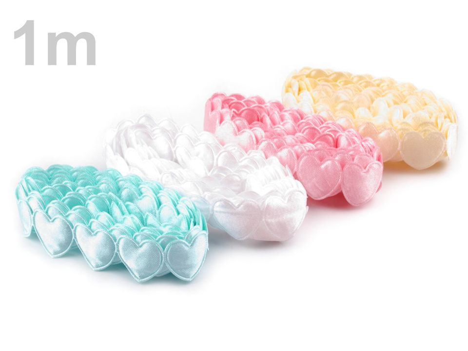 Saténový prýmek se srdci se na oděv našívá nebo lepí pomocí textilního lepidla. Jednotlivé tvary lze nastříhat a použít na scrapbooking. Rozměry srdce jsou 17 x 17 mm.