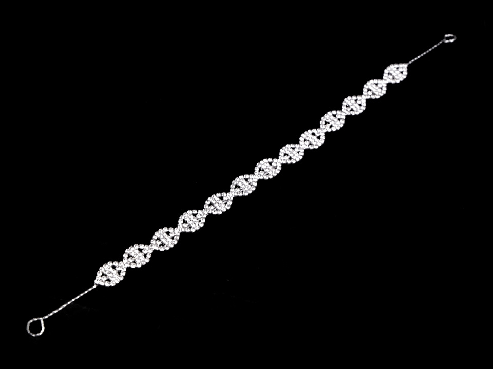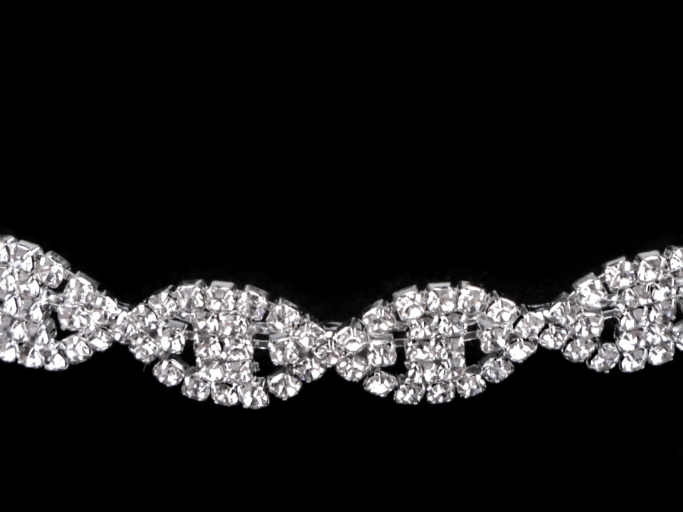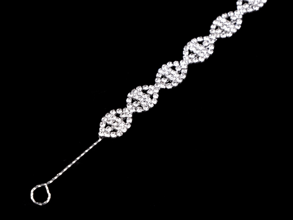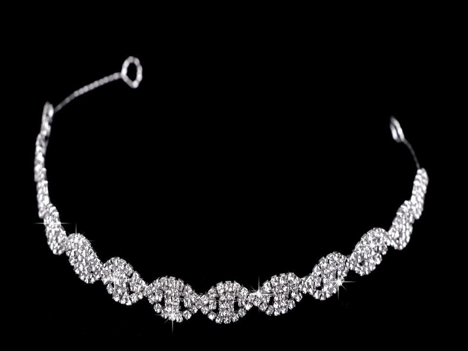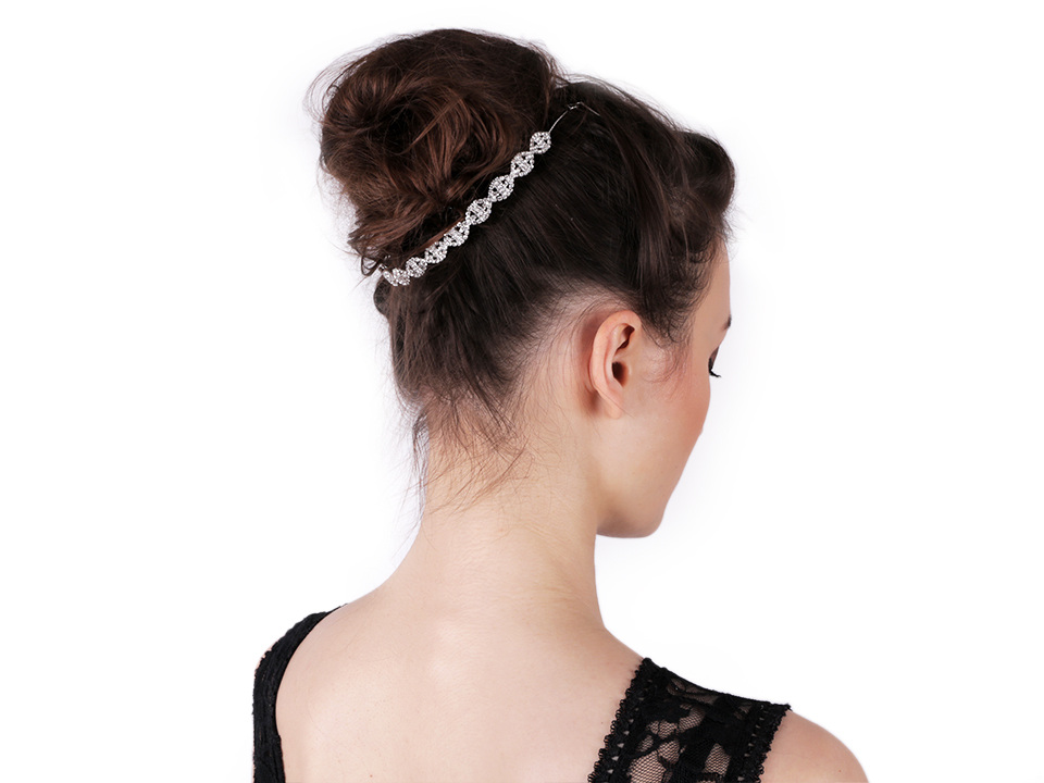 Skleněné broušené kamínky se již na dálku efektně třpytí. Ozdoba je ohebná, dá se skvěle tvarovat podle potřeby. Na koncích má vlasové sponky, za které ji lehce upevníte do účesu. Nebo můžete využít očka (cca Ø5 mm), do kterých lze navléci stuhu nebo pruženku.