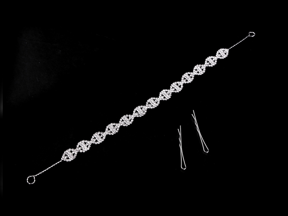 Elegantní štrasová ozdoba zajímavě dozdobí slavnostní účes. Je vhodná jako čelenka. Využijete ji i do složitých účesů jako jsou různé drdoly nebo překládané účesy, kde se její konce schovají pod vlasy.