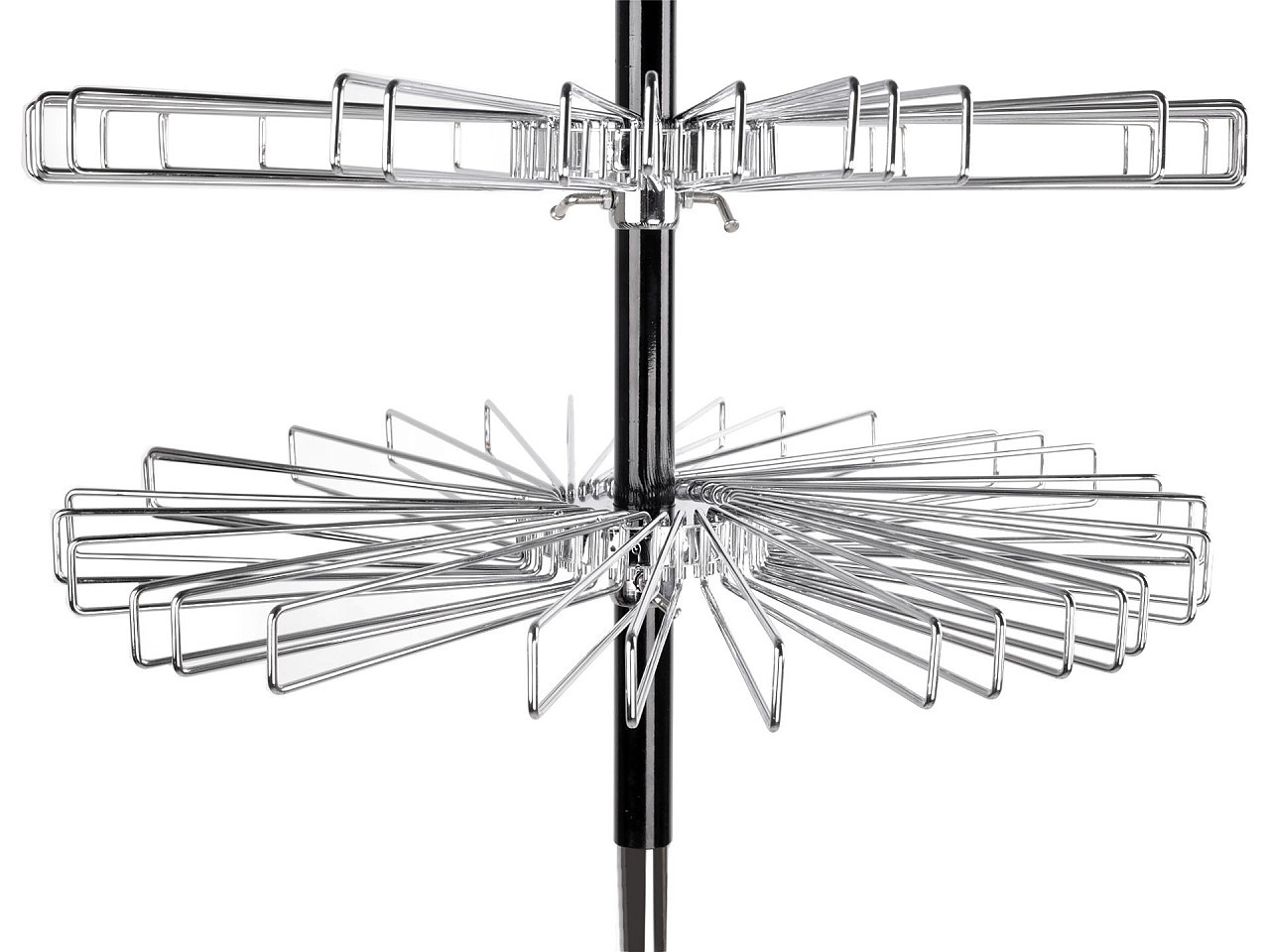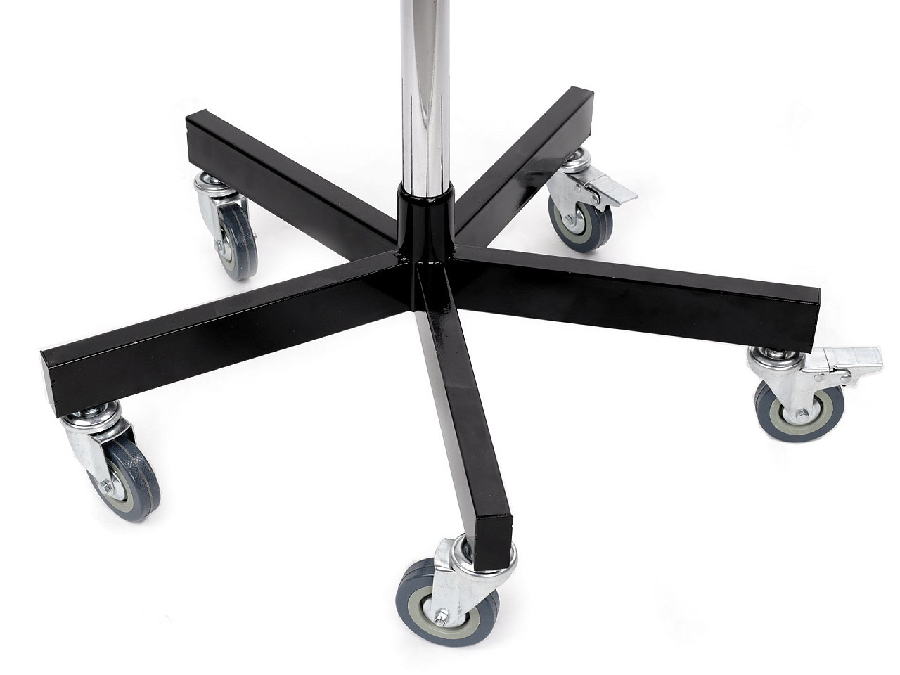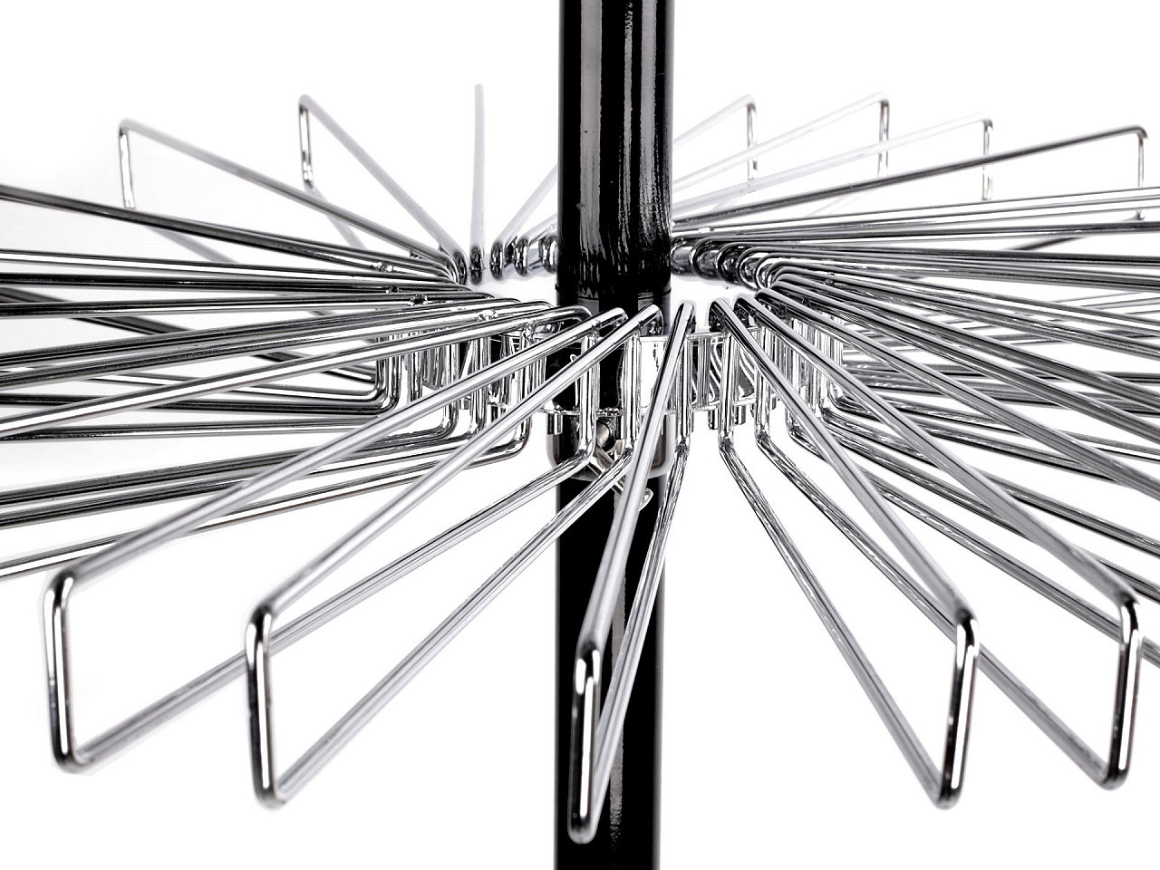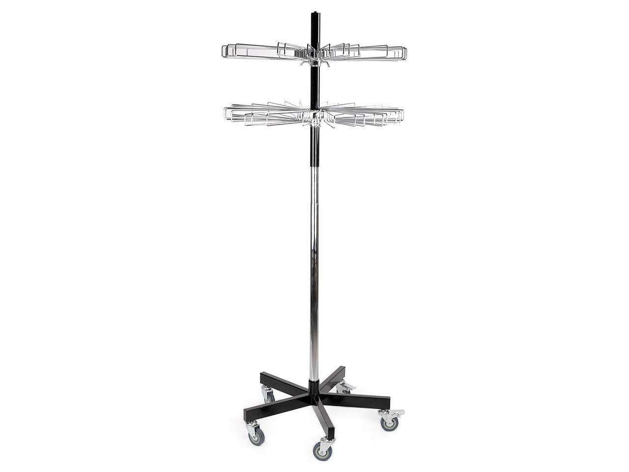 Stojan na kolečkách je určen k prezentaci šátků. Je vyroben z kvalitního kovu a má k dispozici dvě patra, kterými lze nezávisle na sobě otáčet. Celkově tento stojan obsahuje 100 závěsných háčků. Každé patro tedy obsahuje 50 háčků.