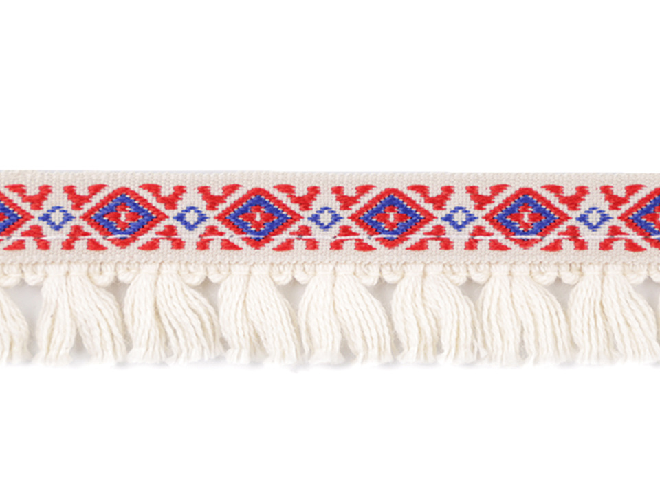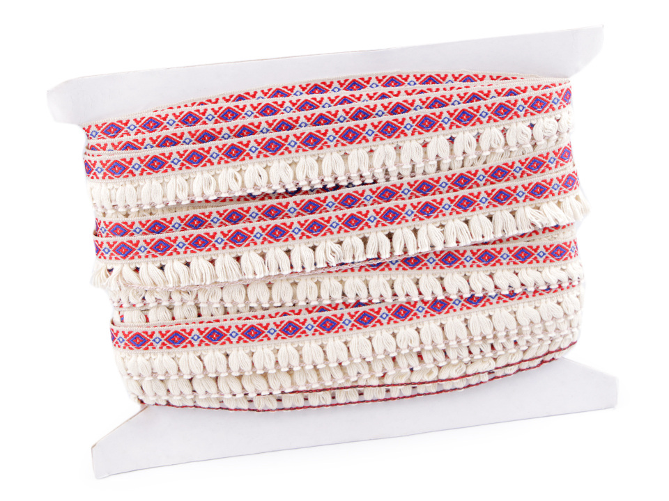 Prýmek zdobí třásně, které mu dodávají zajímavý vzhled. Můžete ho našít na tašky, kabelky, sandály, mikiny, trika atd. Efektně ozdobí také polštáře nebo dečky.