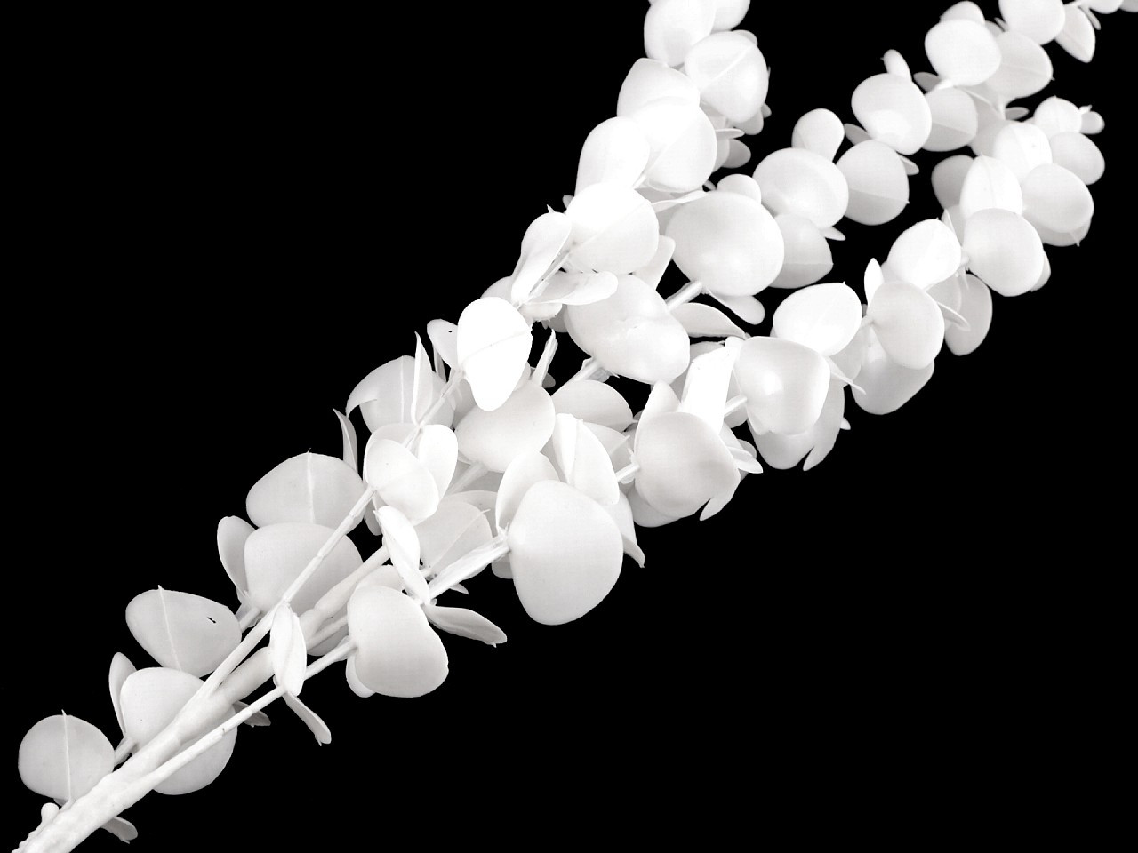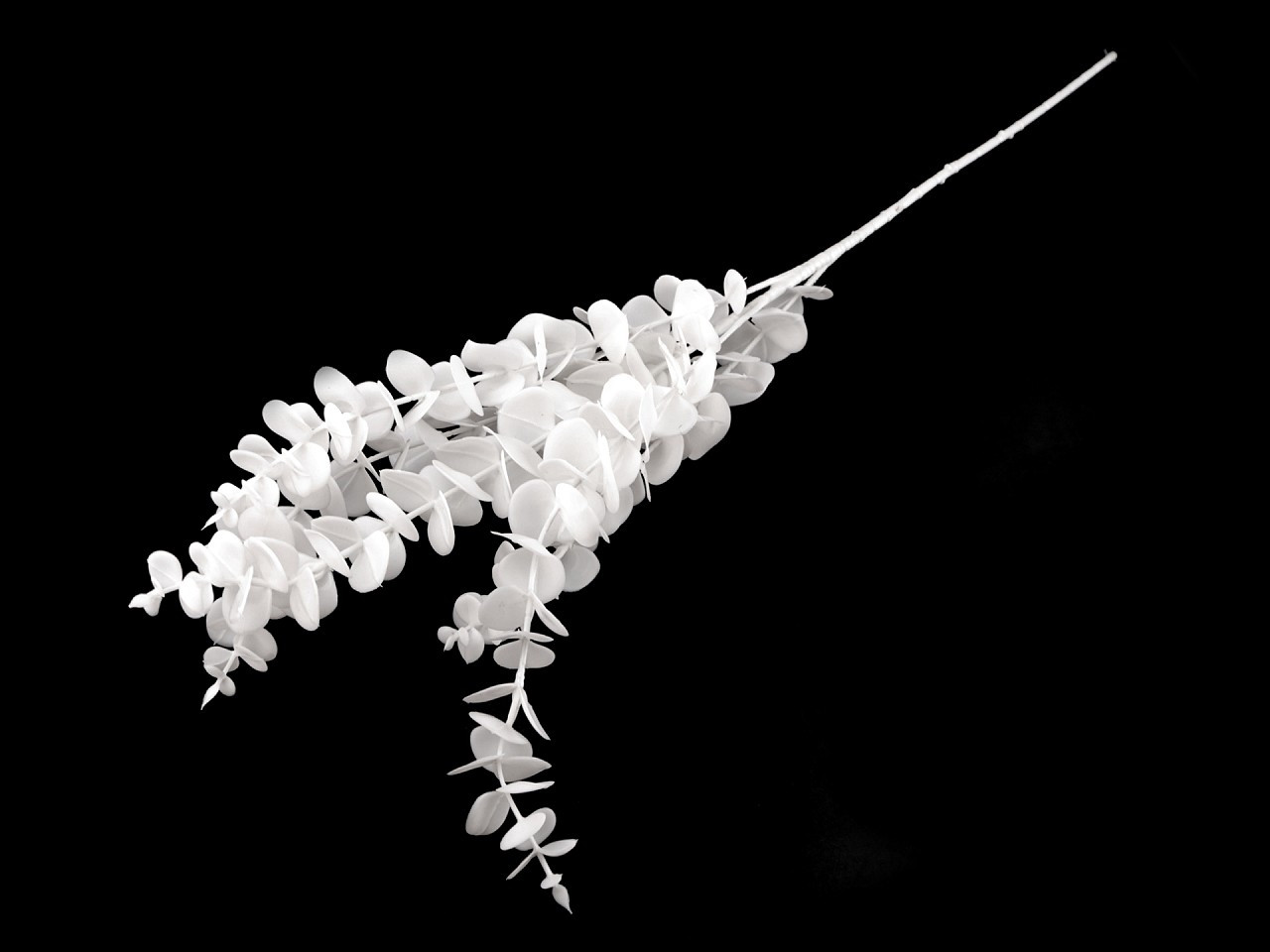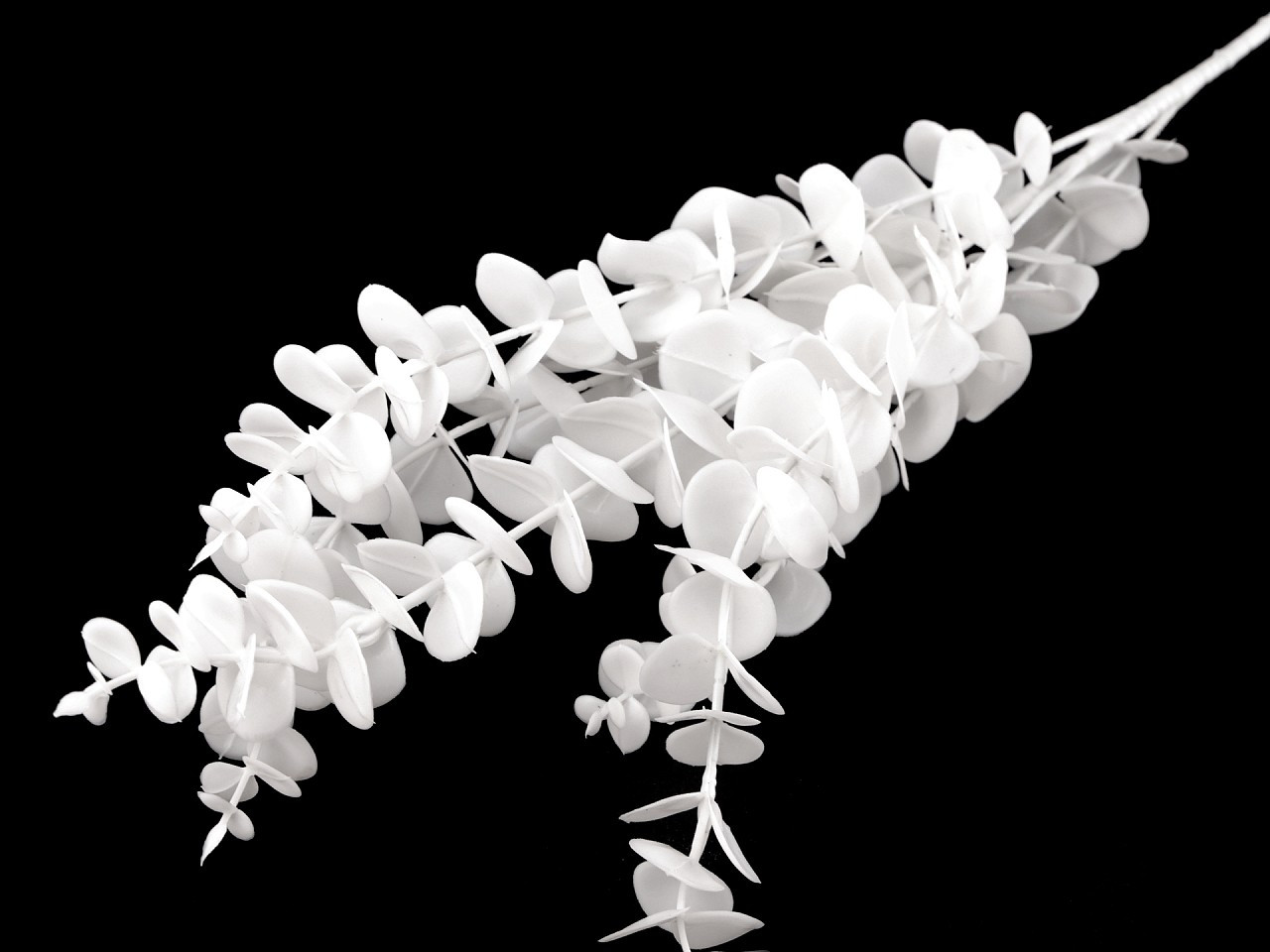 Bílý eukalyptus působí luxusně. Je vhodný ke svátečnímu aranžování interiérů i exteriérů. Skvěle se vyjímá s eukalypty dalších barev. Ve stonku se ukrývá drát, takže ho můžete tvarovat. Listy jsou matné.