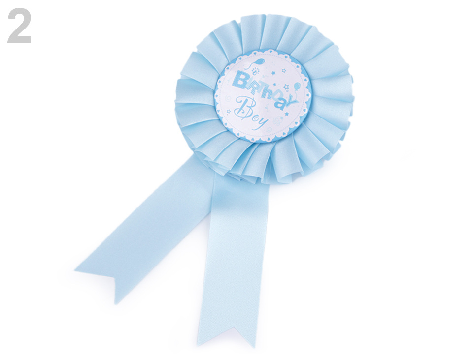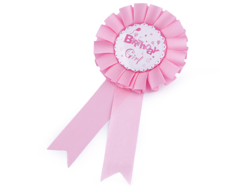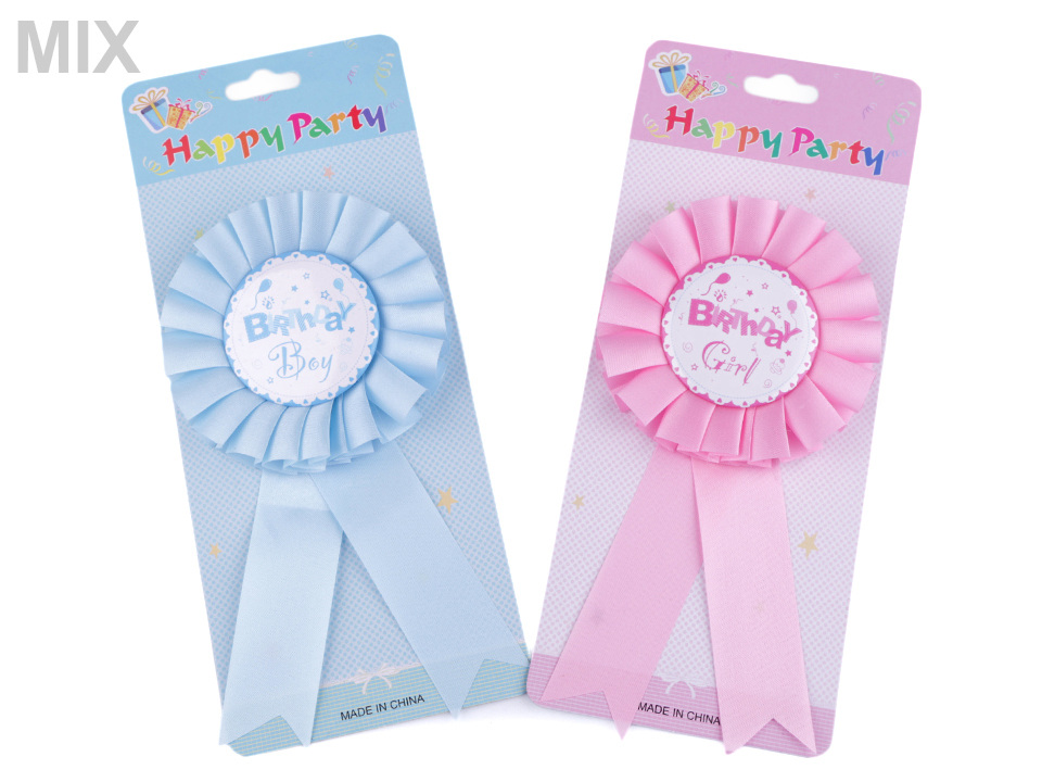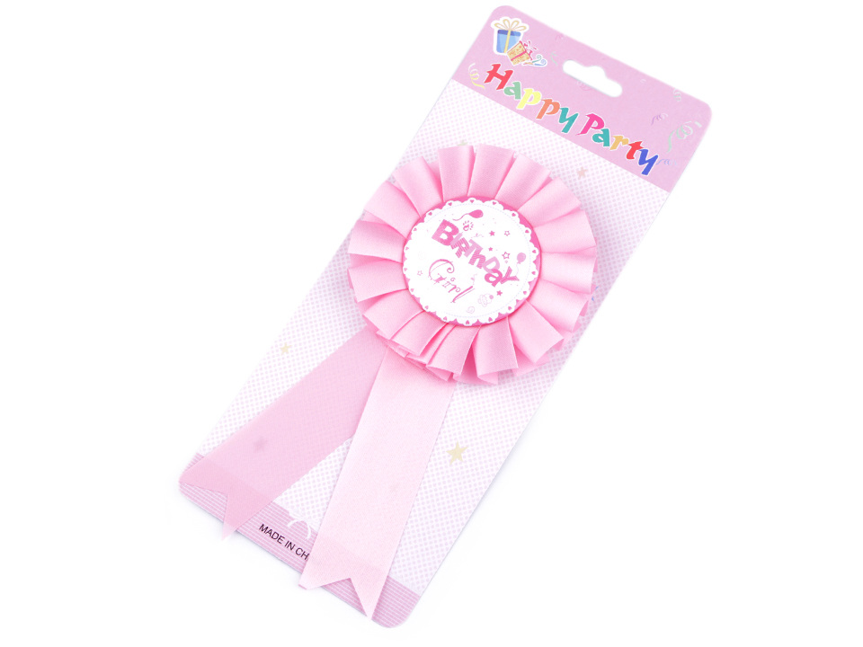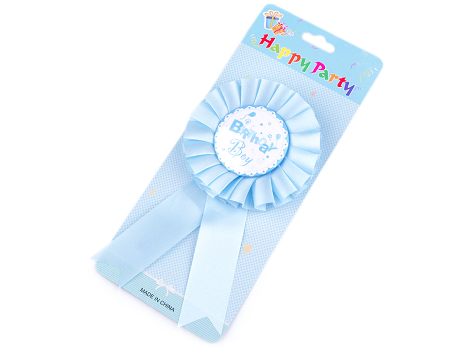 Párty brož je skvělým doplňkem na oslavu narozenin. Na zadní straně je špendlík, takže na oděvech dobře drží. Zdobí ji saténová stuha.