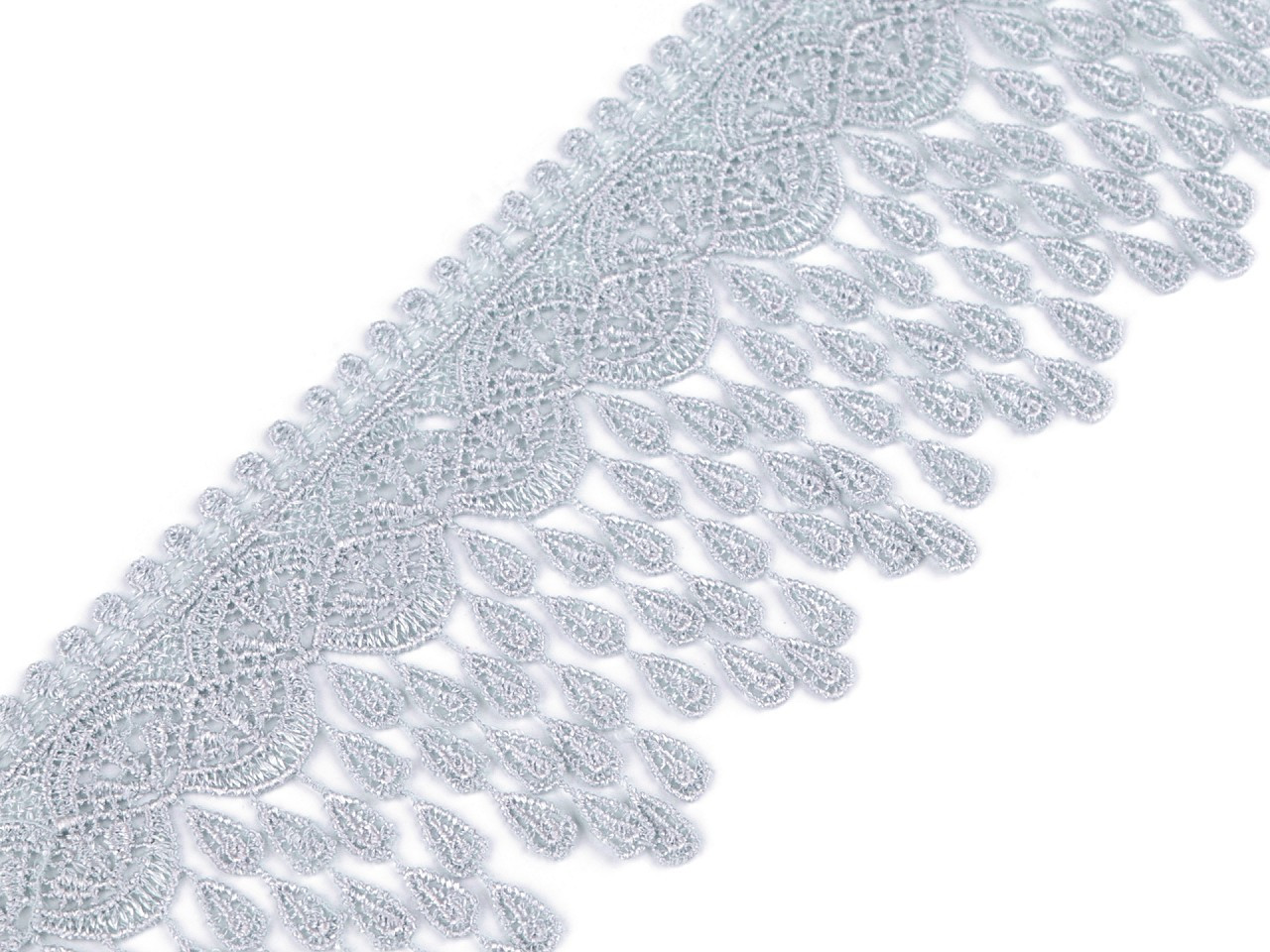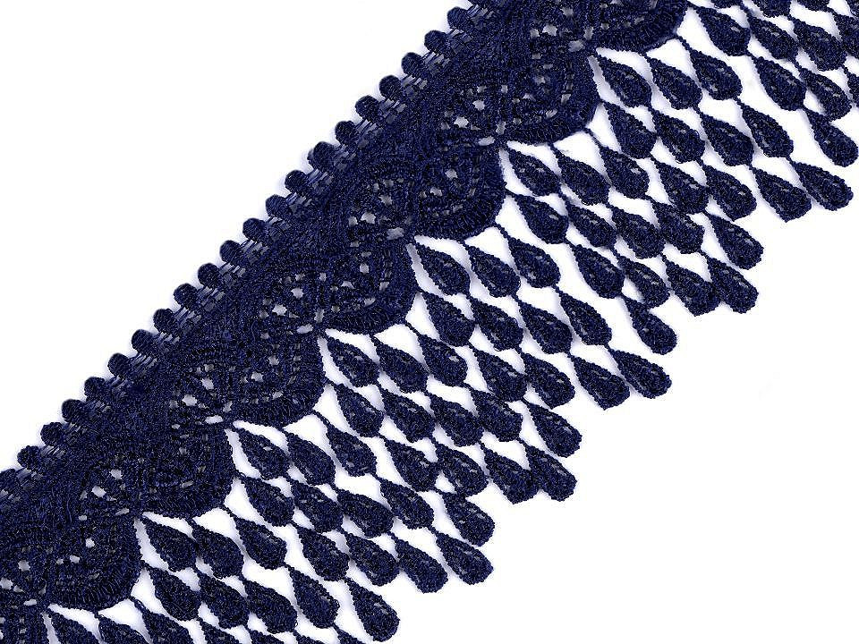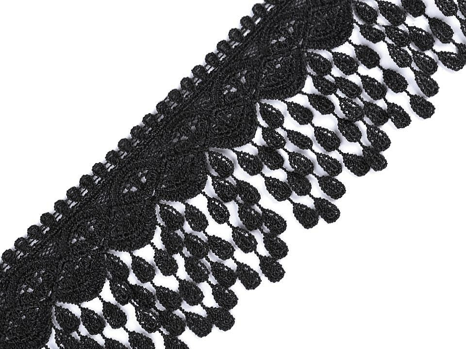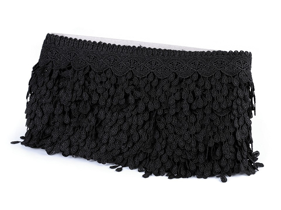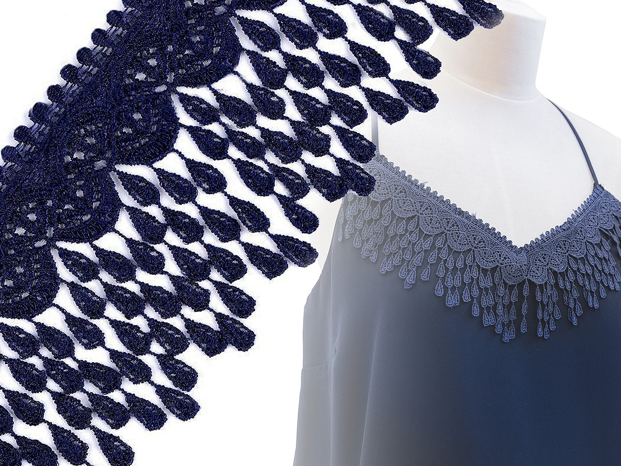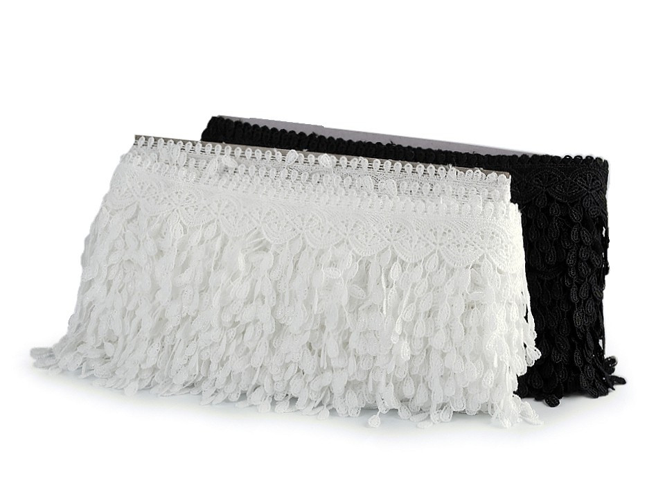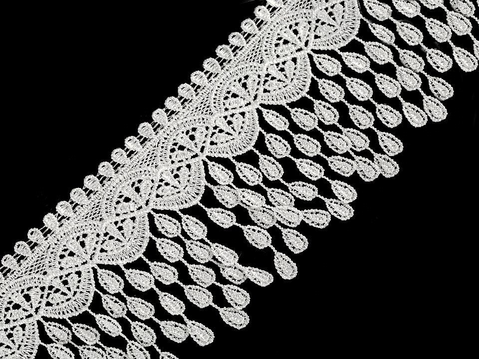 Vzdušná krajka s třásněmi, které připomínají kapky, ozdobí lemy každého oděvu. Můžete s ní zajímavě zkrášlit společenské šaty, halenky, sukně, saka apod. Je vhodná i na výrobu záclonek.