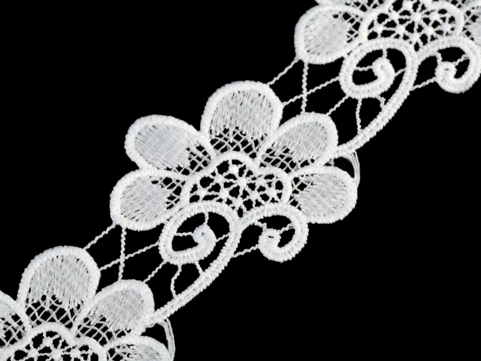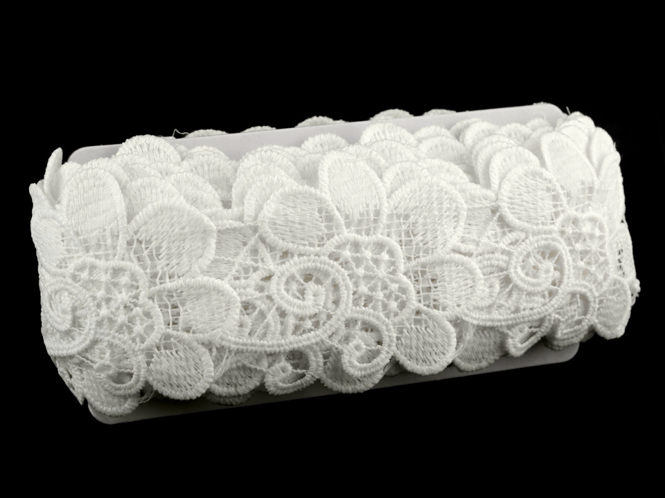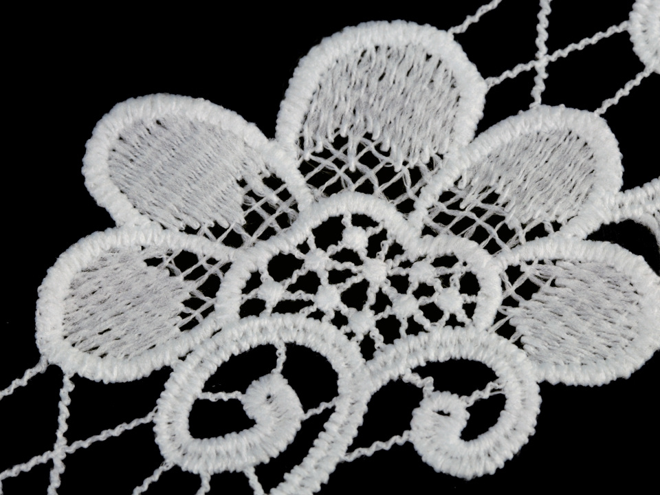 Vyšívaná krajka připomíná květy. Zajímavě ozdobí oděvy i doplňky, například běhouny, polštáře či tašky.