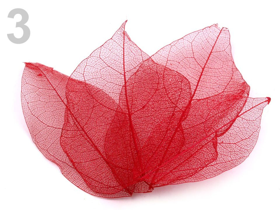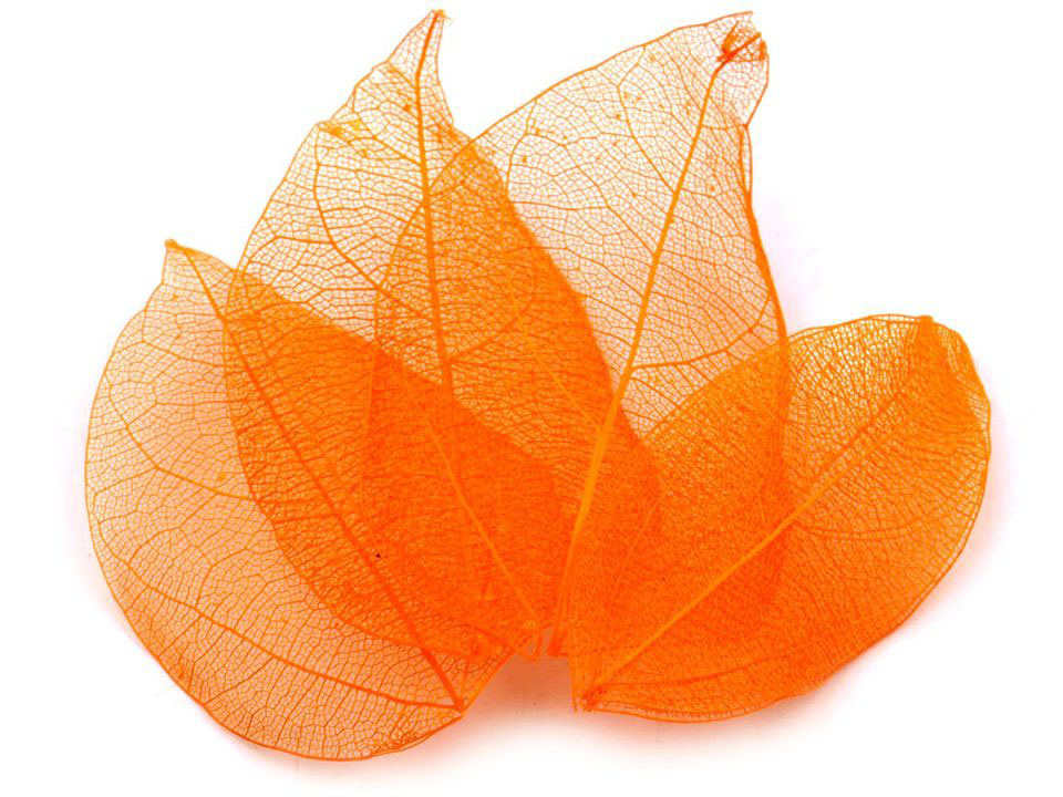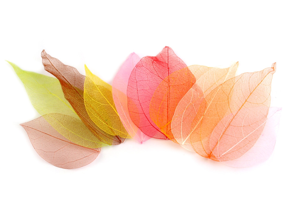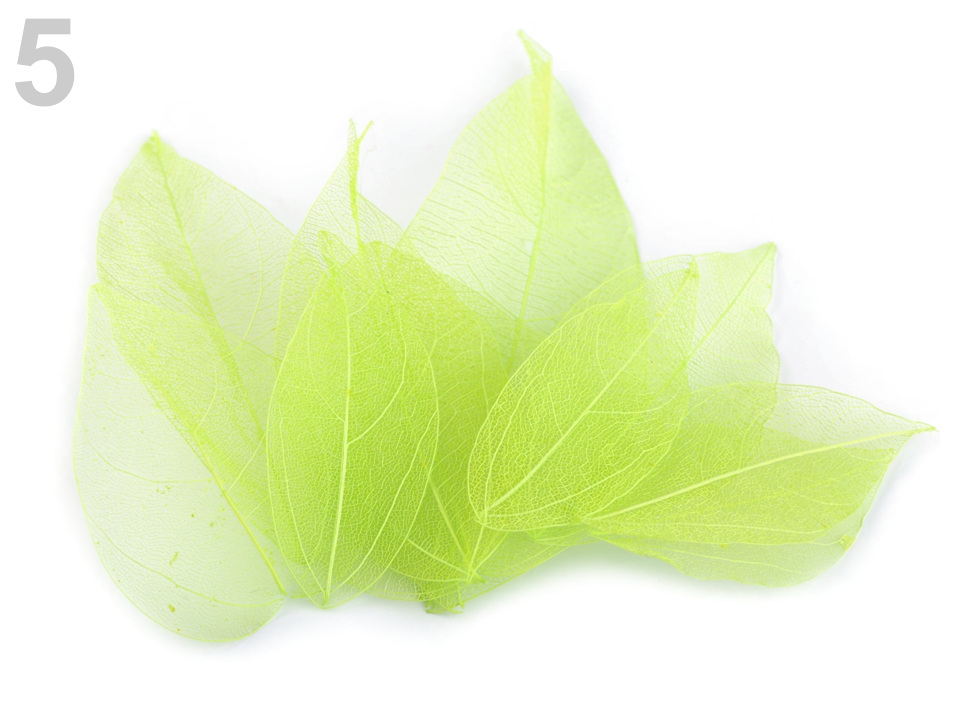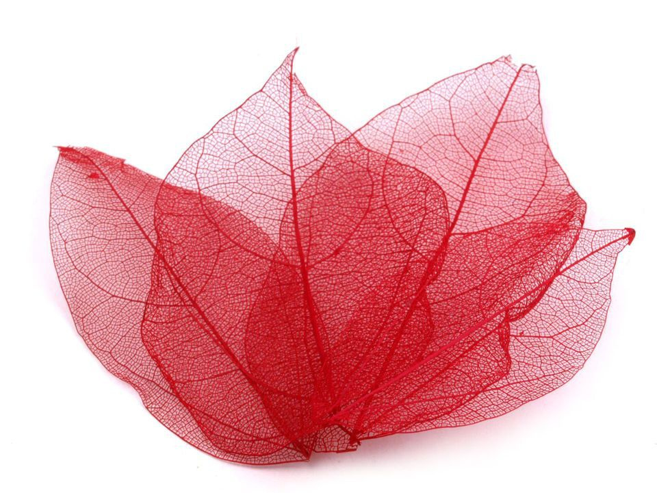 Listy jsou speciální technologií upravovány tak, aby vyniklo žilkování listu. Přestože jde o přírodní, relativně křehký materiál, síťovina je pevná a tuto dekoraci můžete bez obav lepit například tavicí pistolí. Rozměry jednotlivých listů se liší, šíře 2,5 - 3,5 cm, výška 4 - 8 cm. V jednom sáčku je 100 ks. List při styku s vodou barví.