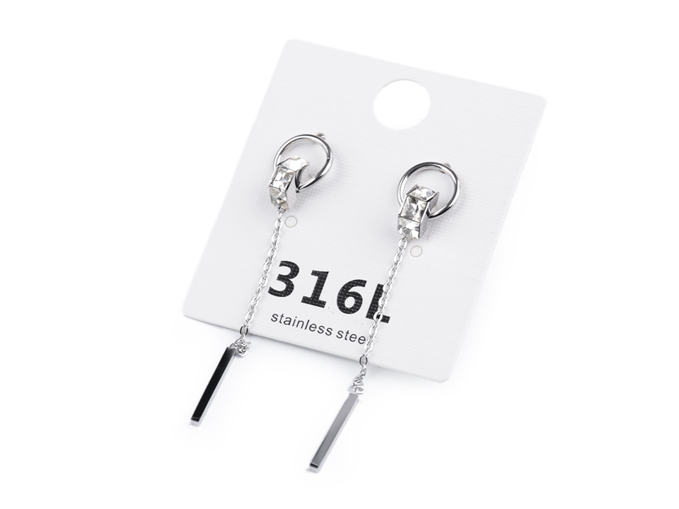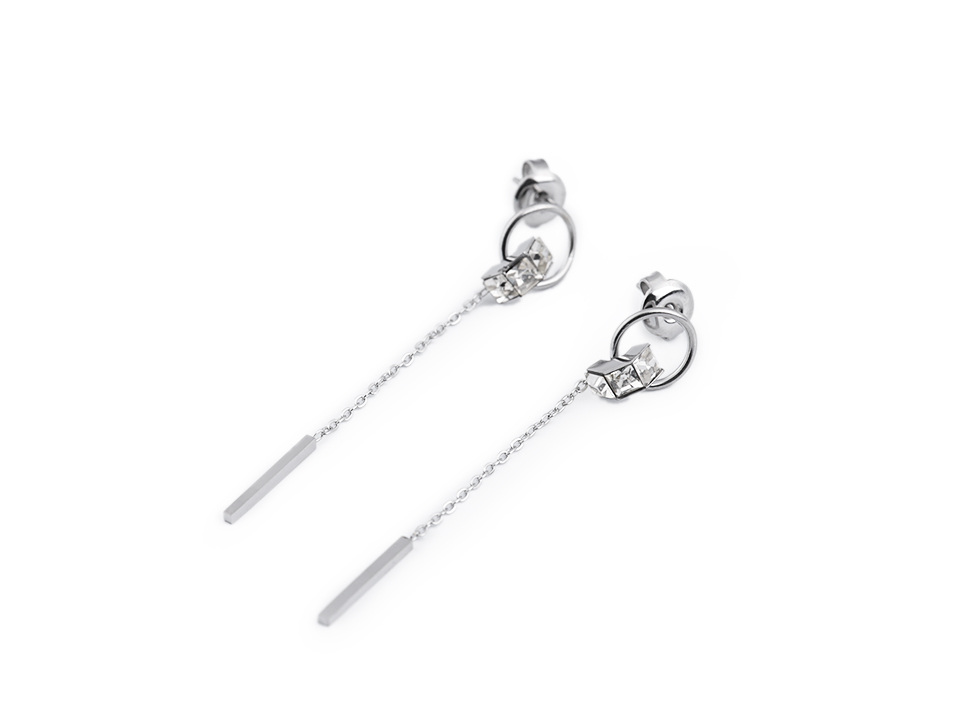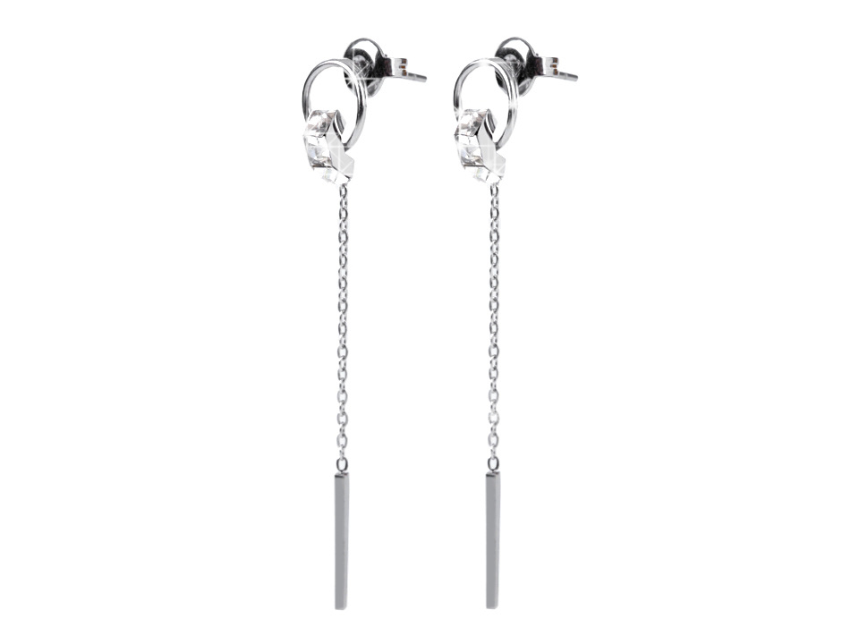 Efektní visací náušnice z kvalitní nerezové oceli protáhnou a zeštíhlí linii šíje. Působí velice mladistvě a žensky. Mají vysoký zrcadlový lesk, horní kroužky jsou ozdobené třpytivými broušenými kamínky.