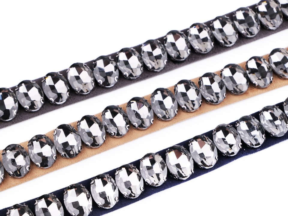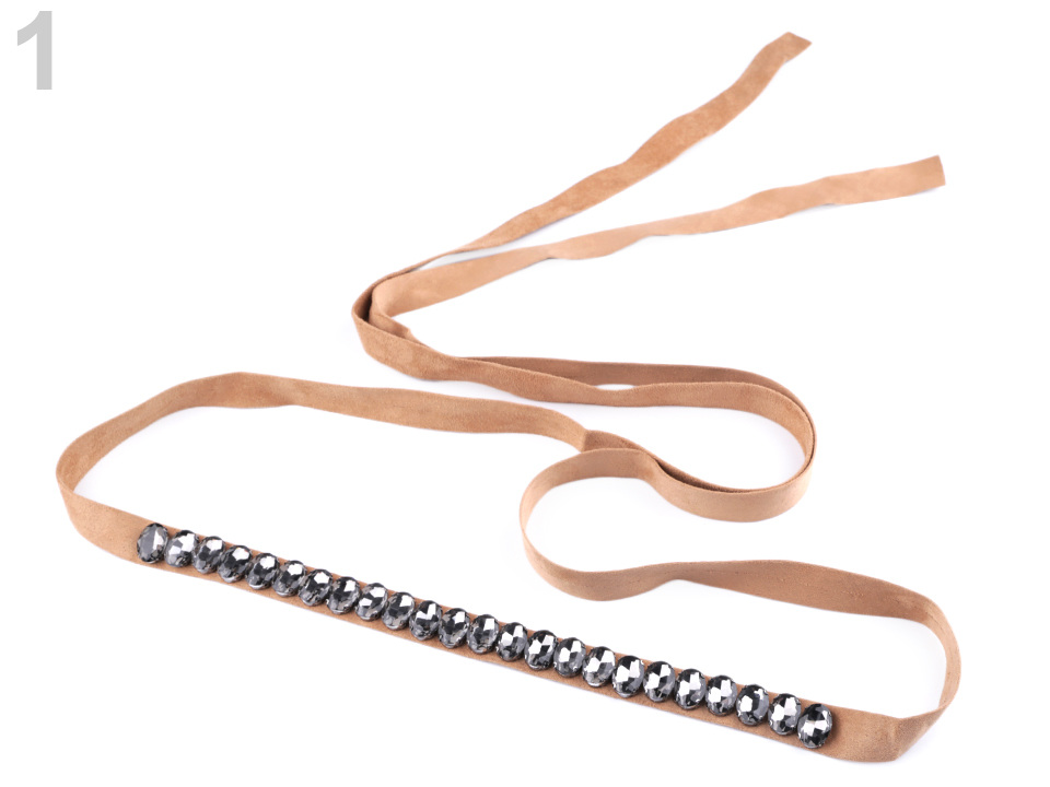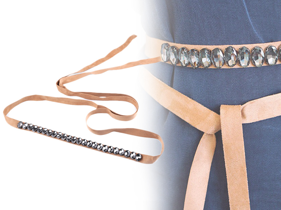Dámský semišový pásek s broušenými kameny je velice elegantní. Sedne každému typu postavy, dá se uvázat do pasu nebo přes boky na šaty. Skvěle dozdobí i dlouhé tuniky apod.