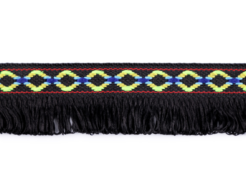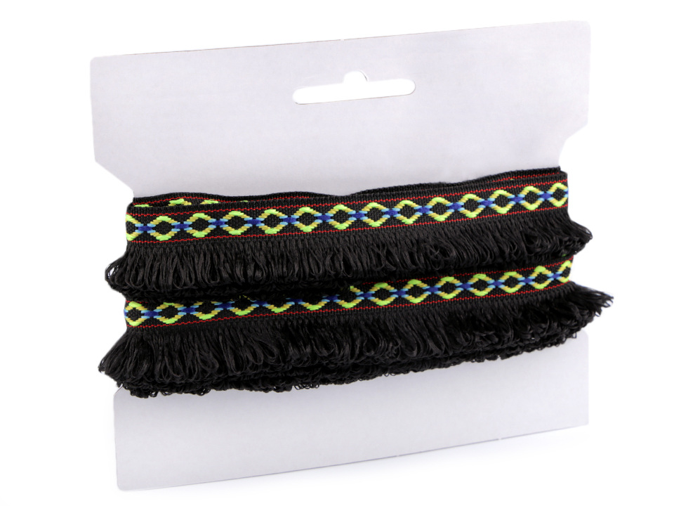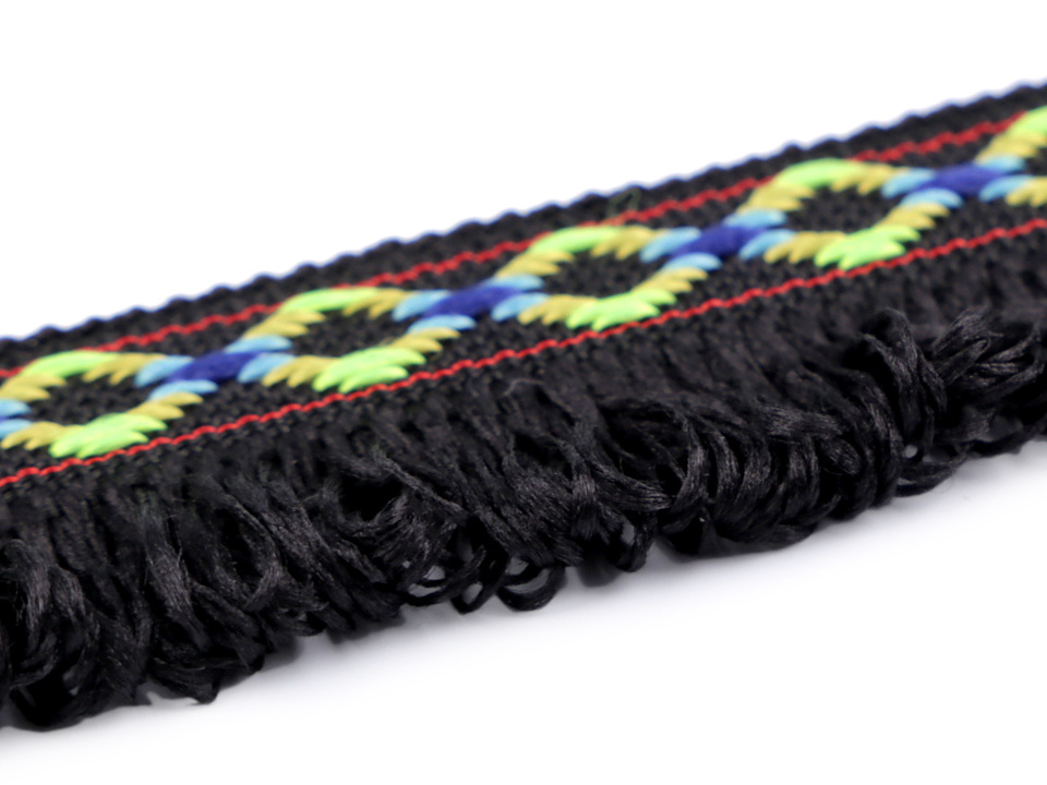 Indiánský prýmek s třásněmi využijete na ozdobení sandálů, kabelek, tašek, triček, tunik atd. Je vhodný také k olemování bytových doplňků (polštářů, ubrusů, prostírání). Třásně jsou dvojité, zakončené smyčkou.