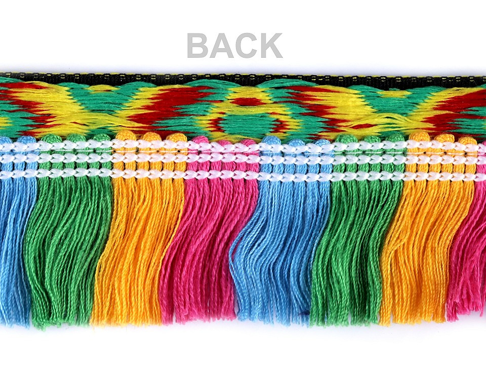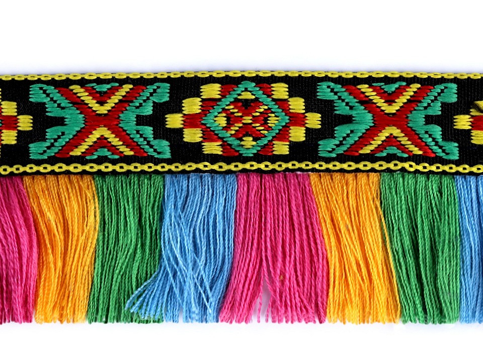 Indiánský prýmek s třásněmi dodá neokoukaný vzhled halenkám, tunikám, tričkům, kraťasům, šatům i sukním. Je vhodný také k ozdobení sandálů nebo tašek.