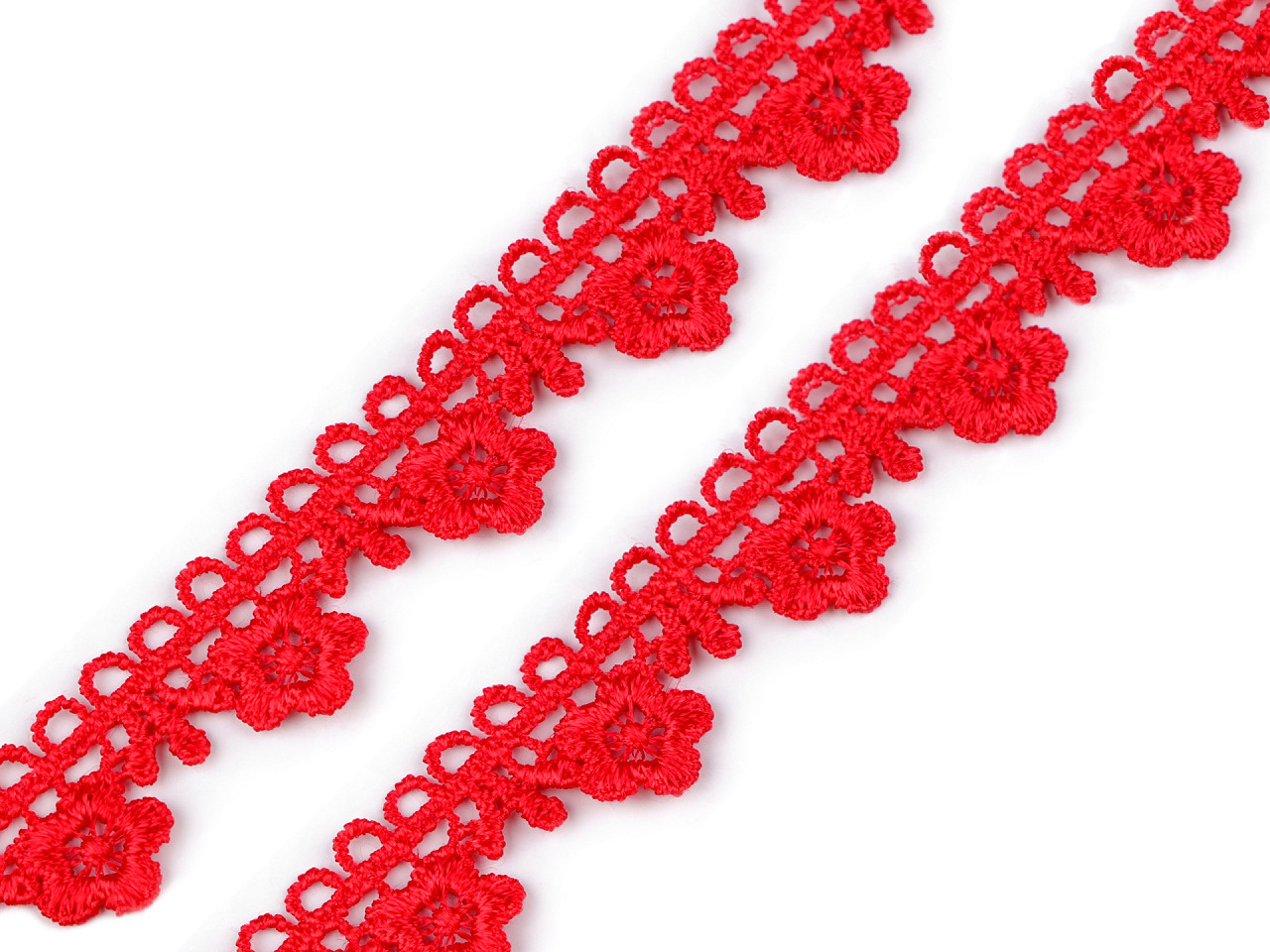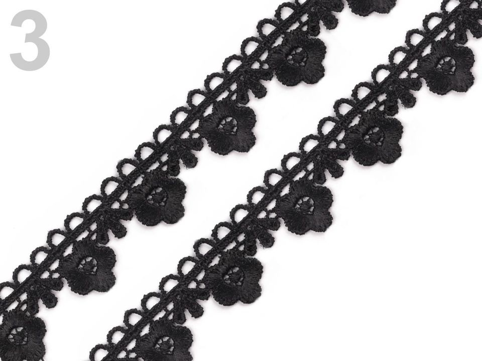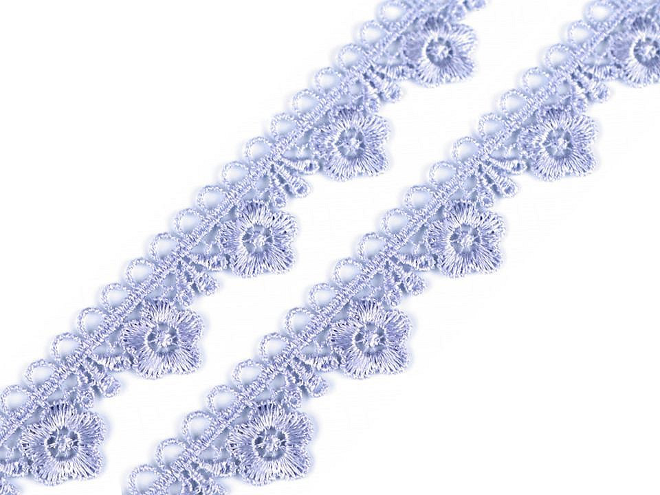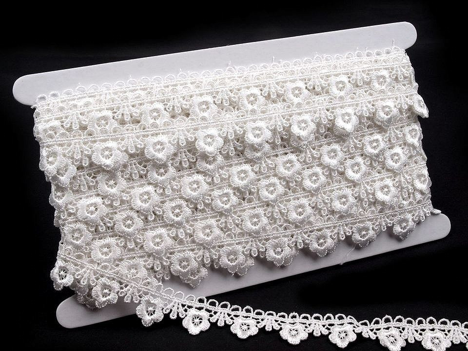 Krajka o šíři 21 mm zobrazuje květiny. Má široké uplatnění. Nejčastěji se používá k olemování ubrusů, deček a oděvů. Může být však použita jako dekorace na přání k narozeninám nebo na svatební oznámení. Návin 13 m.Složení: 76% viskóza 24% bavlna