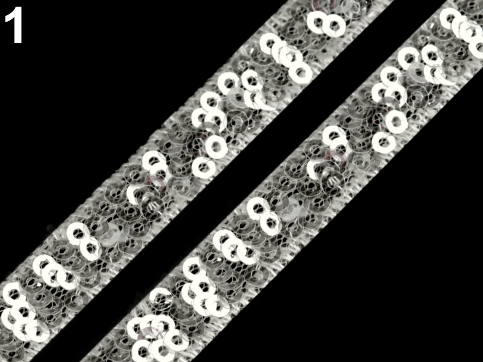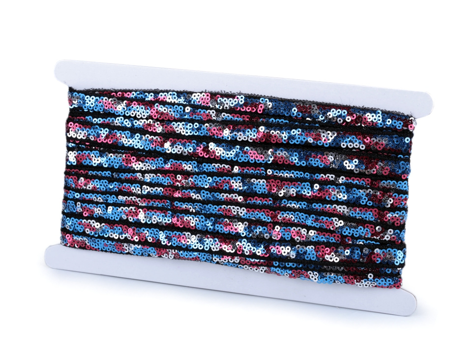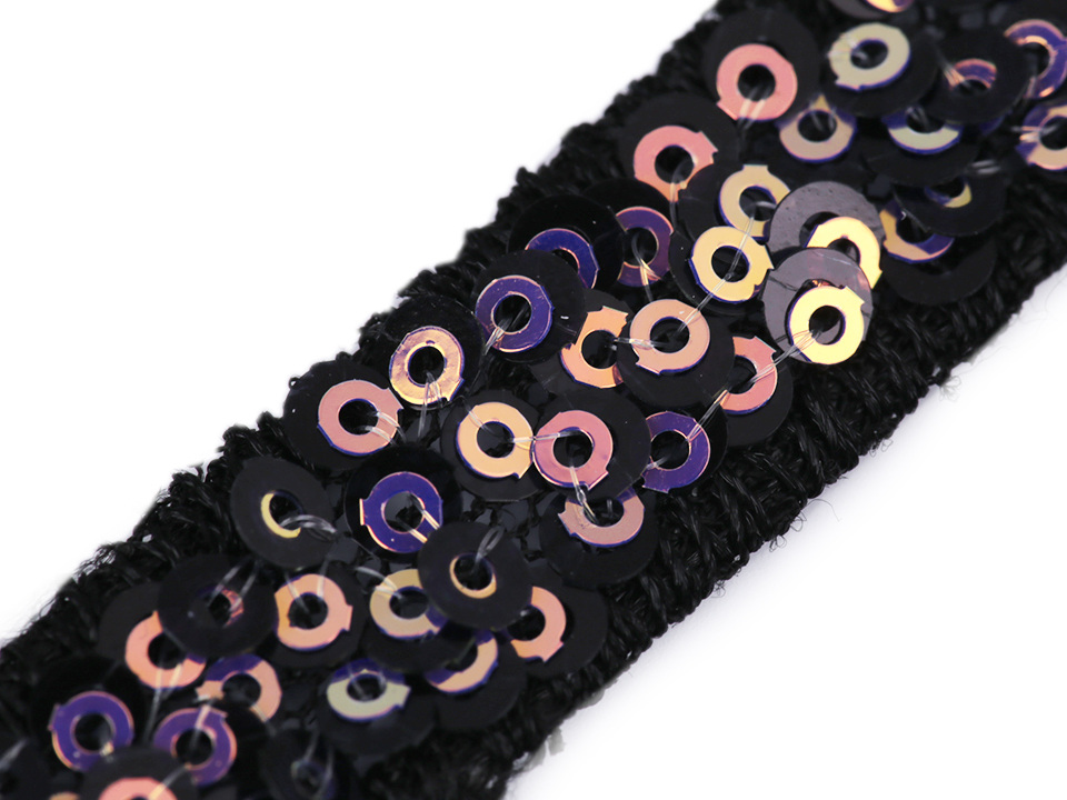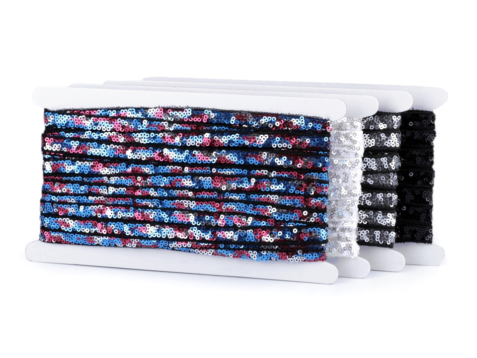 Flitrový prýmek vyniká svým efektním třpytem. Drobné flitry jsou našité na monofilu.