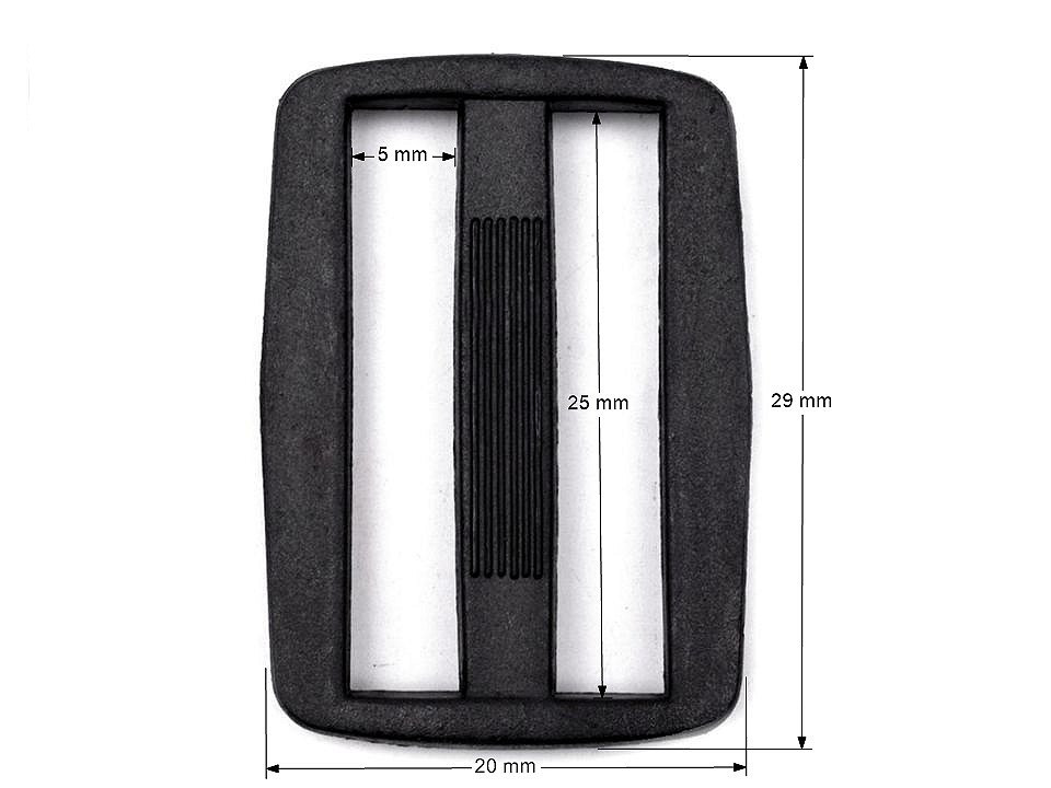 Průvlek se využívá jako spona, kterou je možné upravit délku popruhu. Lze jej použít na kabelky, ledvinky, batohy, atd. Je celoplastový obdélníkového tvaru. Vnitřní rozměry: délka 25 mm, šíře 5 mm. Vnější rozměry: délka 29 mm, šíře 20 mm. Viz foto.Složení: 100% plast