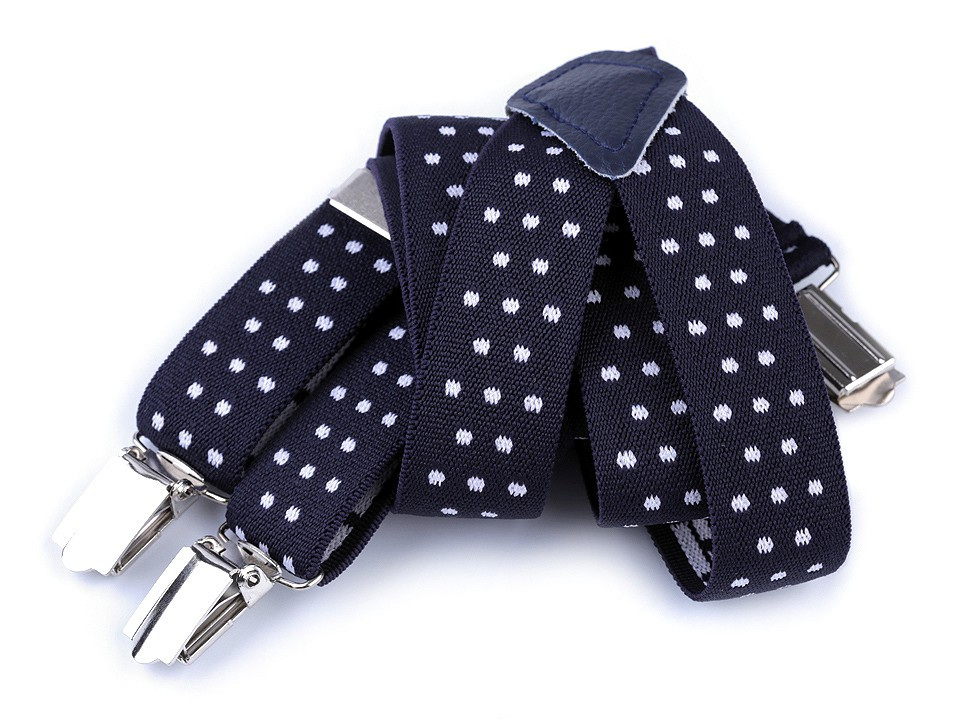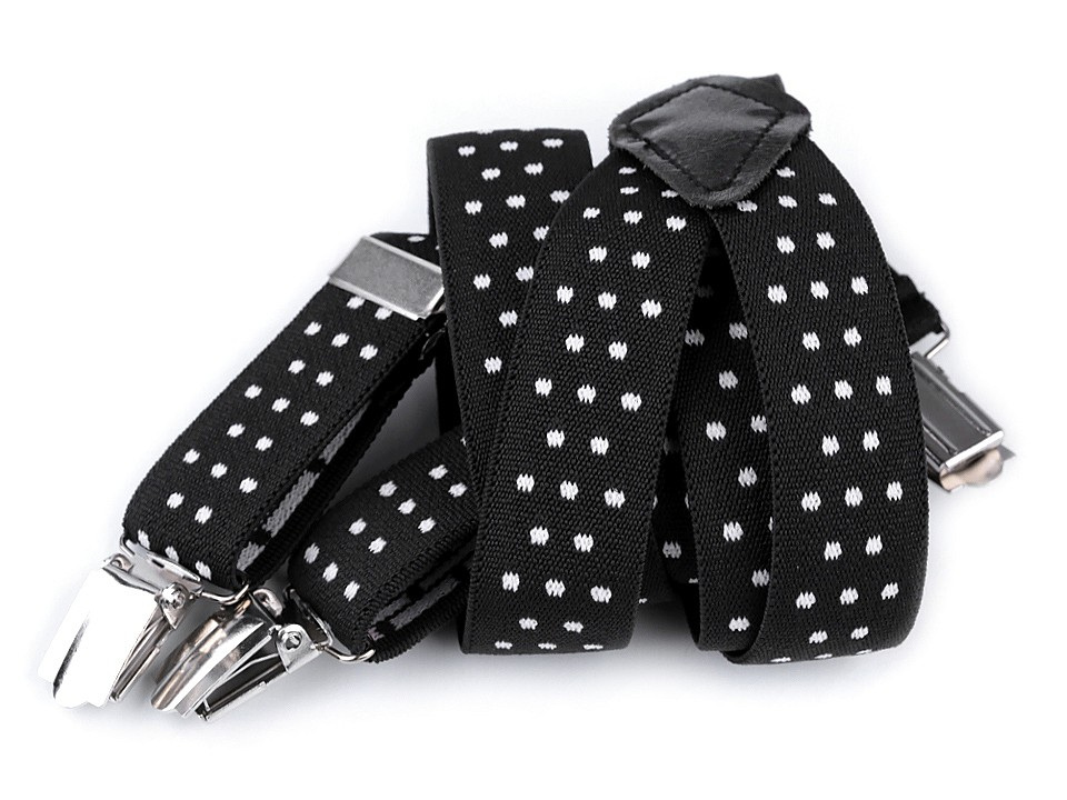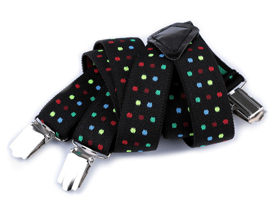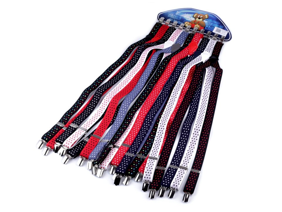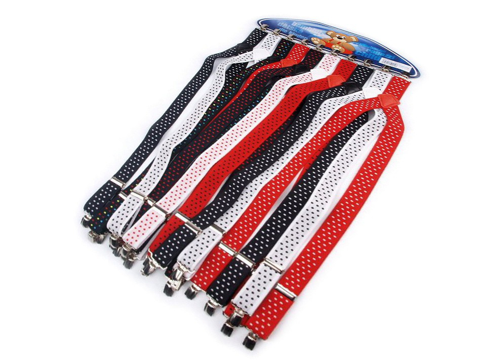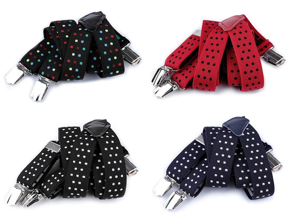 Dětské puntíkované šle jsou vhodné pro děvčata i kluky. Jde o kvalitní tkaný český výrobek. Ke kalhotám či sukni se připevňují pomocí kovových žabek - dvě vpředu a jedna vzadu.