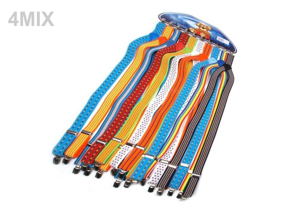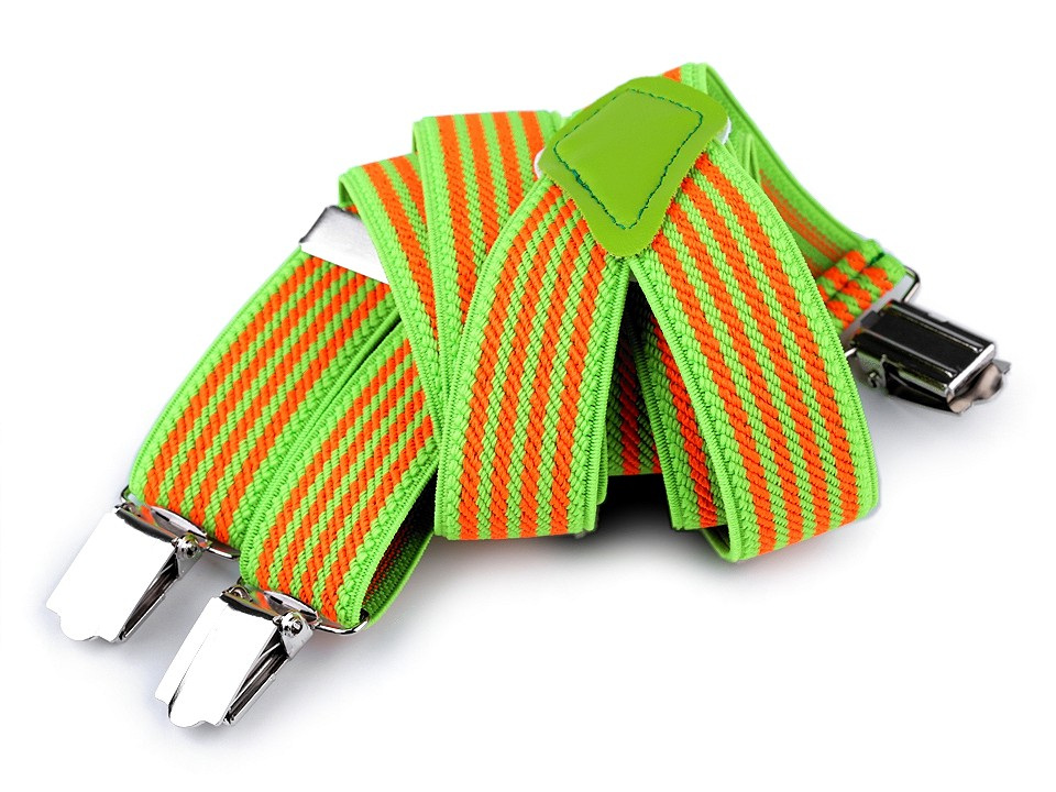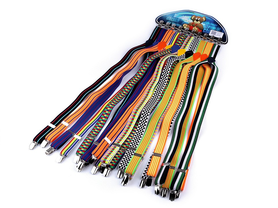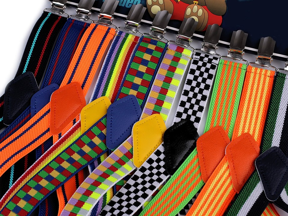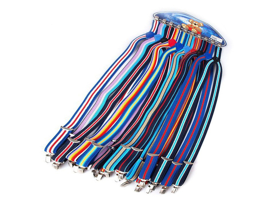 Dětské barevné šle se hodí pro kluky i děvčata. Jde o kvalitní tkaný český výrobek. Ke kalhotám či sukni se připevňují pomocí kovových žabek - dvě vpředu a jedna vzadu.