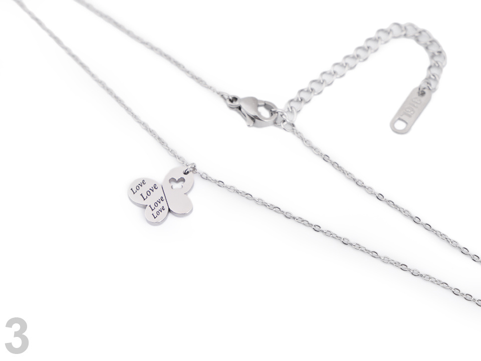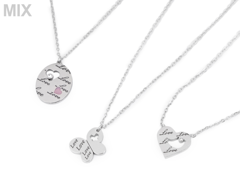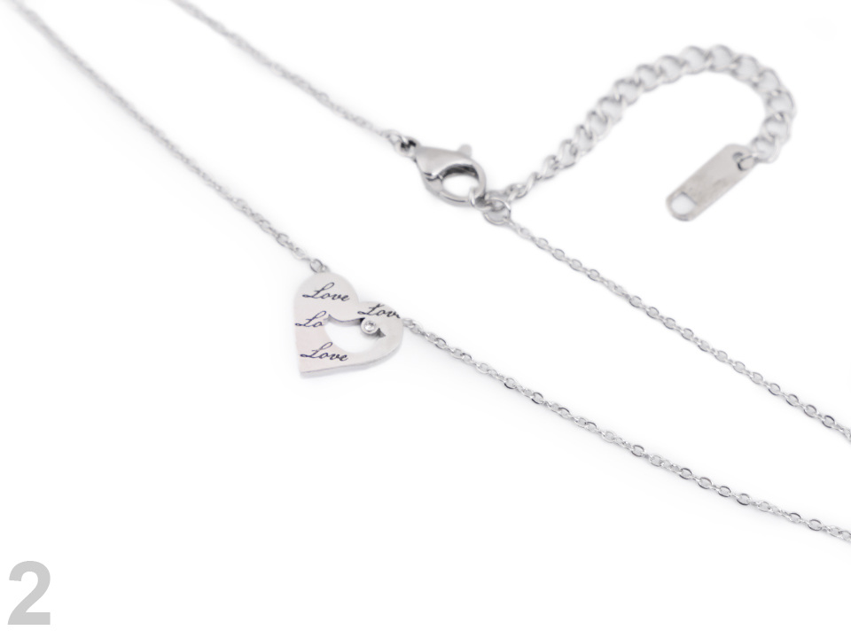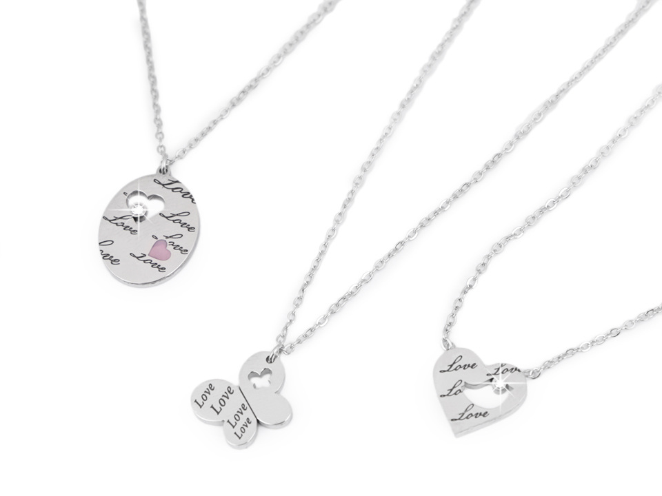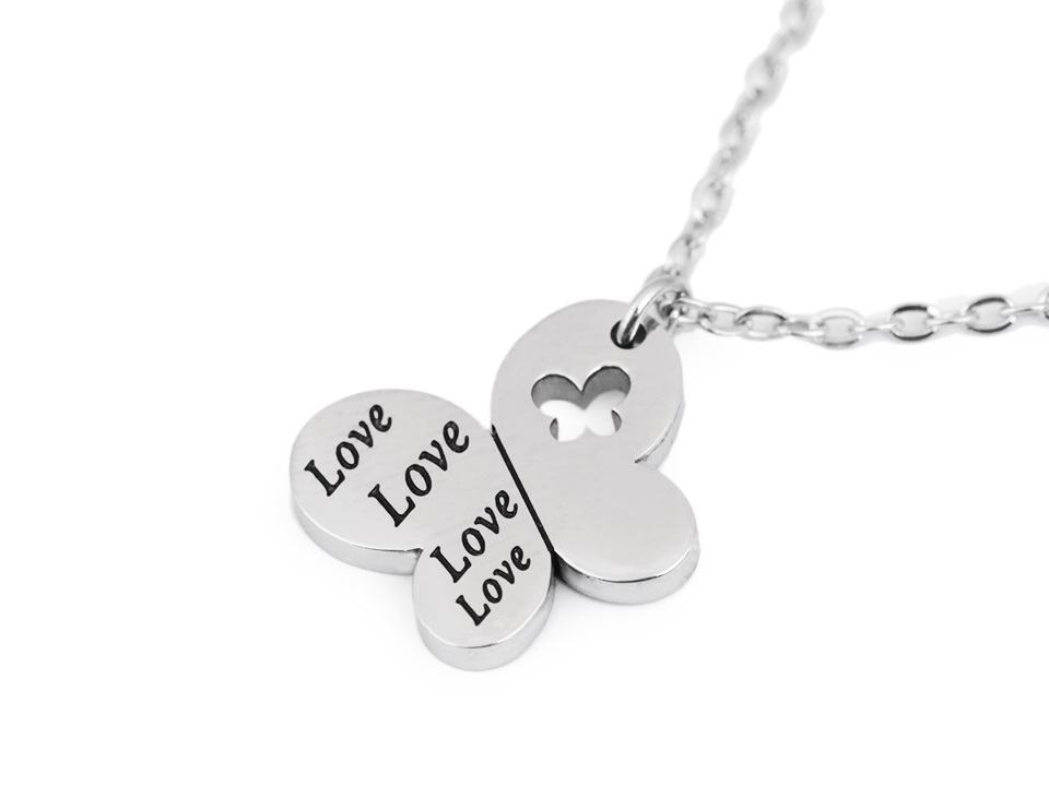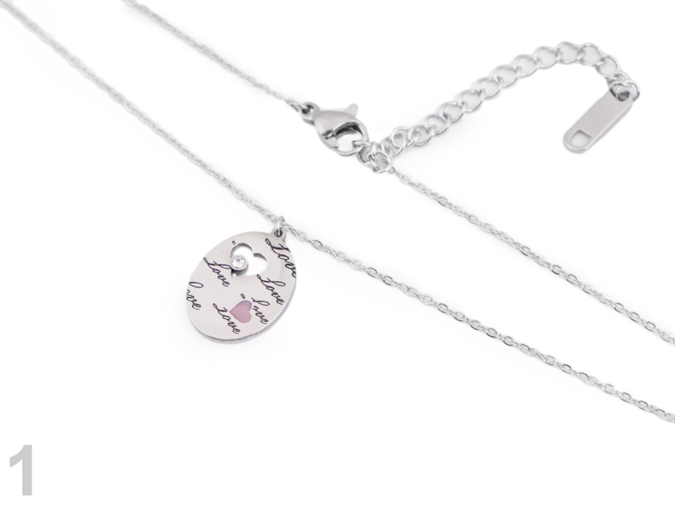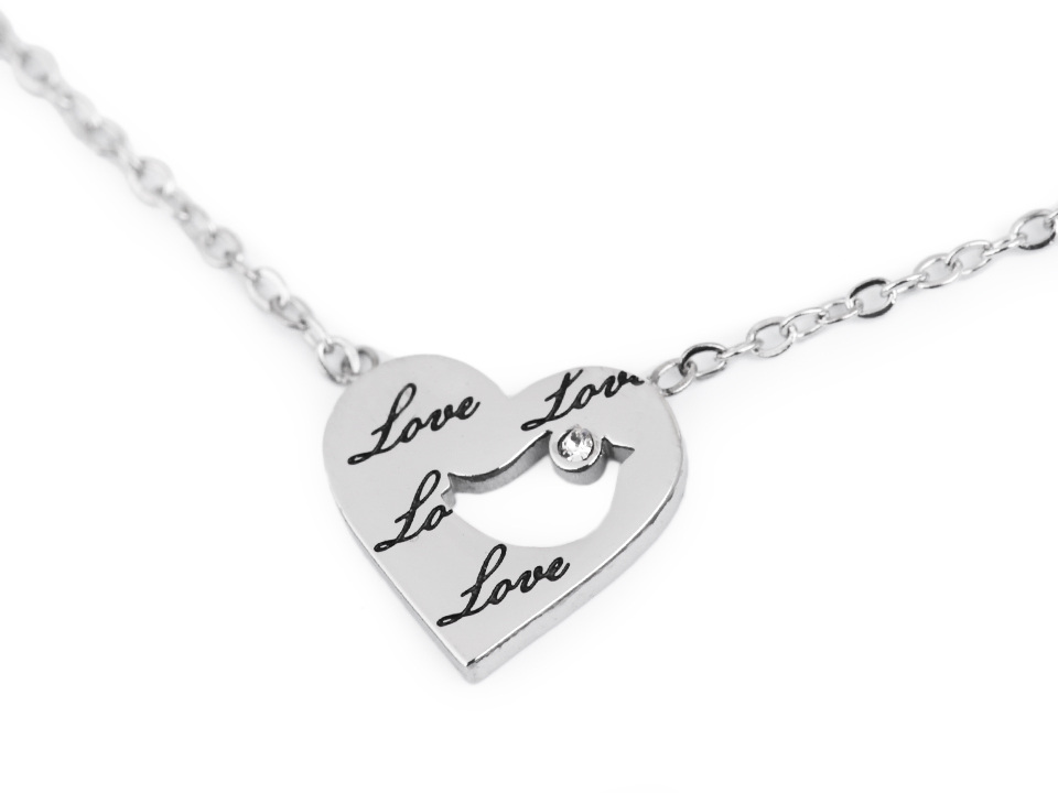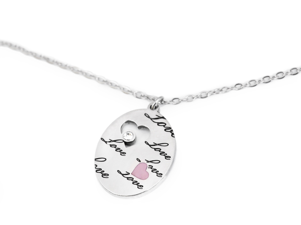 Náhrdelník z nerezové oceli zdobí přívěsek s gravírovanými nápisy "Love". Působí jemně a doladí jakýkoli outfit.