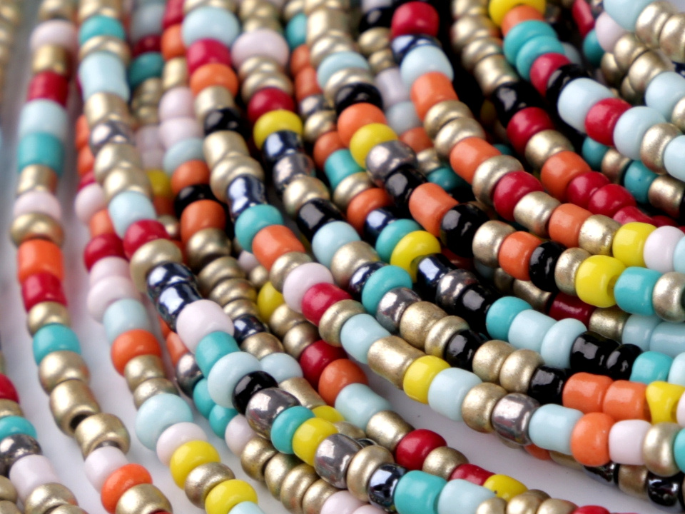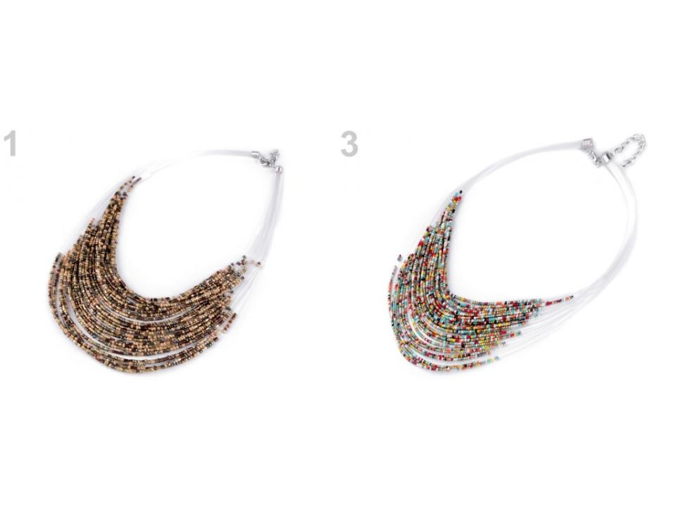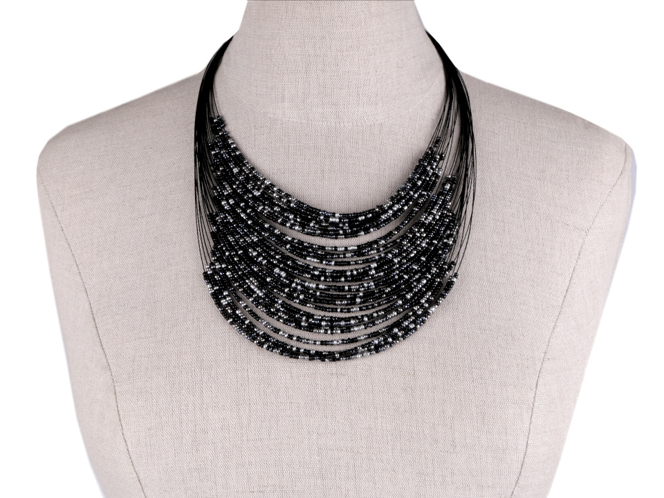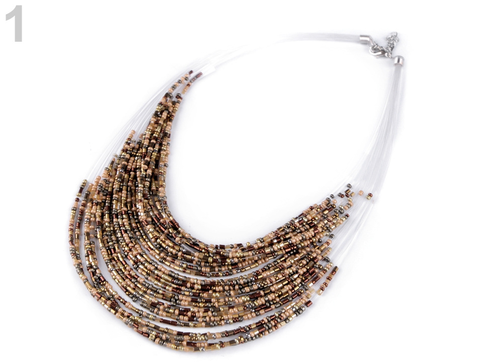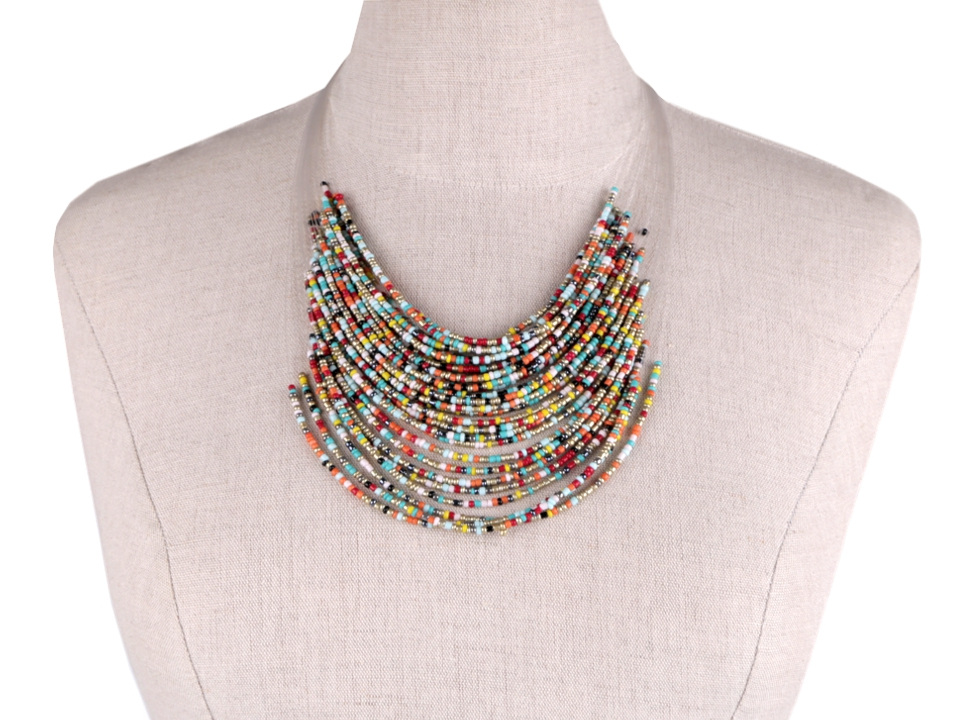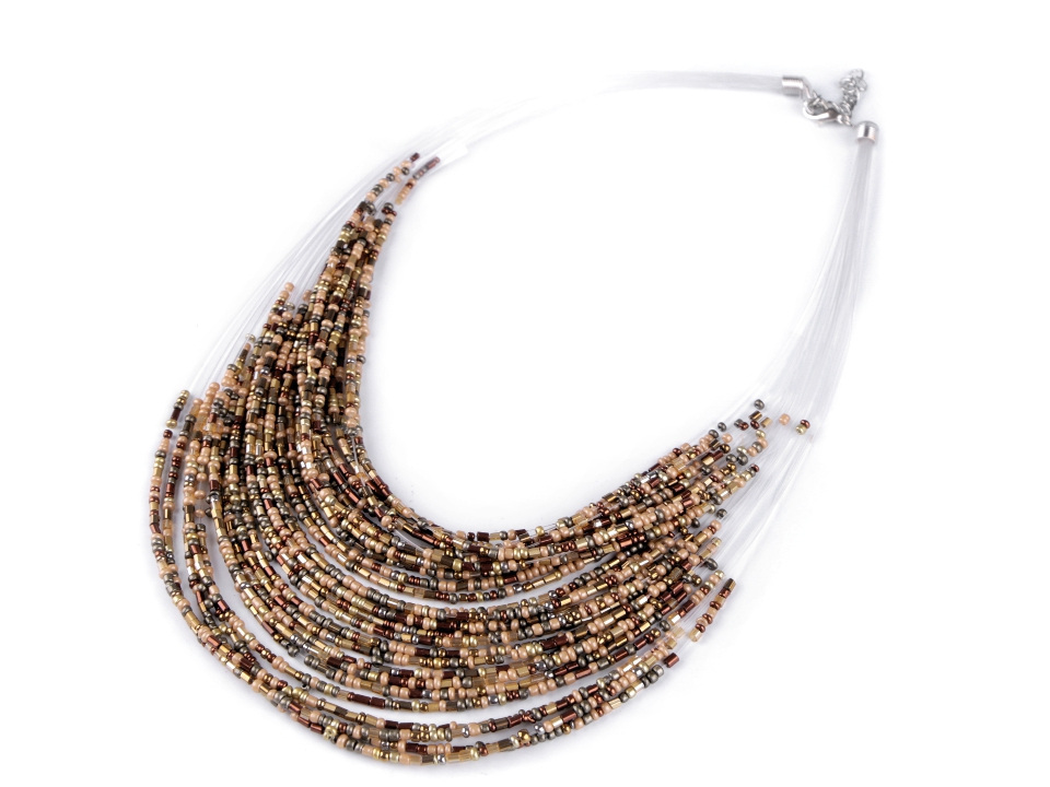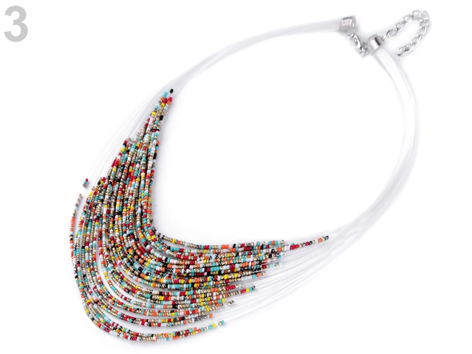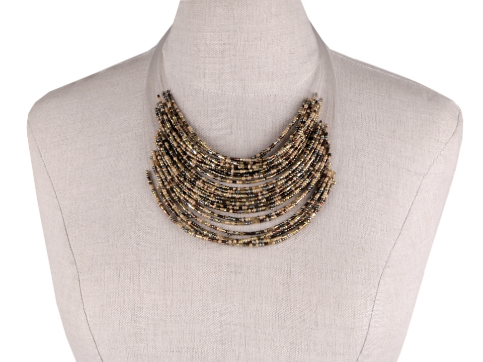Víceřadý náhrdelník z rokajlu je velice efektní. Působí bohatým dojmem, je z 32 řad rokajlu. Hodí se ke slavnostním přiležitostem jako jsou plesy, večírky, party apod. Skvěle osvěží i letní šaty a halenky. Rokajl má pestrou, sladěnou směs zkombinovanou s metalickými odstíny. Díky nim náhrdelník upoutá na první pohled. Zapíná se na karabinku a prodlužovací řetízek.