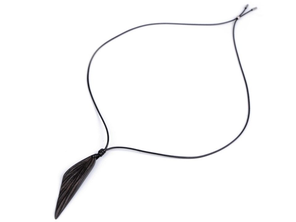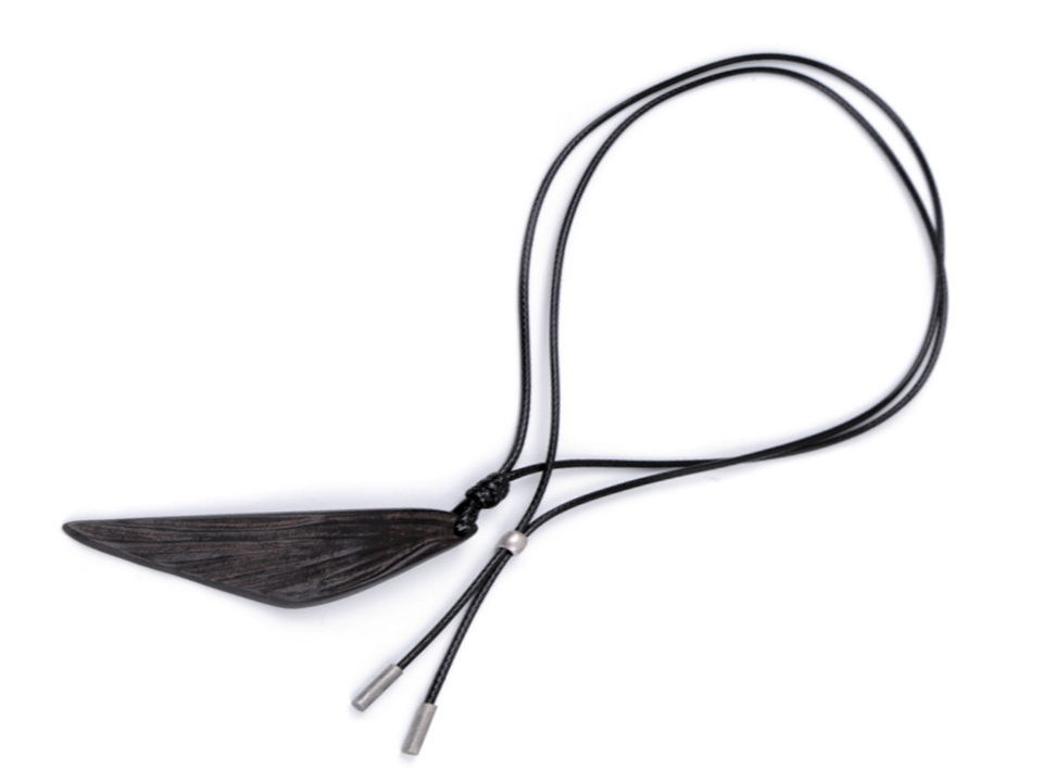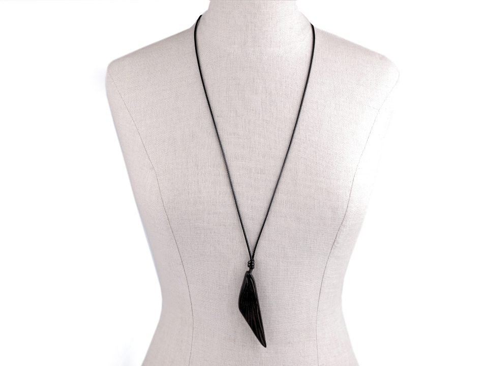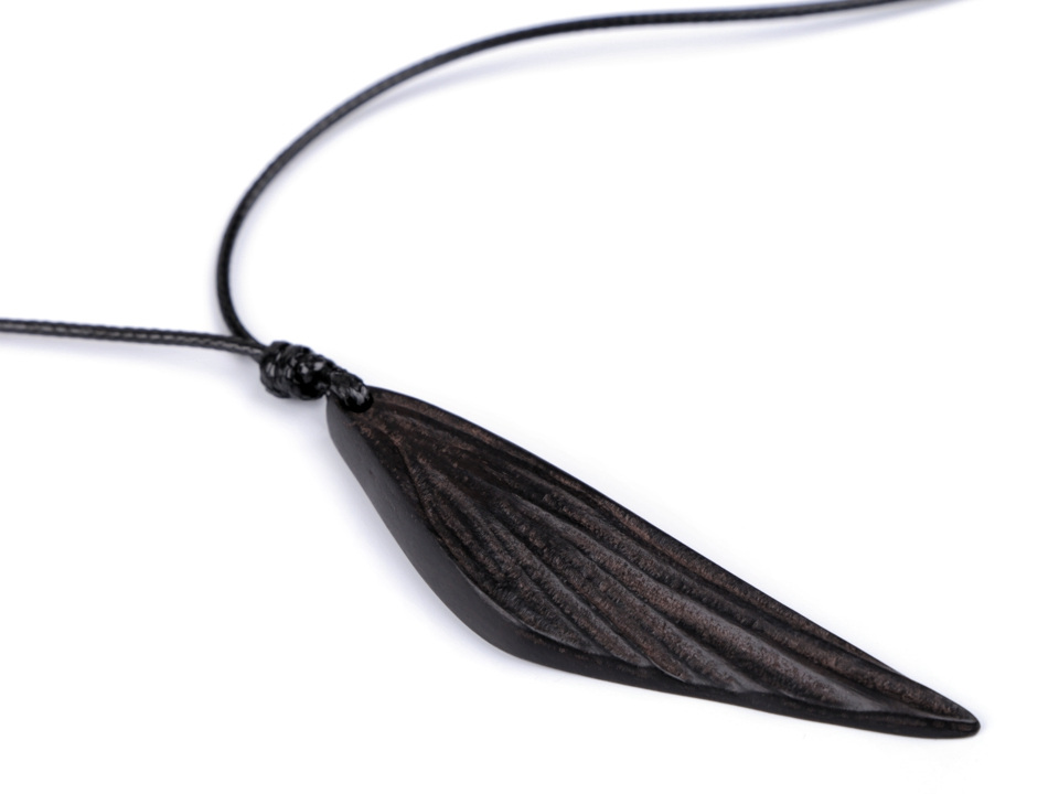 Designový náhrdelník zaujme pozornost svým přívěskem ve tvaru křídla. Přívěsek je ručně vyřezávaný z tropického dřeva. Náhrdelník nemá zapínání, ale jeho délku si můžete upravit pomocí stahovacího korálku.