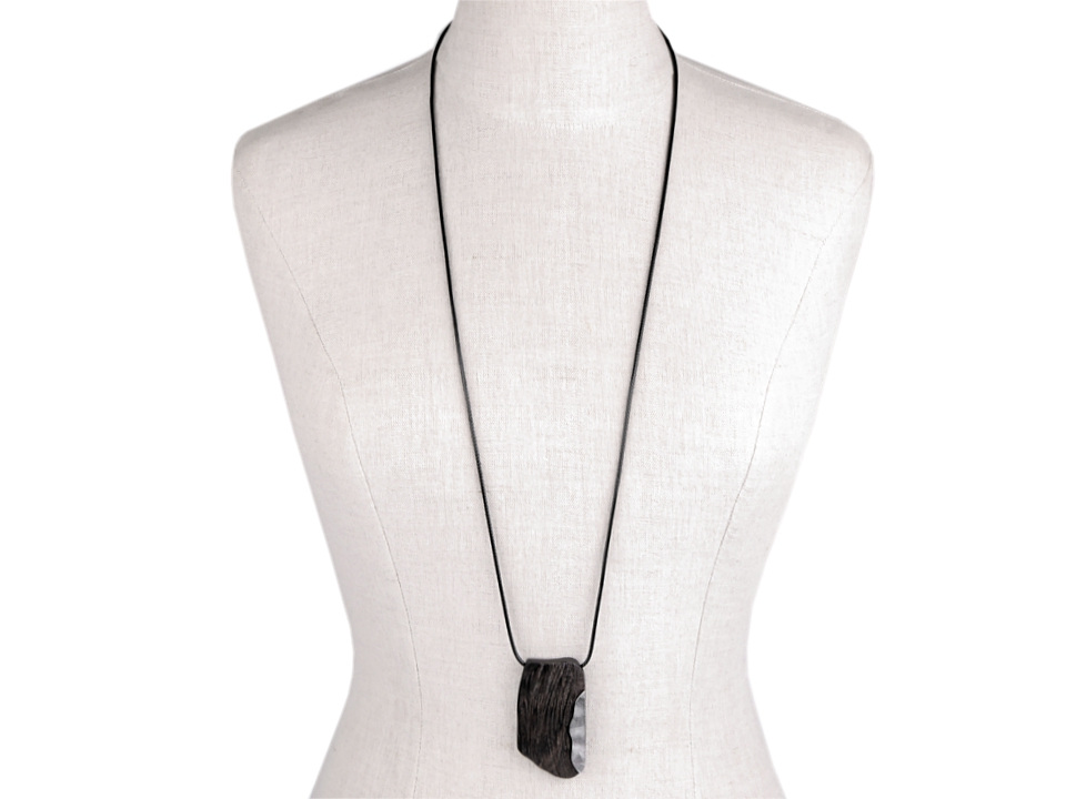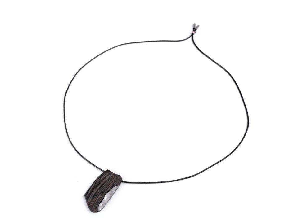Náhrdelník vyniká designovým přívěskem, který kombinuje dřevo a kov. Přívěsek je ručně vyřezávaný z tropického dřeva. Náhrdelník nemá zapínání, ale jeho délku si můžete upravit pomocí stahovacího korálku.