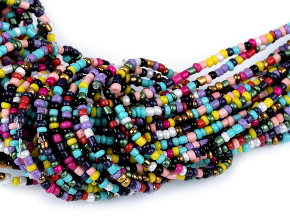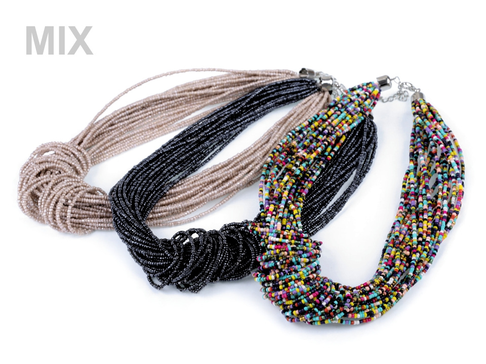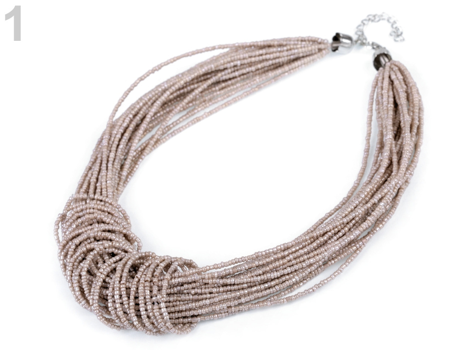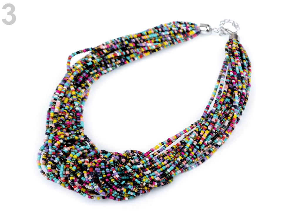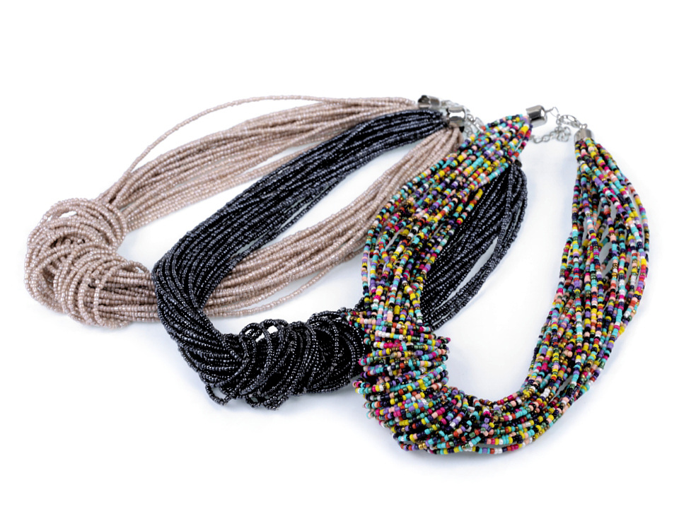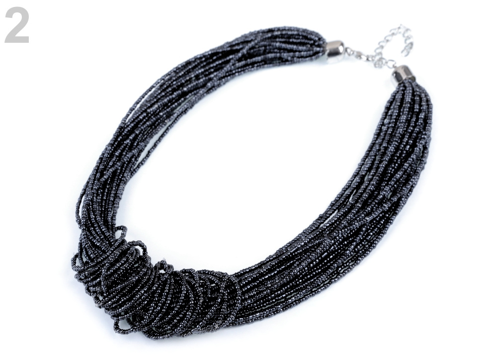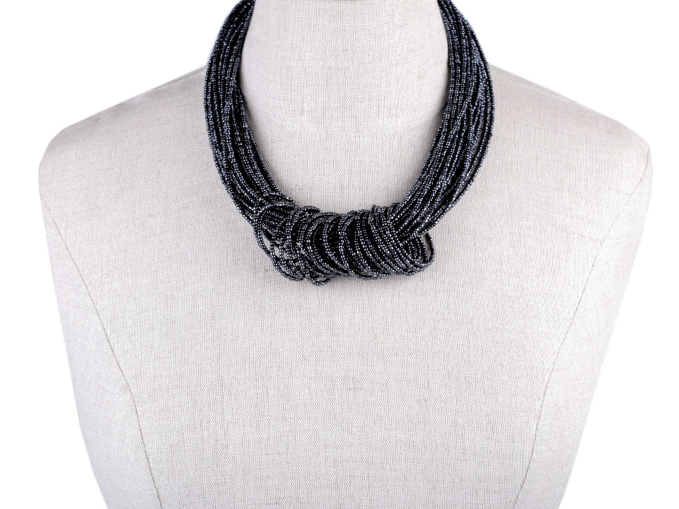 Víceřadý náhrdelník z rokajlu má uprostřed ozdobu z rokajlových kroužků, které připomínají uzel. Je vhodný ke slavnostním příležitostem jako jsou plesy, večírky, party apod. Působí bohatým dojmem, je z 25 řad rokajlu.